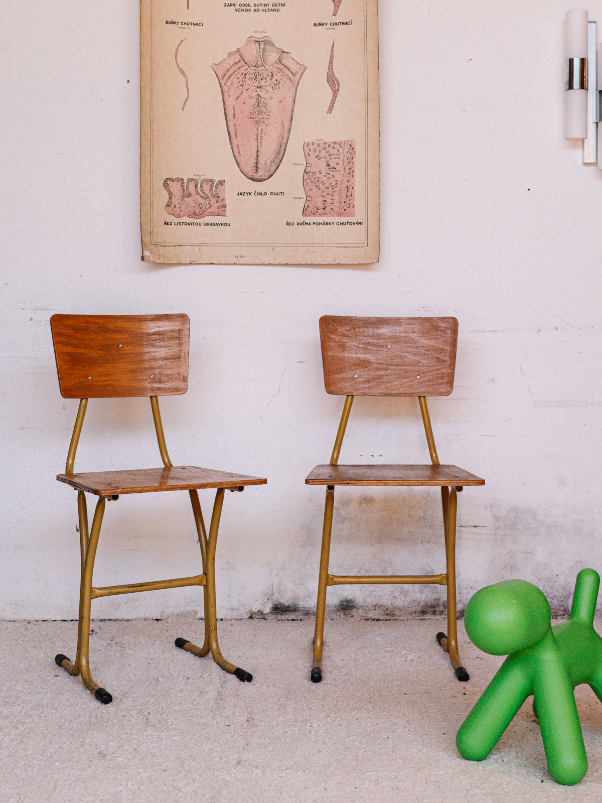 Adoptez cette chaise d'écolier des années 60 en bois et métal, au design sobre et fonctionnel qui s'intègre facilement à un bureau contemporain ou à une table d'appoint. Sa structure compacte et son assise à hauteur standard offrent une assise stable et confortable, tandis que les pieds munis de patins en caoutchouc protègent les sols. La patine du bois et les marques d'usage apportent une touche vintage chaleureuse. Légères traces du temps présentes.