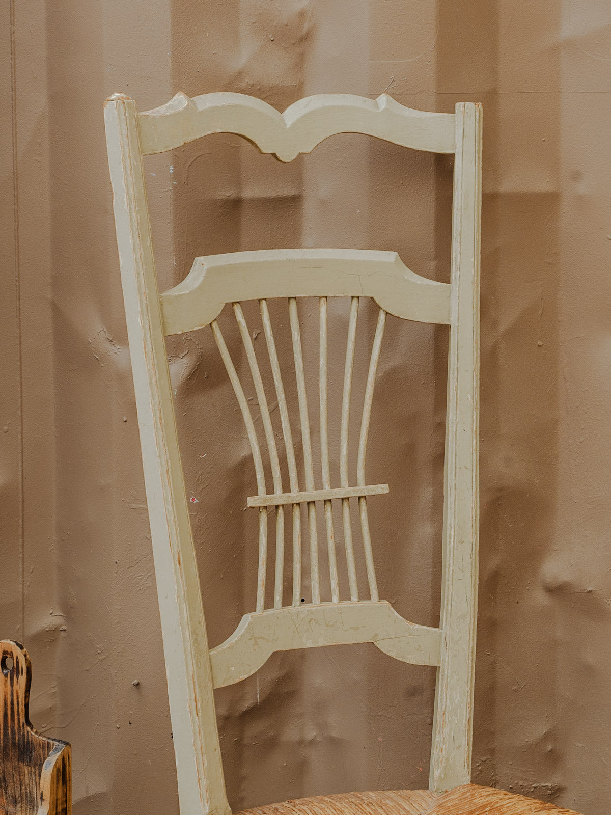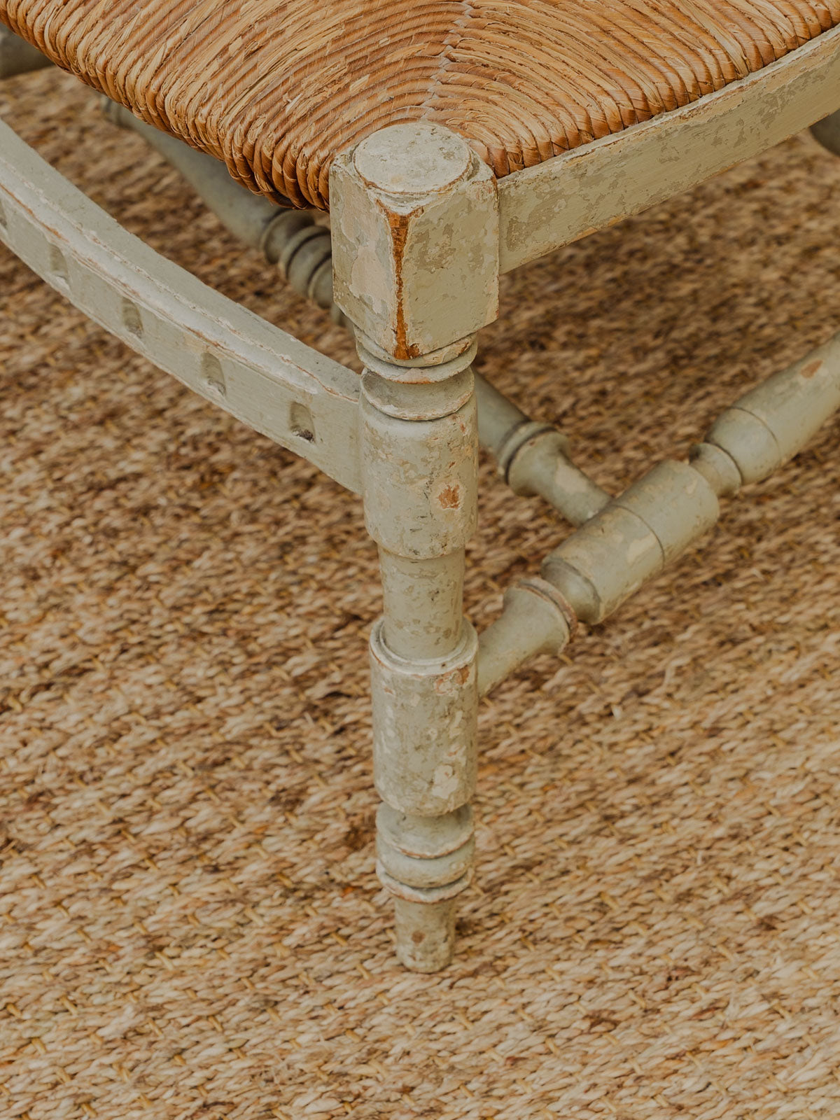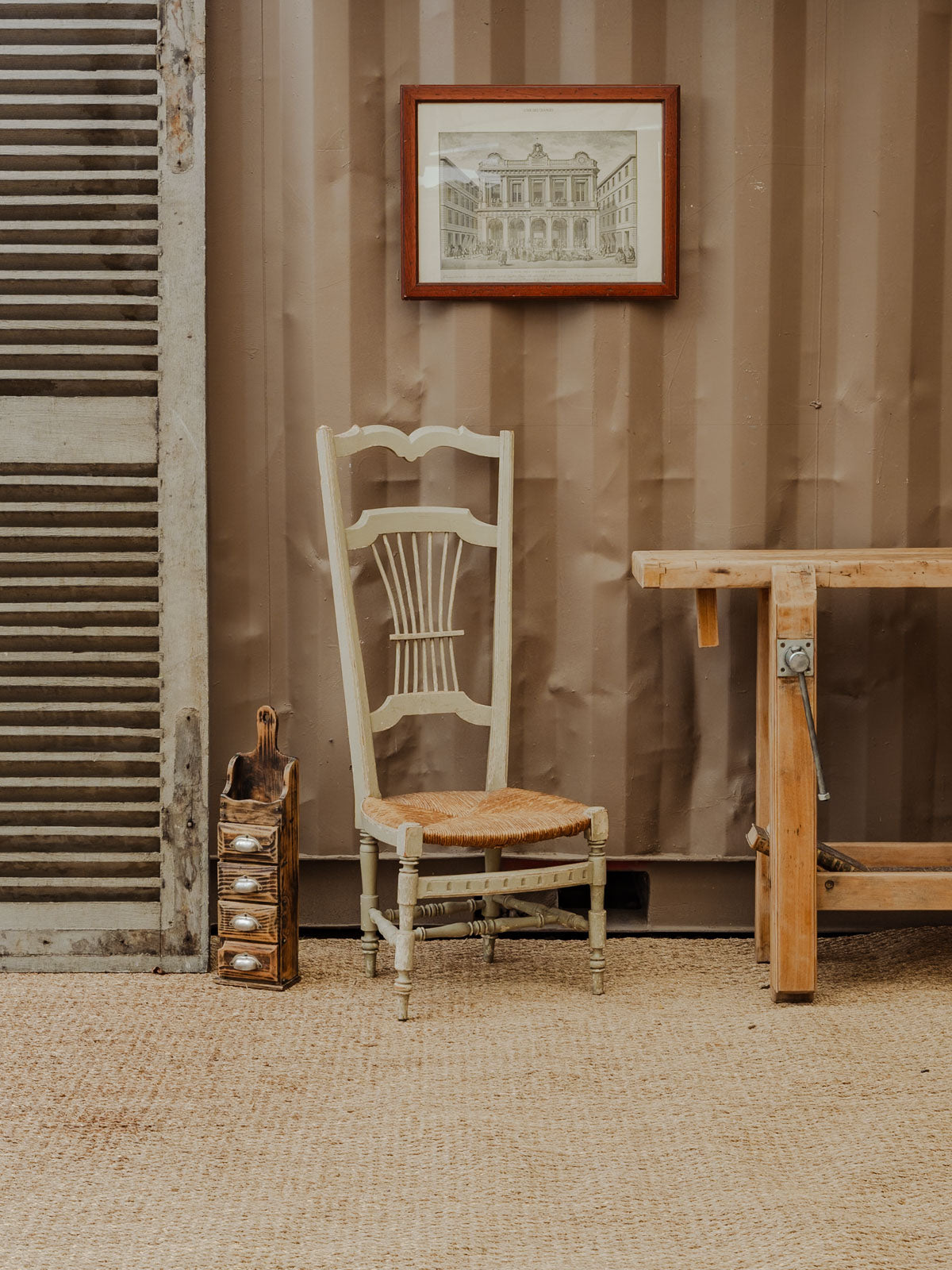 Adoptez cette chaise de nourrice au charme discret, arborant une assise basse en paille tressée et une structure en bois peint d'un vert d'eau délicat. Ses proportions et son dossier haut en font un siège idéal pour un coin lecture, une chambre d'enfant ou une entrée, apportant une touche vintage et apaisante. La patine de la peinture et la paille naturelle confèrent chaleur et authenticité, invitant à des ambiances rétro et poétiques. Quelques traces du temps qui racontent son histoire.