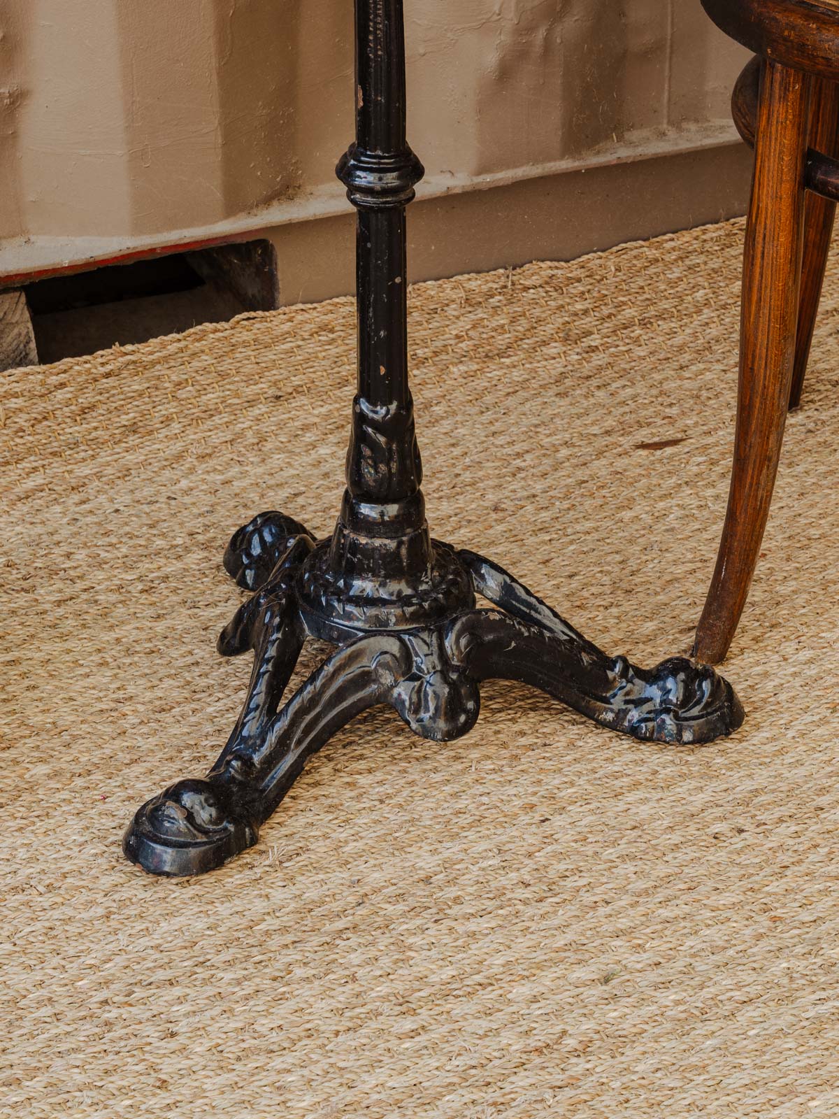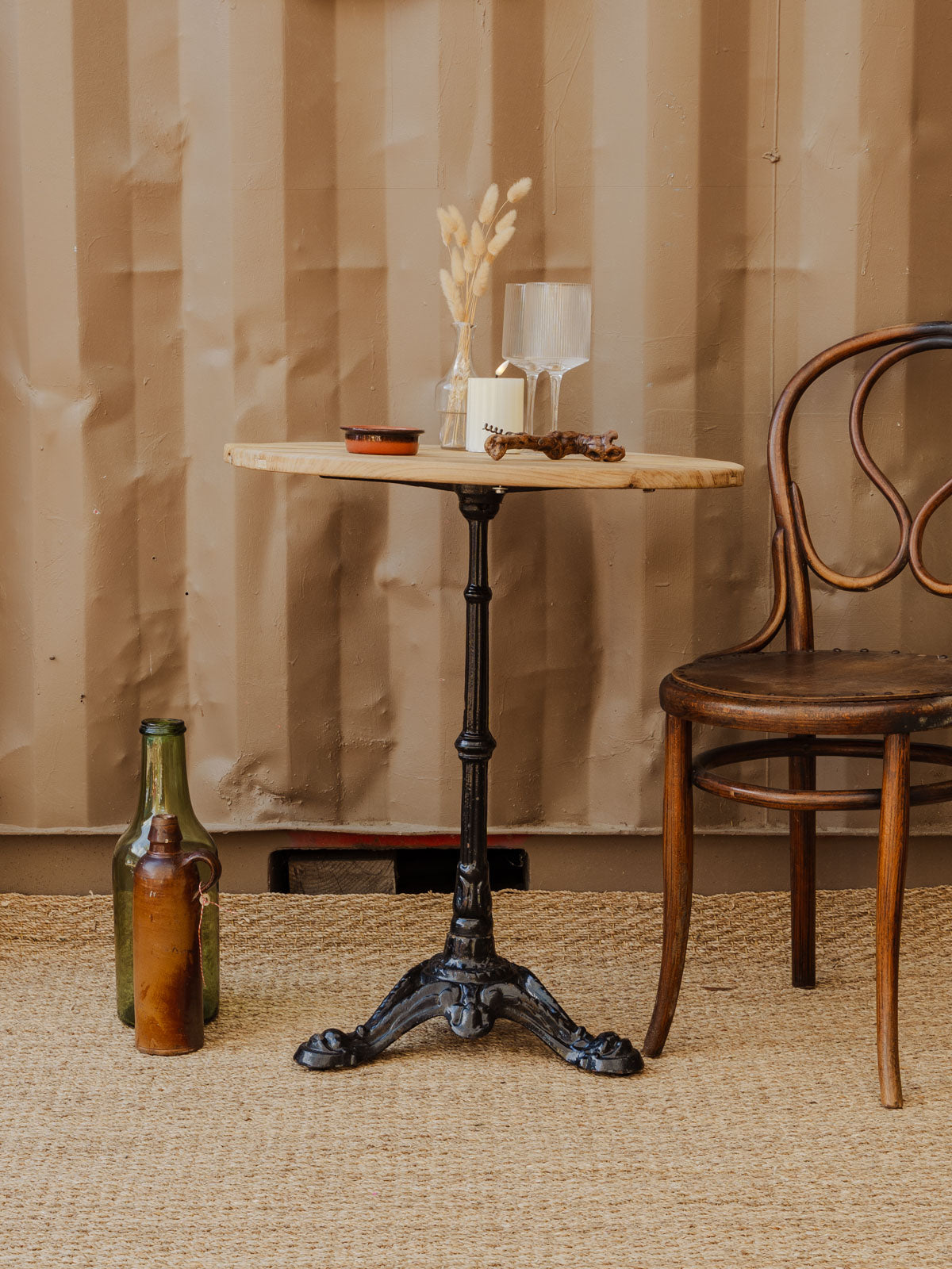 Découvrez cette table de bistro ancienne au plateau en bois chaleureux et aux pieds en métal noir, une pièce qui marie esthétique bistrot et caractère industriel. Sa surface ronde et ses proportions la rendent idéale pour un coin café, un balcon ou un repas à deux, tandis que la robustesse du bois et du métal assure une présence durable. Elle crée une ambiance conviviale et urbaine, parfaite pour les matinées tranquilles ou les apéritifs en duo. Quelques traces d'usage qui font son authenticité.