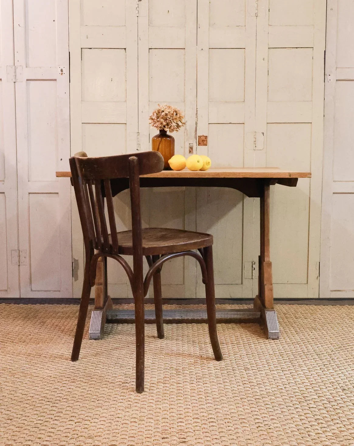 Sublimez votre coin repas avec cette table de ferme bistrot en bois sculpté, où les pieds travaillés et les détails métalliques signent un style à la fois rustique et élégant. Son plateau fin et son format compact offrent un espace convivial pour quatre couverts, idéal en cuisine ou dans un café intimiste. Le bois patiné diffuse une chaleur naturelle tandis que les ferrures soulignent son caractère artisanal. Parfaite pour accueillir jusqu'à 4 convives. Trois exemplaires disponibles.