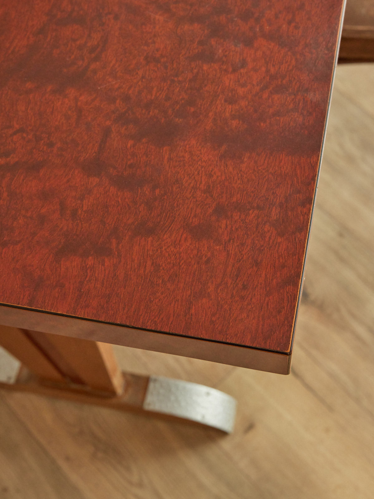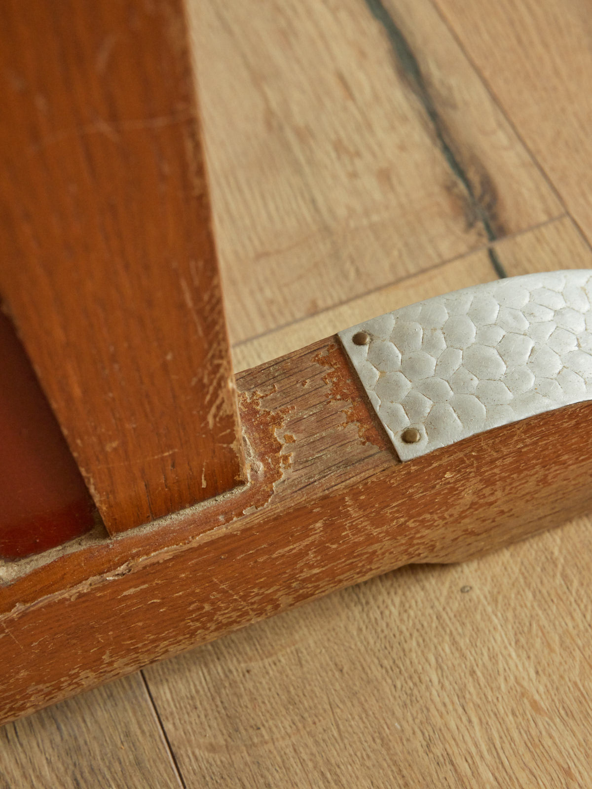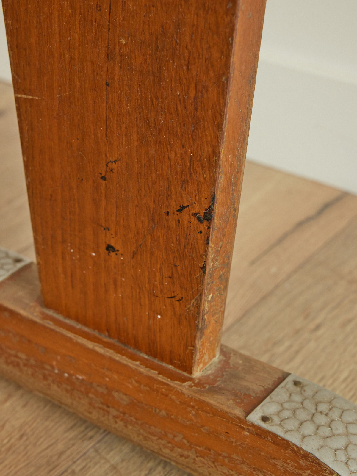 Apportez une touche rétro avec cette table de bistrot des années 50 en bois, au pied recouvert de métal et au plateau plaqué d'un motif typique, qui raconte l'élégance d'une époque. Ses proportions et sa structure robuste la rendent idéale pour un coin café, un petit repas à deux ou comme table d'appoint dans un salon. Le contraste du bois chaleureux et du métal patiné crée une ambiance parisienne, authentique et accueillante, parfaite pour composer un intérieur à la fois élégant et convivial. Elle peut accueillir 4 convives.