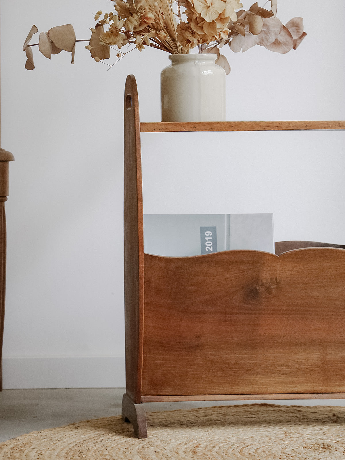 Découvrez ce porte-revues en bois foncé des années 70, au profil élancé et aux lignes vintage chaleureuses. Sa hauteur et son rangement vertical permettent d'accueillir plusieurs magazines et journaux, idéal à placer près d'un canapé ou dans une entrée pour gagner de la place. La patine du bois apporte une chaleur subtile et un caractère rétro qui s'intègre au style mid-century ou à une décoration contemporaine, créant un coin lecture élégant.