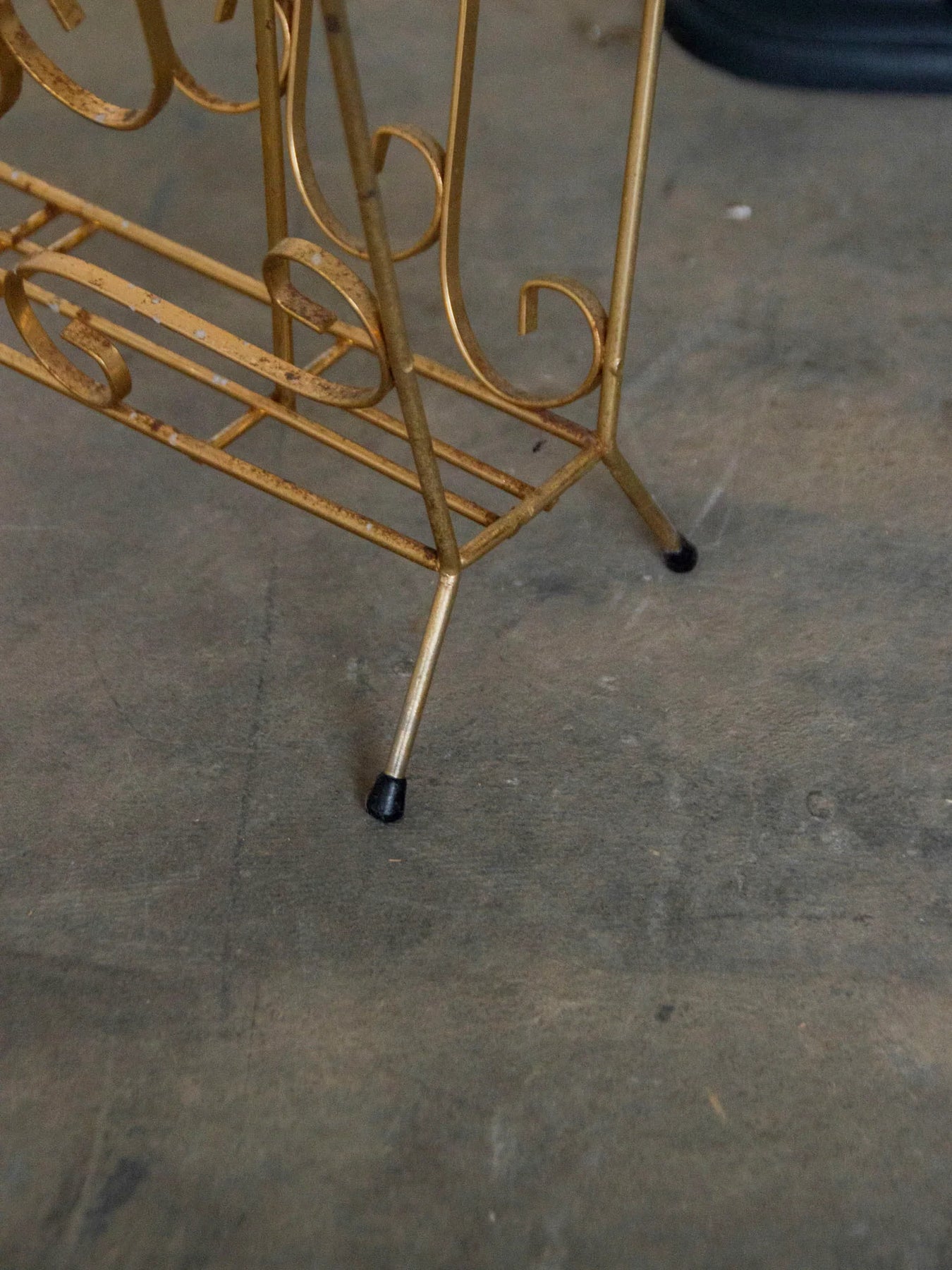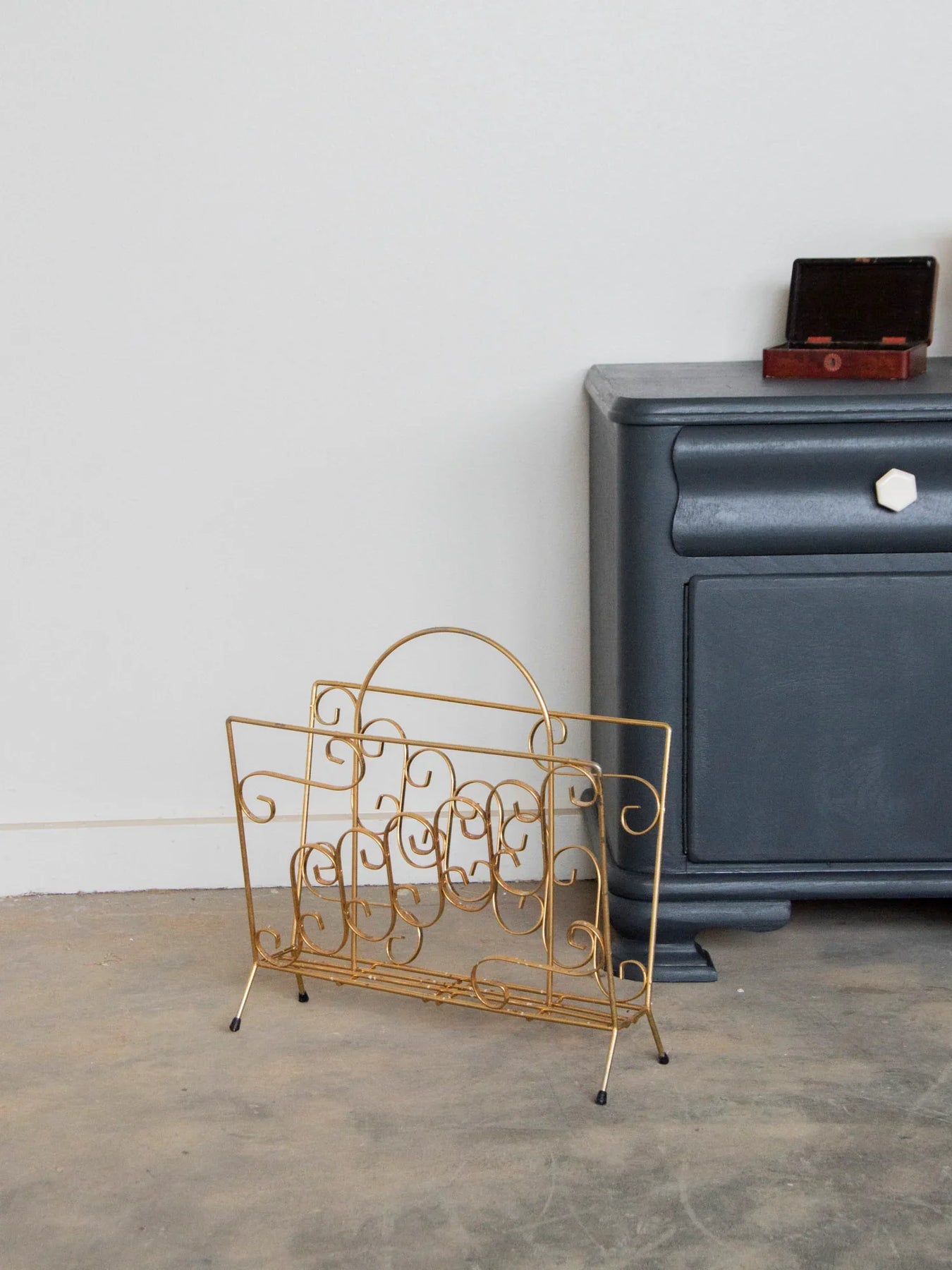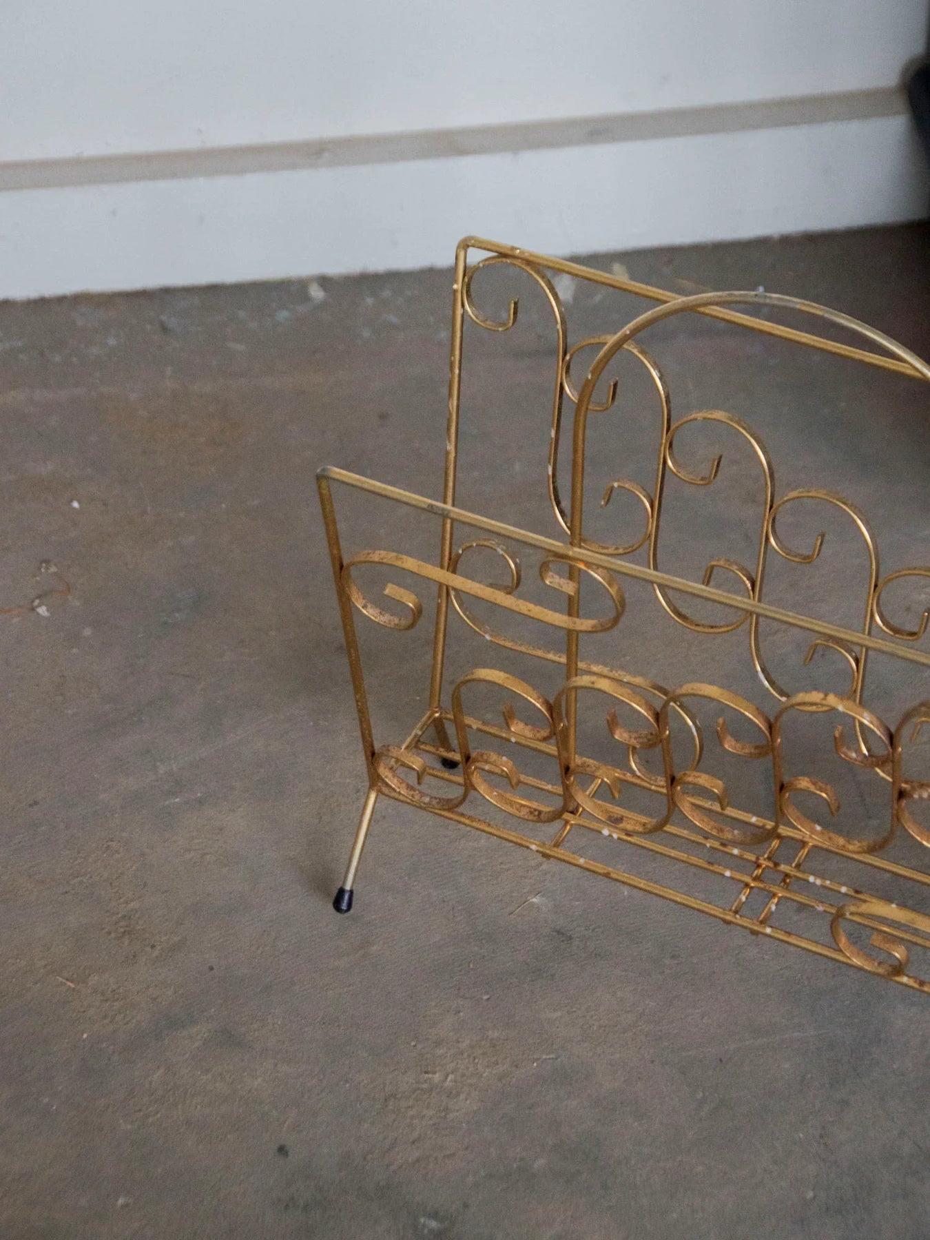 Ajoutez un porte-revues en métal doré au design délicat, doté d'une petite anse ronde et de pieds fins, qui illuminera votre coin lecture d'une élégance discrète. Entièrement métallique, il conjugue robustesse et légèreté visuelle ; ses proportions élancées accueillent plusieurs magazines tout en restant discret. La finition patinée apporte une note chaleureuse et vintage, idéale pour compléter un intérieur lumineux ou un salon sobre. Quelques marques d'usage qui font son authenticité.