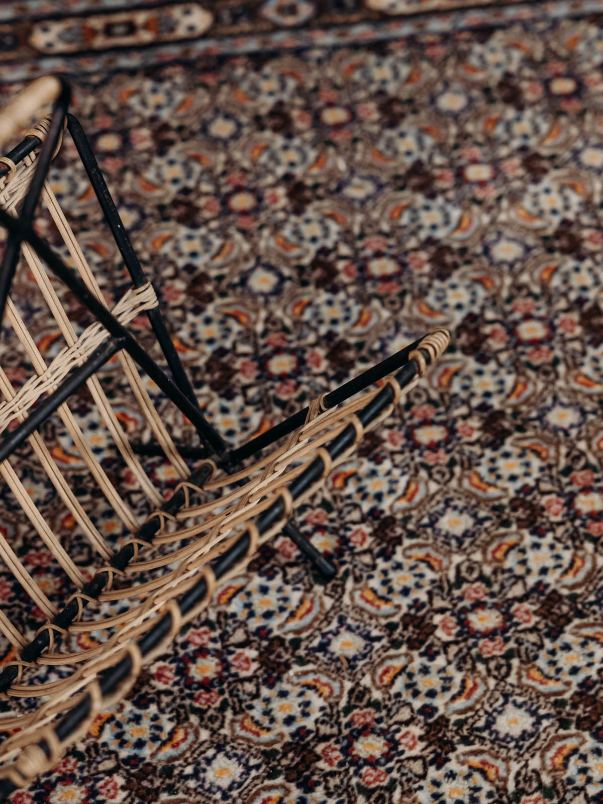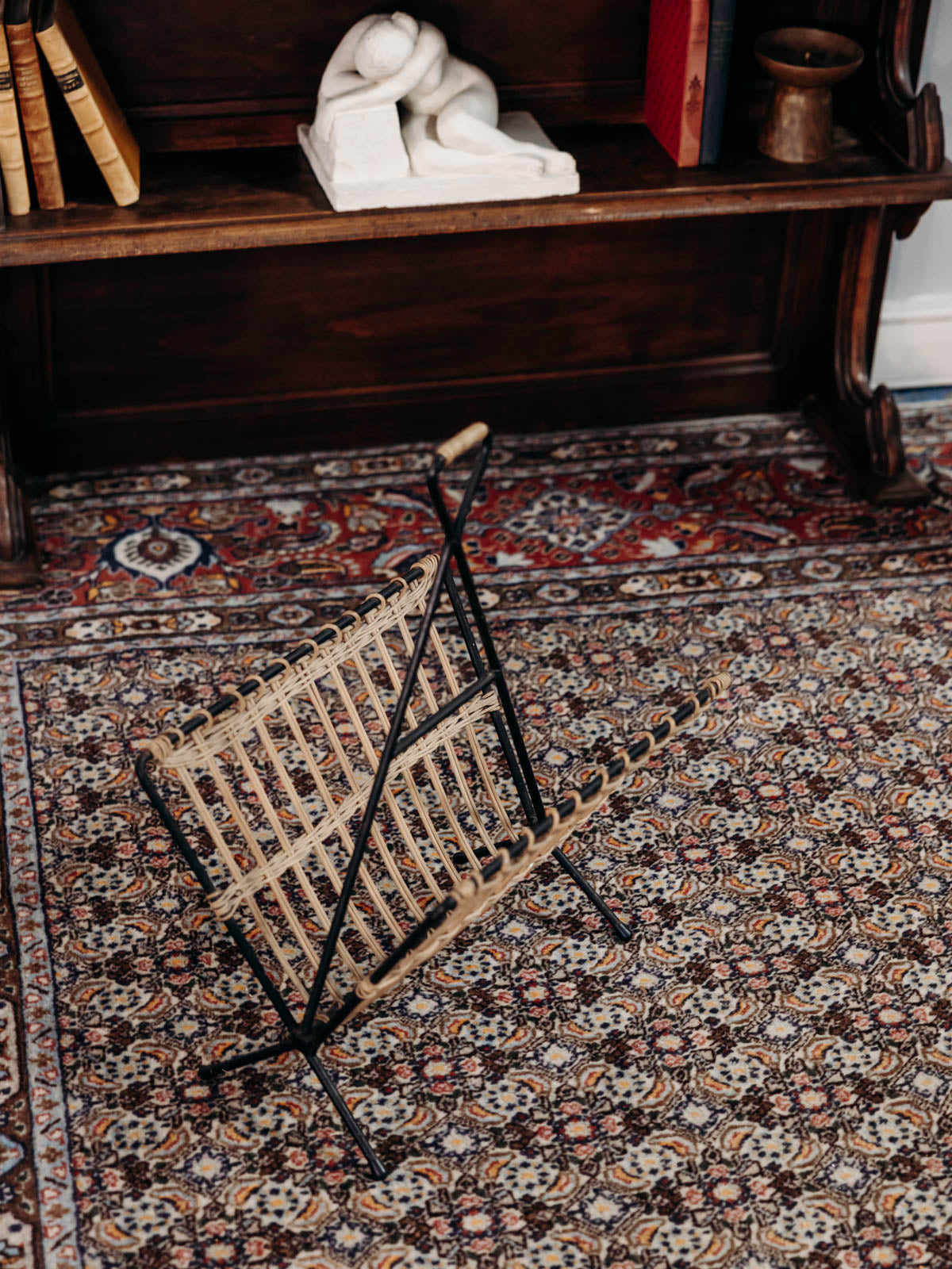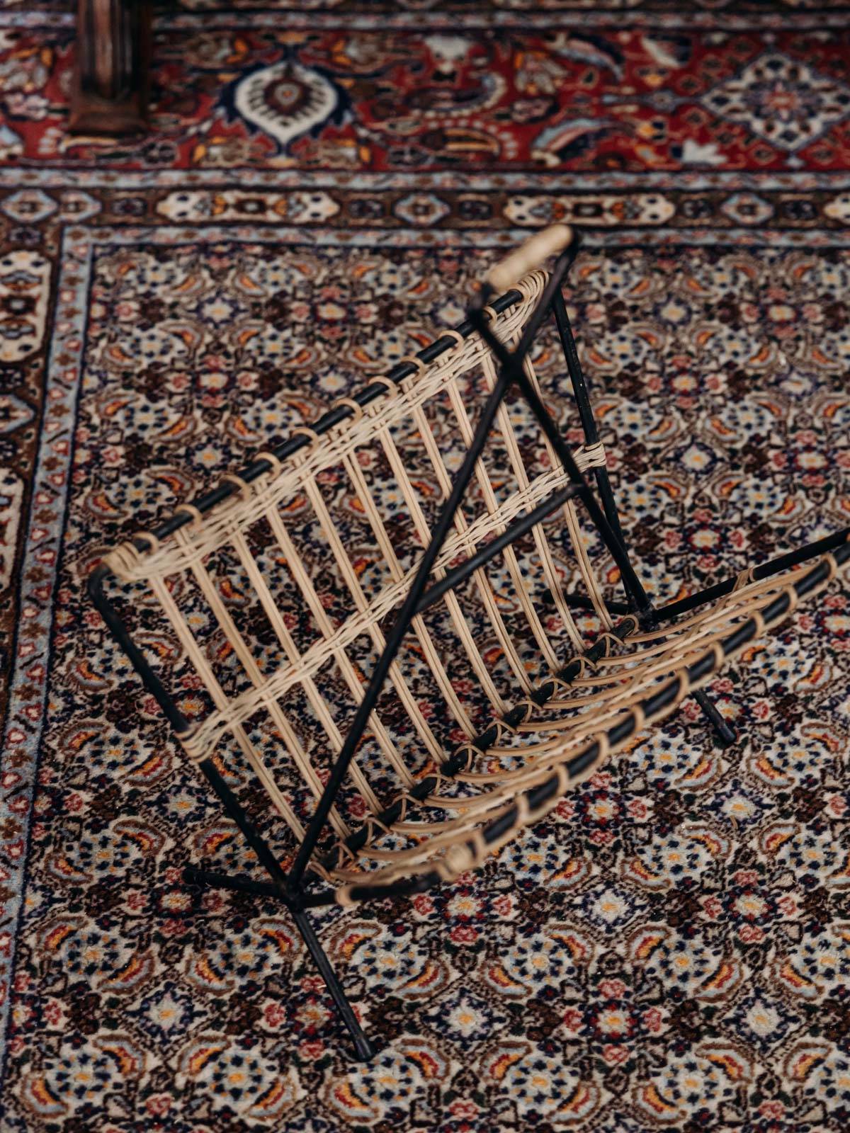 Adoptez ce porte-revue en osier et métal noir, rehaussé d'une grande poignée haute qui souligne sa silhouette élancée et facilite son déplacement. Le tressage chaleureux associé à l'armature sombre crée un contraste raffiné, offrant un rangement vertical adapté aux magazines et journaux près du canapé ou de l'entrée. Sa hauteur apporte une présence discrète et une note naturelle, parfaite pour une ambiance contemporaine ou bohème. Légères usures présentes.