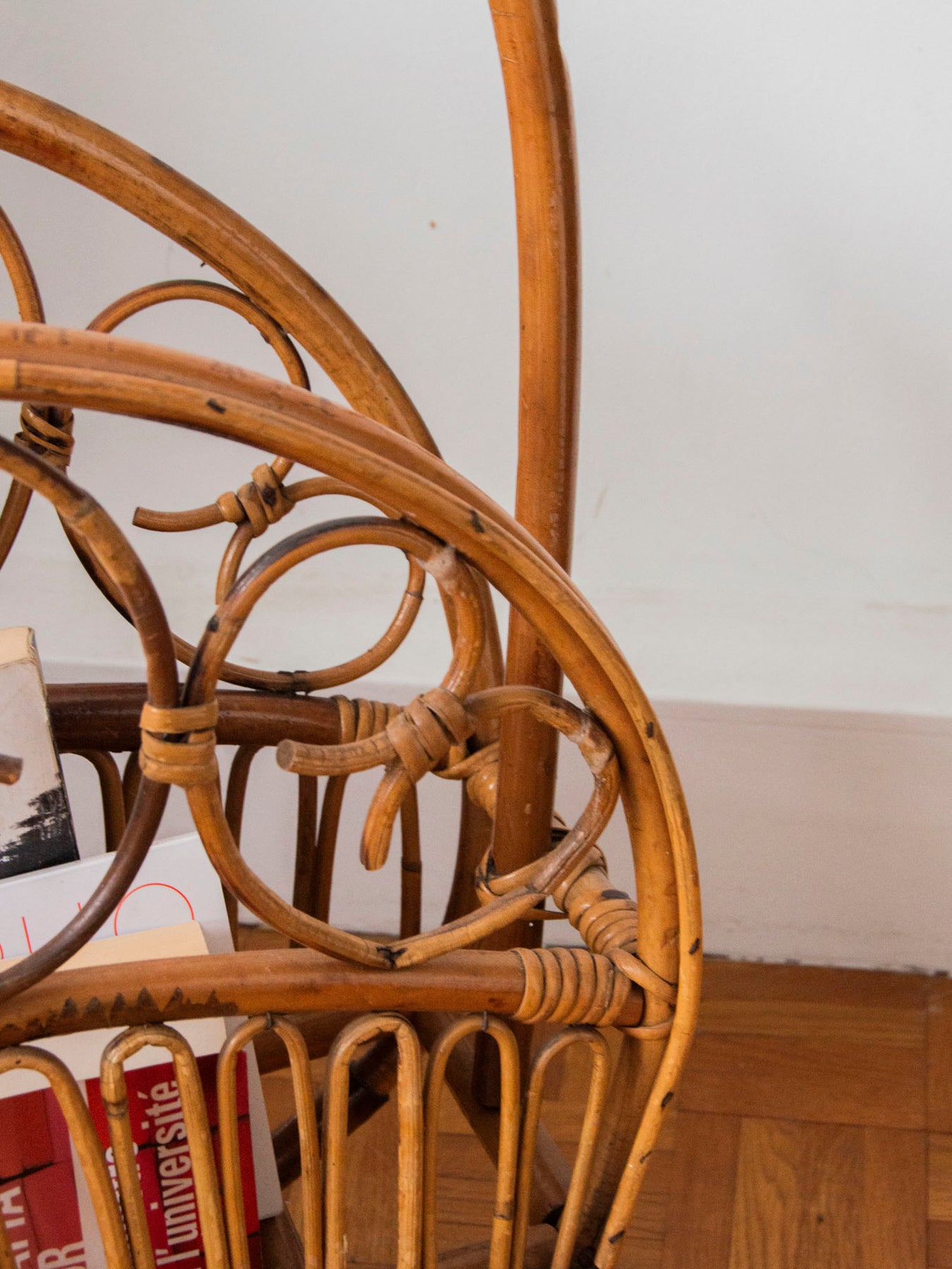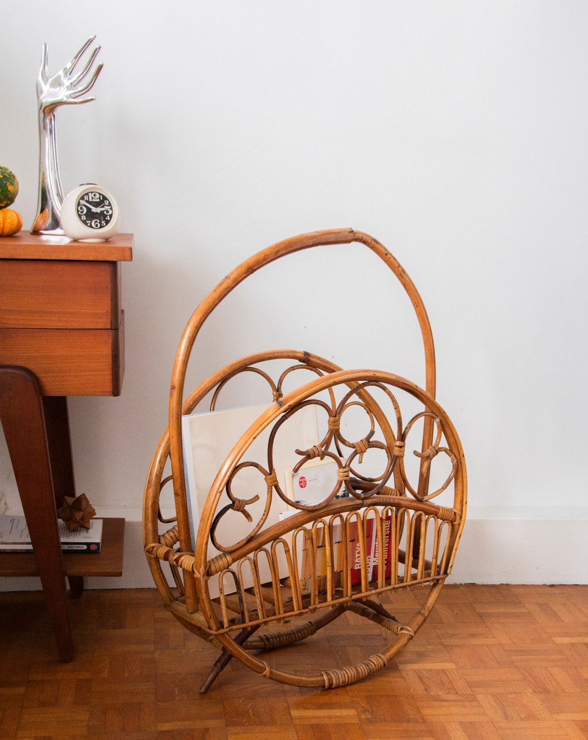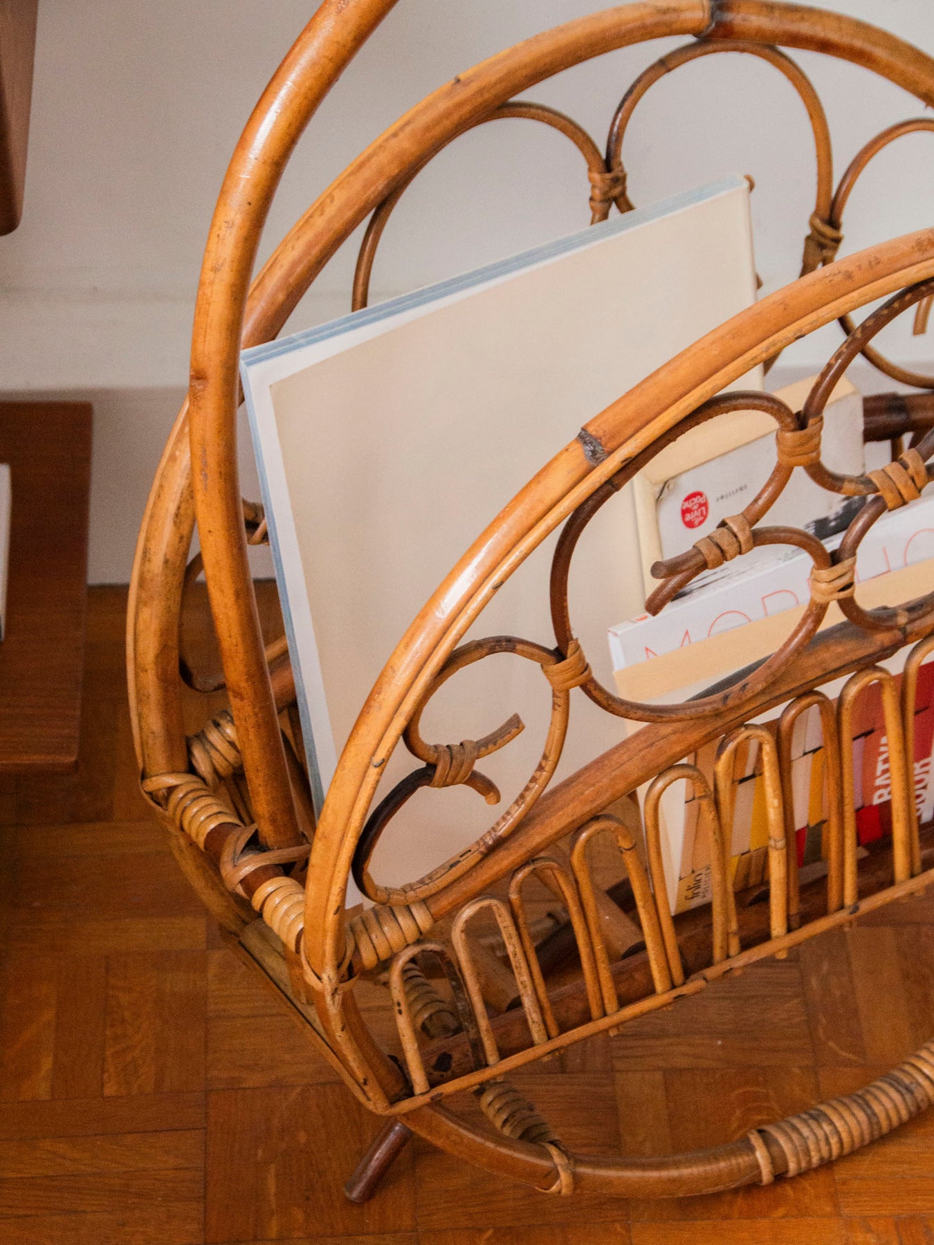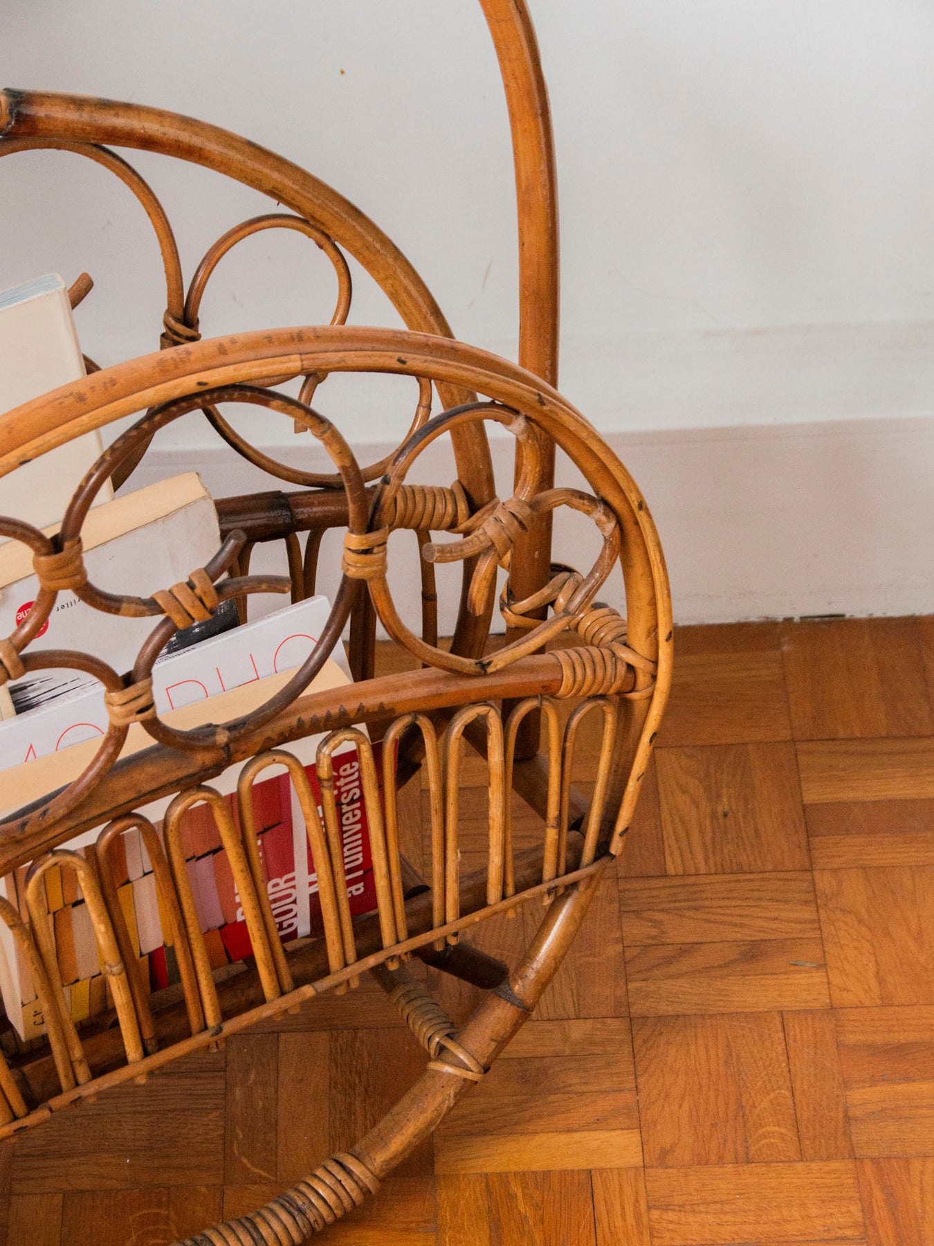 Adoptez ce grand porte-revues en rotin et osier signé Franco Albini, dont la silhouette arrondie apporte une note organique et raffinée à votre intérieur. Sa structure tressée offre un grand espace de rangement pour livres et revues tout en restant légère visuellement, idéale dans le salon ou près d'une bibliothèque. Le contraste entre la fibre naturelle et les lignes modernistes du designer crée une atmosphère chaleureuse et intemporelle, parfaite pour une décoration poétique et apaisée.