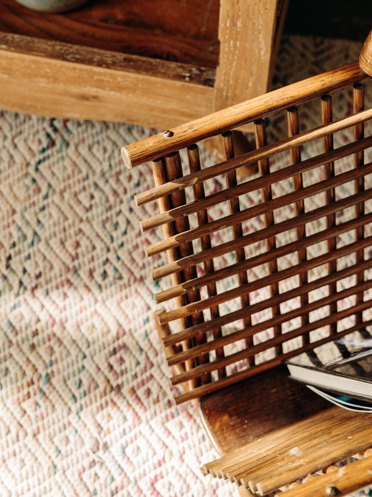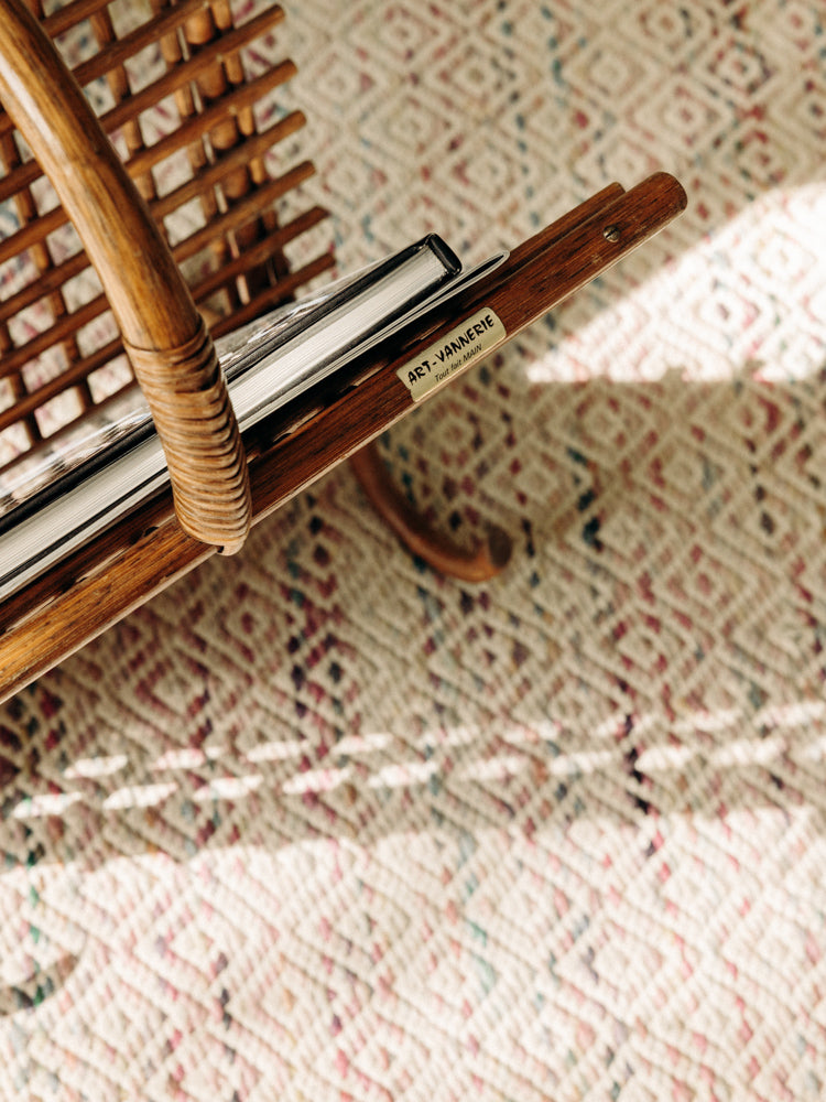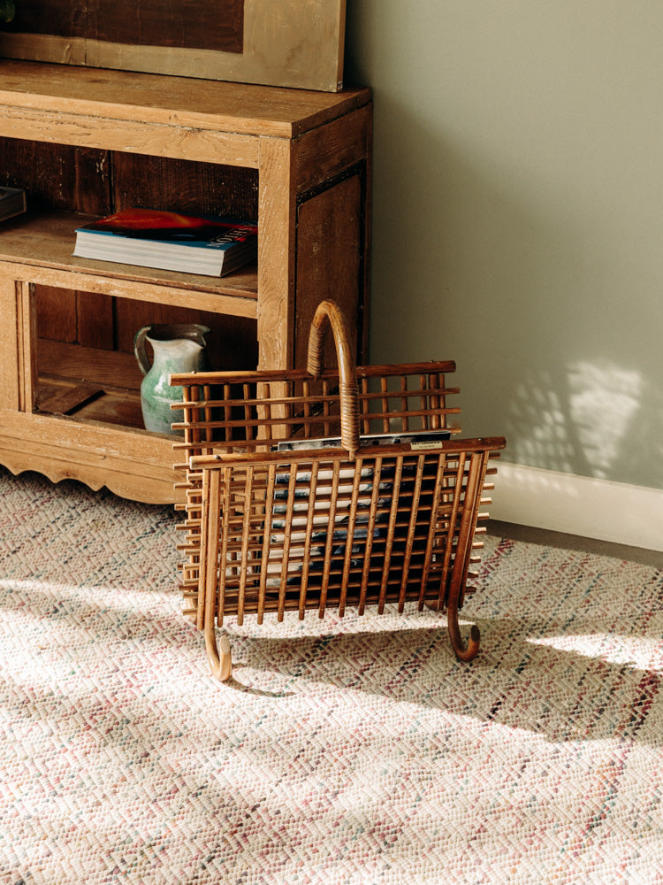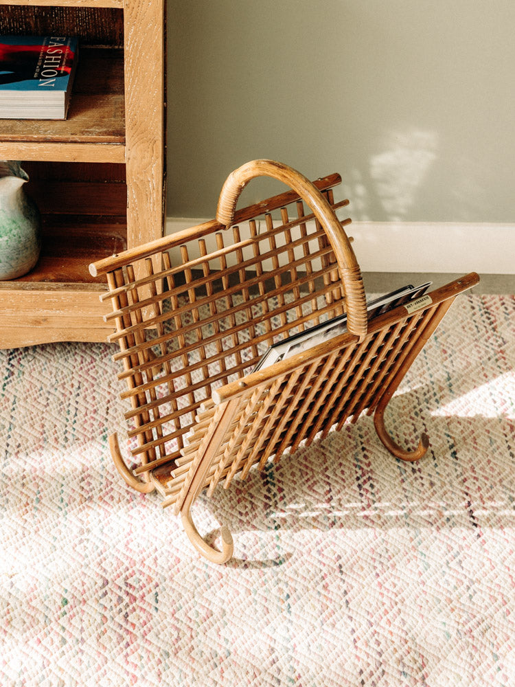 Adoptez ce porte-revues en bois clair et rotin, façonné à la main selon l'art de la vannerie. Sa silhouette élancée et ses proportions étudiées accueillent revues, journaux et petits livres sans encombrer l'espace, offrant un rangement pratique et discret. La chaleur naturelle du bois se marie à la texture aérienne du rotin pour créer une ambiance lumineuse et chaleureuse, idéale près d'un fauteuil ou dans une entrée.
