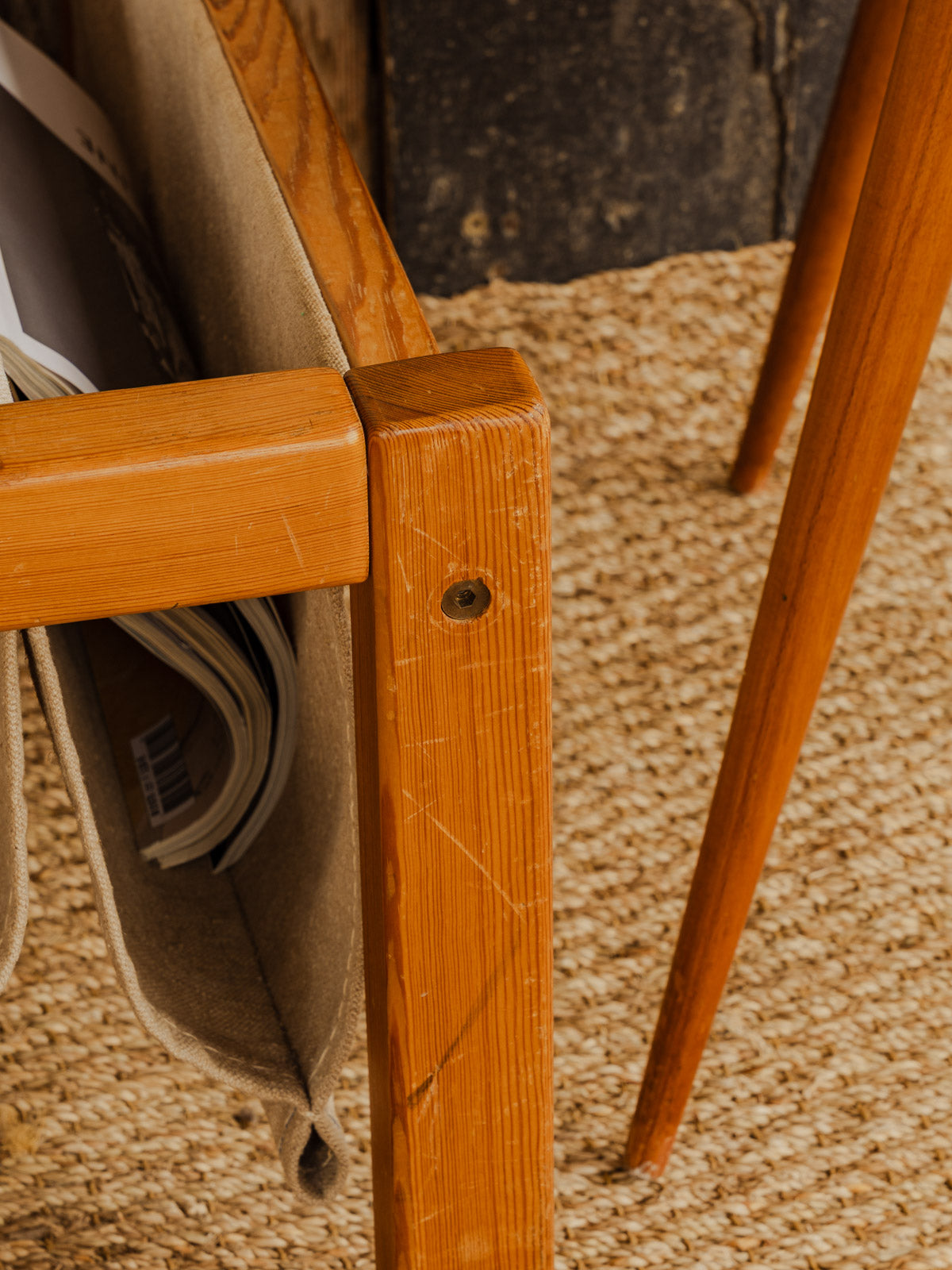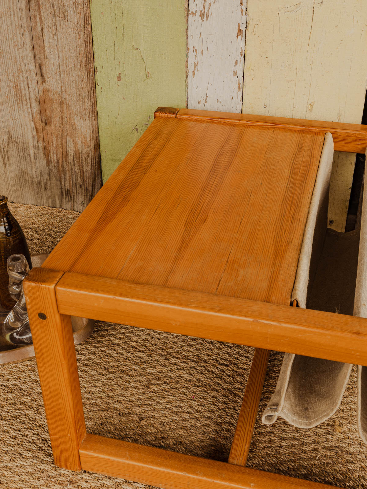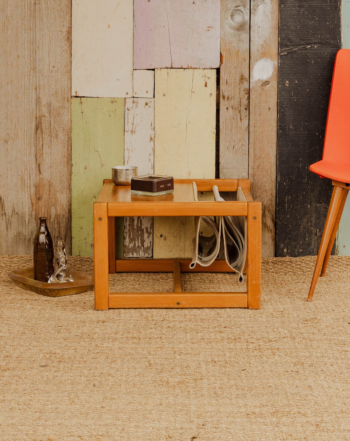 Adoptez cette table basse en bois au charme vintage des années 80, signée Ikea, qui marie simplicité des lignes et chaleur du matériau. Son porte-magazine en tissu offre un rangement discret pour revues et télécommandes et ses proportions la rendent idéale pour un salon cosy ou un coin lecture. L’association bois et textile crée une ambiance douce et détendue, parfaite pour les intérieurs au style scandinave. Quelques traces du temps qui participent à son charme.