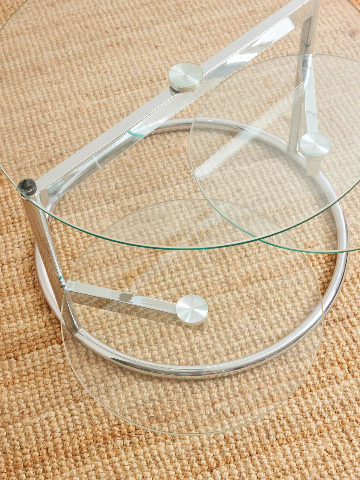Apportez une table basse à trois plateaux en verre posés sur une structure en métal chromé, alliant transparence et élégance graphique. Les plateaux superposés mobiles multiplient les niveaux d'usage pour présenter livres, lampes et objets déco sans alourdir l'espace, tandis que l'acier chromé souligne une silhouette moderne et lumineuse. Idéale pour un salon contemporain ou un coin lecture, elle crée une ambiance aérienne et structurée, favorisant la circulation visuelle et la mise en scène des objets.