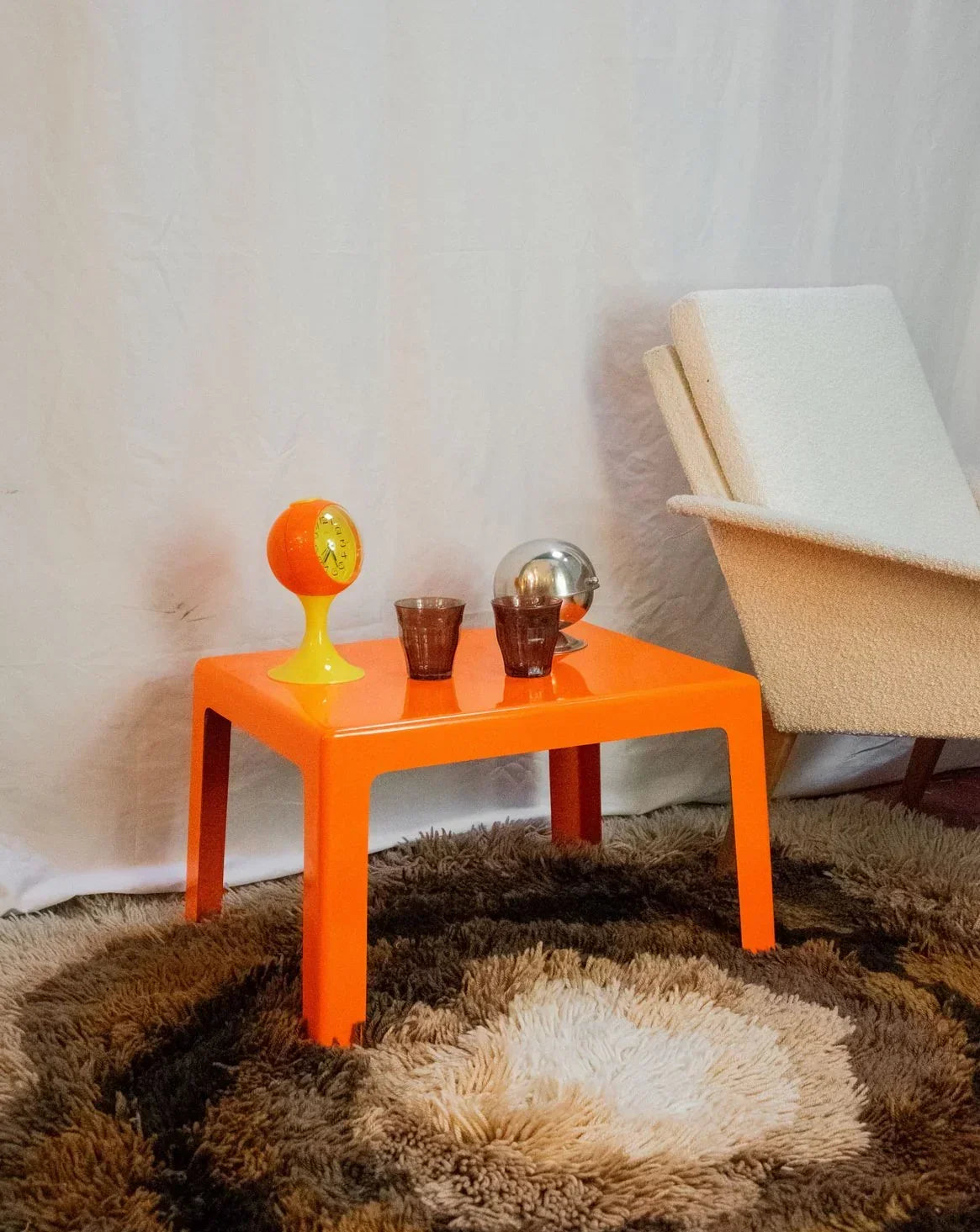 Invitez une touche années 70 avec cette table basse d'appoint en fibre de verre orange au design graphique, dont la teinte chaleureuse dynamise l'espace. Son format compact la rend idéale en bout de canapé ou dans un coin lecture, tandis que la surface lisse et résistante réunit praticité et élégance visuelle. Parfaite pour créer une atmosphère rétro et colorée sans surcharge. Légères traces du temps discrètes.