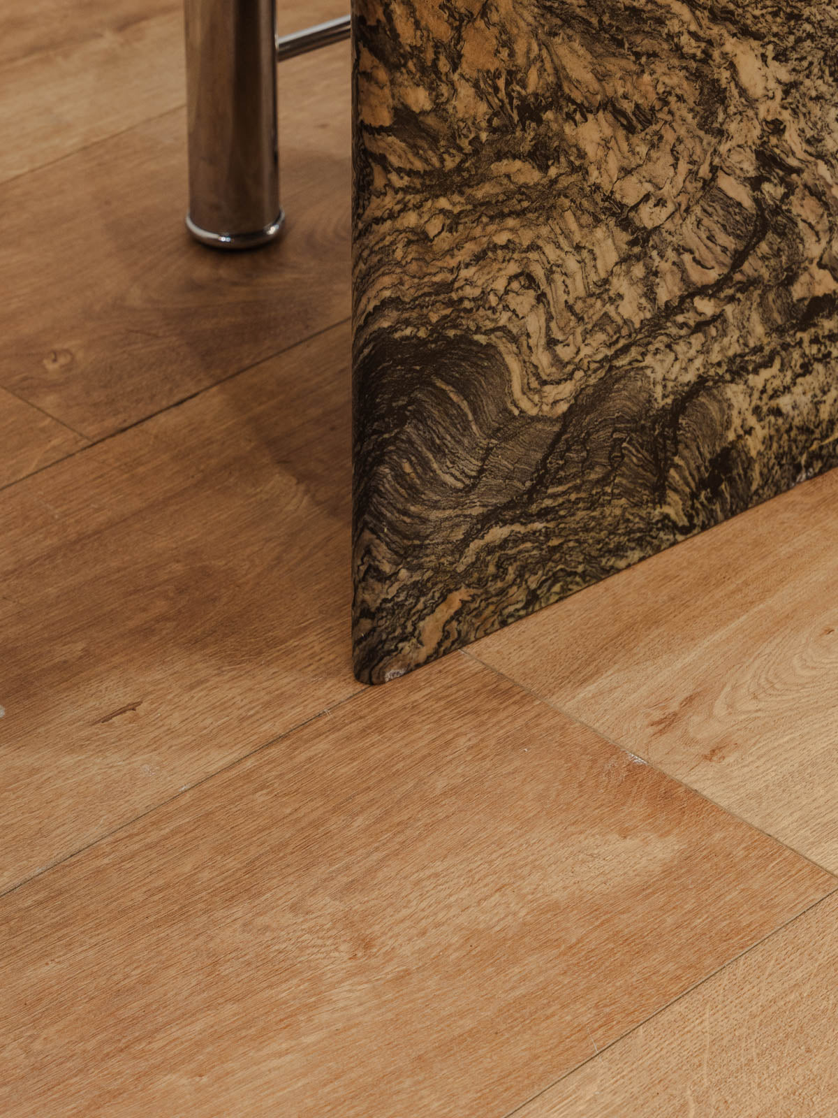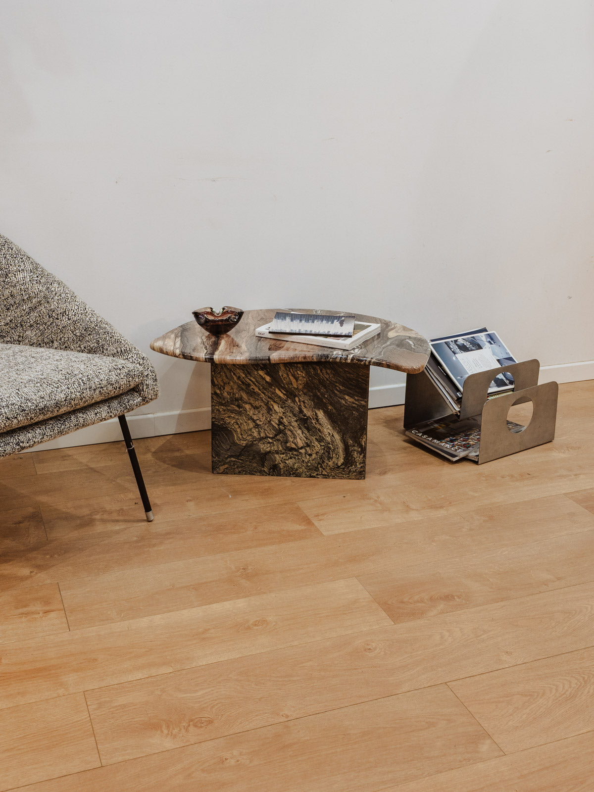 Sublimez votre salon avec cette table basse en marbre aux nuances grises et beiges, dessinée en une élégante silhouette de goutte qui dialogue avec des pieds chromés. Sa surface apporte une présence naturelle et lumineuse, idéale pour poser livres, bougies et objets décoratifs tout en structurant l'espace autour d'un canapé. Son équilibre entre matières nobles et lignes contemporaines crée une ambiance sobre et raffinée. Quelques traces du temps présentes.