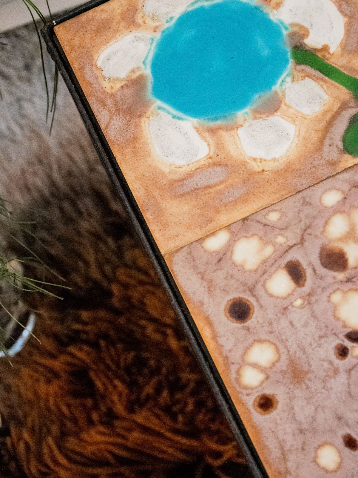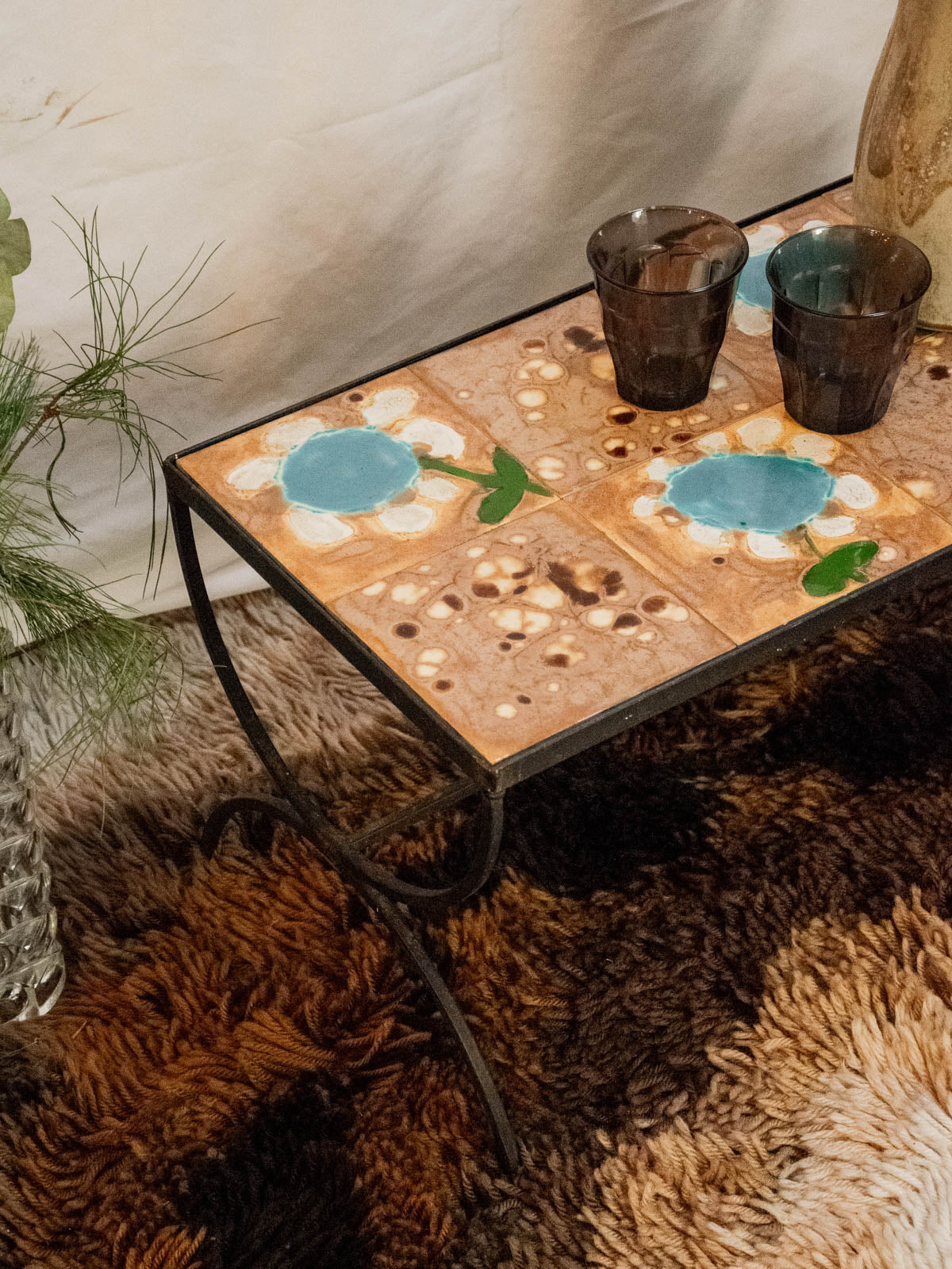 Apportez une touche délicate à votre salon avec cette petite table basse au piètement en métal et au plateau en céramique. Le plateau coloré présente un motif floral au dessin volontairement naïf, qui apporte caractère et poésie sans surcharger l’espace. Sa compacité en fait une table d'appoint idéale près d'un fauteuil ou pour mettre en valeur objets et revues, tandis que les pieds en arcs entrecroisés lui donnent une silhouette légère et graphique. Traces du temps sur le piètement, rouille traitée.