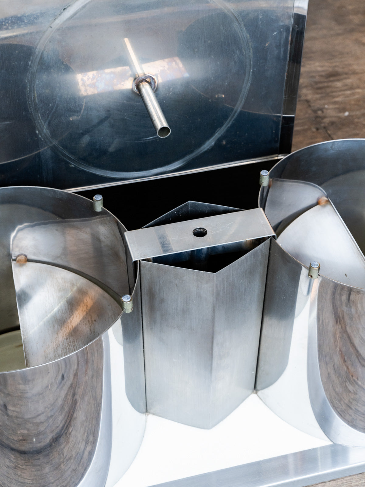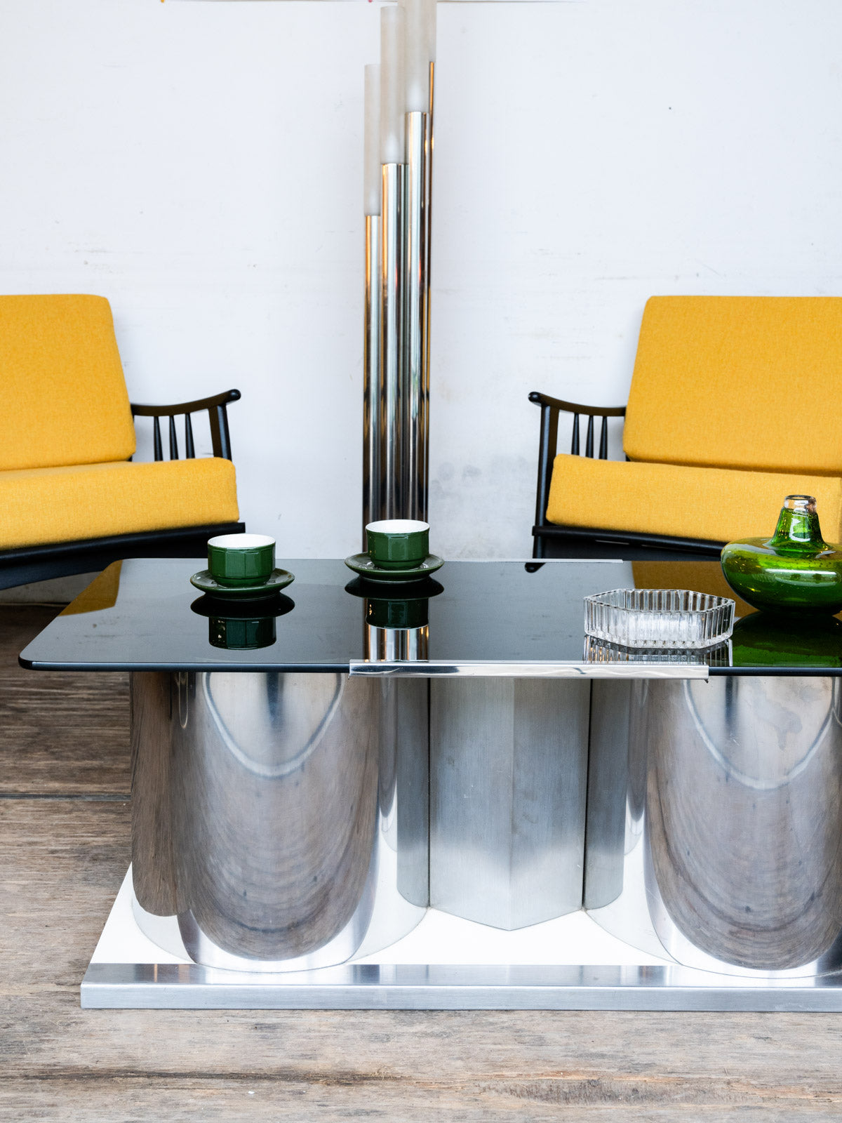 Transformez votre salon avec cette table basse au design unique et fonctionnel. Son plateau en verre fumé pivotant ajoute une touche de modernité tout en offrant un espace modulable. Les deux fûts en métal chromé, élégants et pratiques, servent de rangement discret pour vos magazines, télécommandes ou autres objets du quotidien. La base en bois apporte chaleur et stabilité, équilibrant parfaitement l'ensemble. Idéale pour un intérieur contemporain ou industriel, cette table basse allie esthétique et praticité. Faites de votre espace de vie un lieu à la fois chic et organisé.