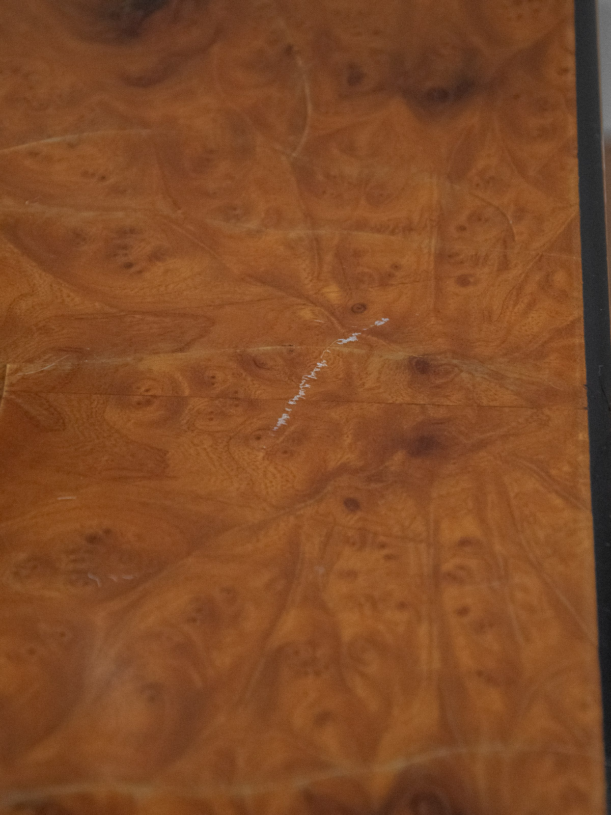 Découvrez cette table basse rectangulaire en loupe d’orme, véritable pièce maîtresse de votre intérieur. Son plateau en relief, marqué par des craquelures et des traces du temps, apporte une touche d'authenticité et de caractère. Les pieds noirs en bois et les contours en noir, typiques des années 70, confèrent à ce mobilier une allure vintage résolument élégante. Idéale pour les amateurs de design qui souhaitent allier esthétique et histoire dans leur décoration.