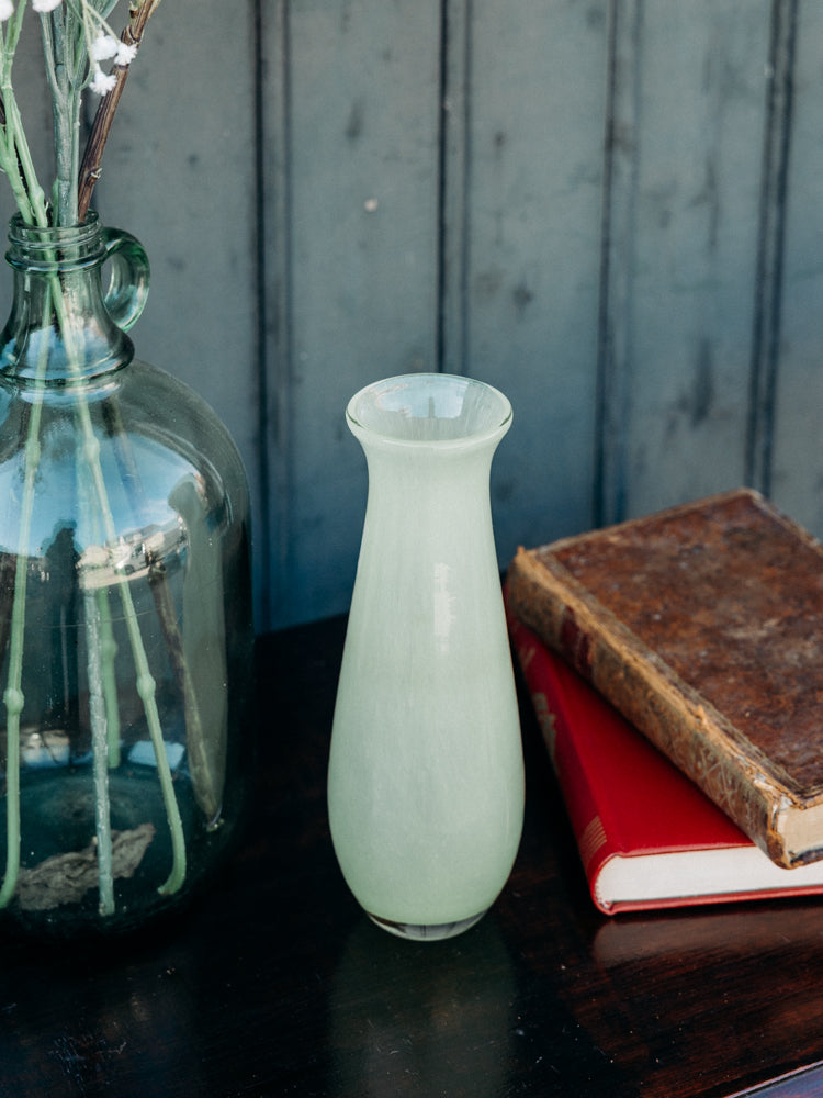 Invitez ce vase vert clair en verre, doucement texturé à l'intérieur, pour une touche lumineuse et discrète dans votre intérieur. Sa silhouette élancée et son goulot étroit mettent en valeur une tige ou une petite branche, transformant un simple bouquet en une composition soignée. Sa teinte douce diffuse une lumière tendre et s'accorde à des ambiances minimalistes ou bohèmes, sur une étagère, une console ou une table de chevet.