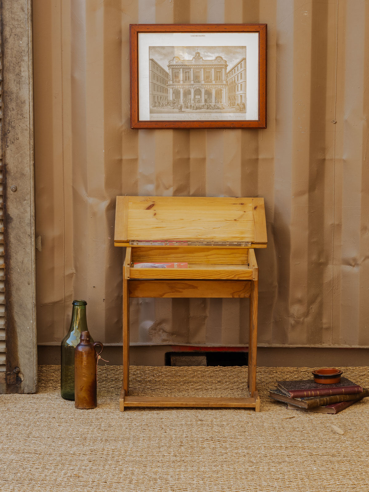 Adoptez ce petit pupitre d'écolier vintage en bois, dont le style apporte une touche chaleureuse et originale à tout intérieur. Son plateau se relève en glissant vers le haut, révélant un espace de rangement discret parfait pour organiser papiers et fournitures ou créer un coin écriture ponctuel. Son gabarit le rend facile à intégrer dans une chambre, une entrée ou un bureau, et la teinte naturelle du bois instaure une ambiance douce et lumineuse.
