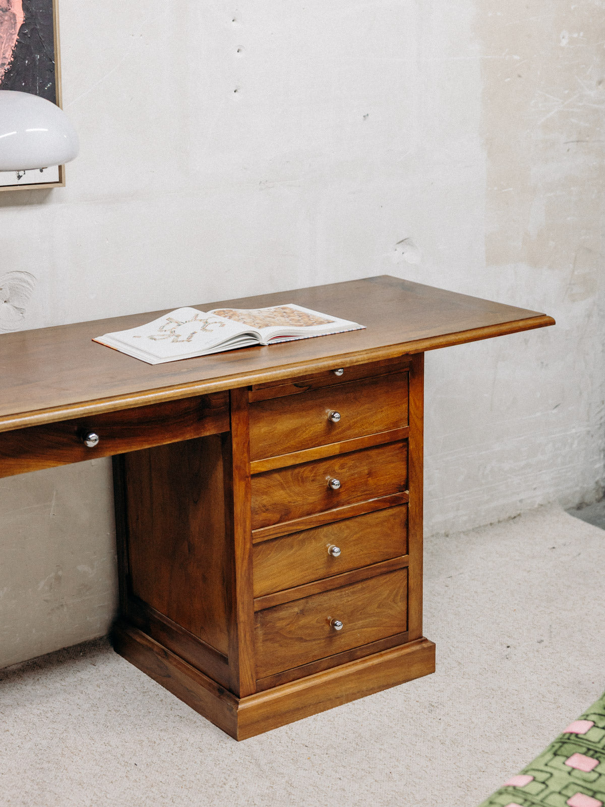 Adoptez ce grand bureau de direction au design élégant, ses volumes généreux et ses poignées rondes chromées lui confèrent une allure contemporaine et professionnelle. Les huit tiroirs et le tiroir central offrent un rangement optimisé pour dossiers et fournitures, tandis que le vaste plateau accueille aisément ordinateur, documents et réunions impromptues. Sa tablette caché ajoute une organisation discrète pour préserver l’espace de travail. Idéal pour instaurer une ambiance sobre et concentrée dans un bureau ou un espace de télétravail.
