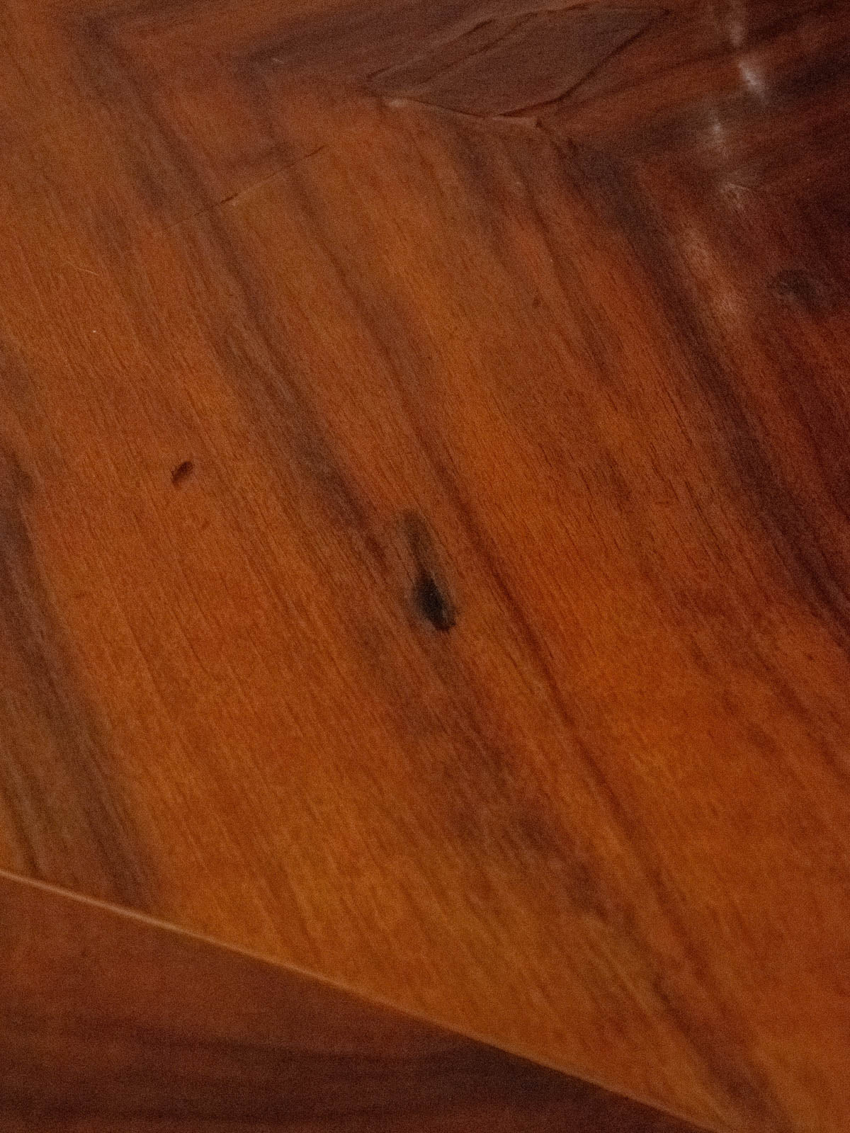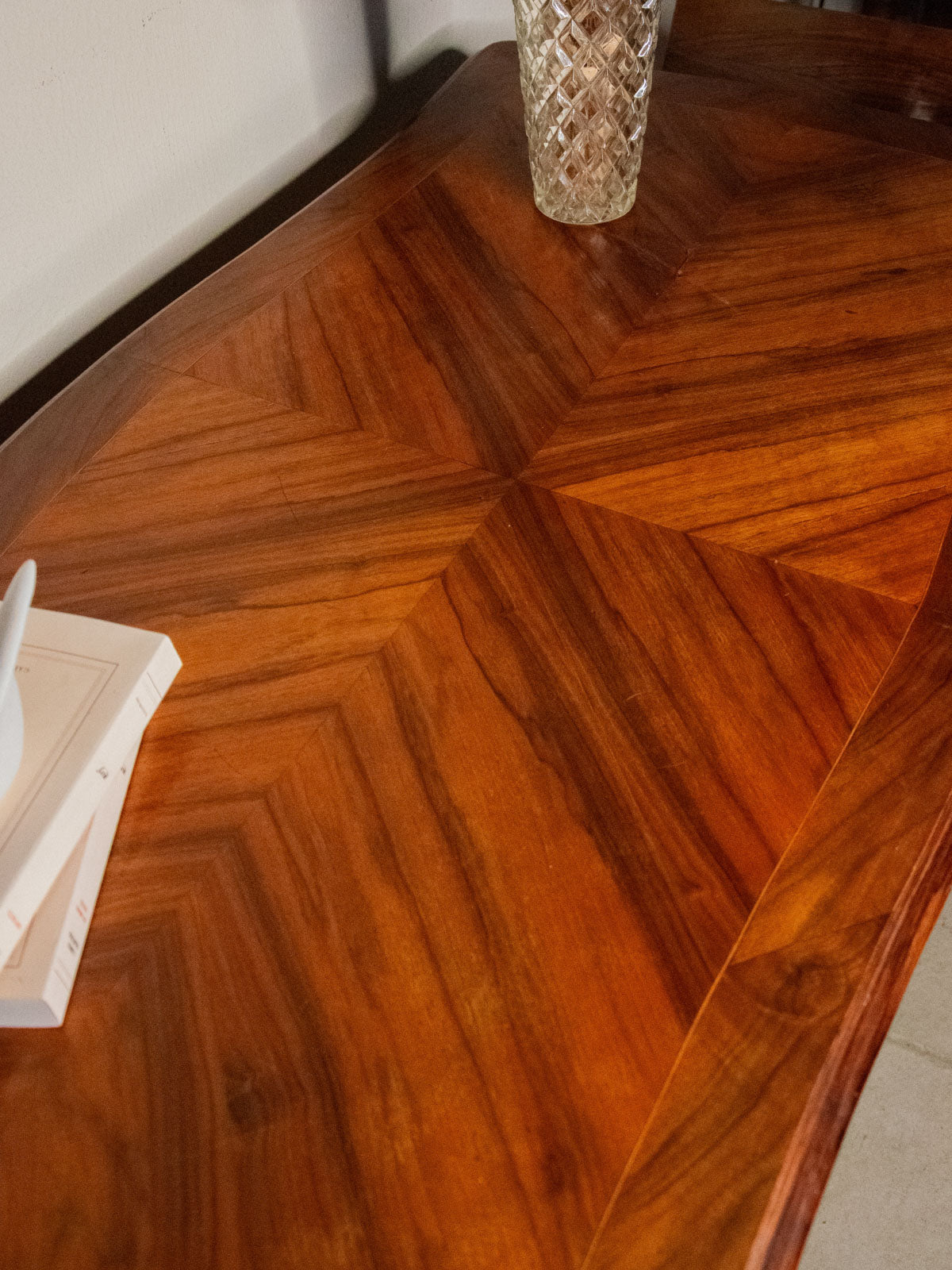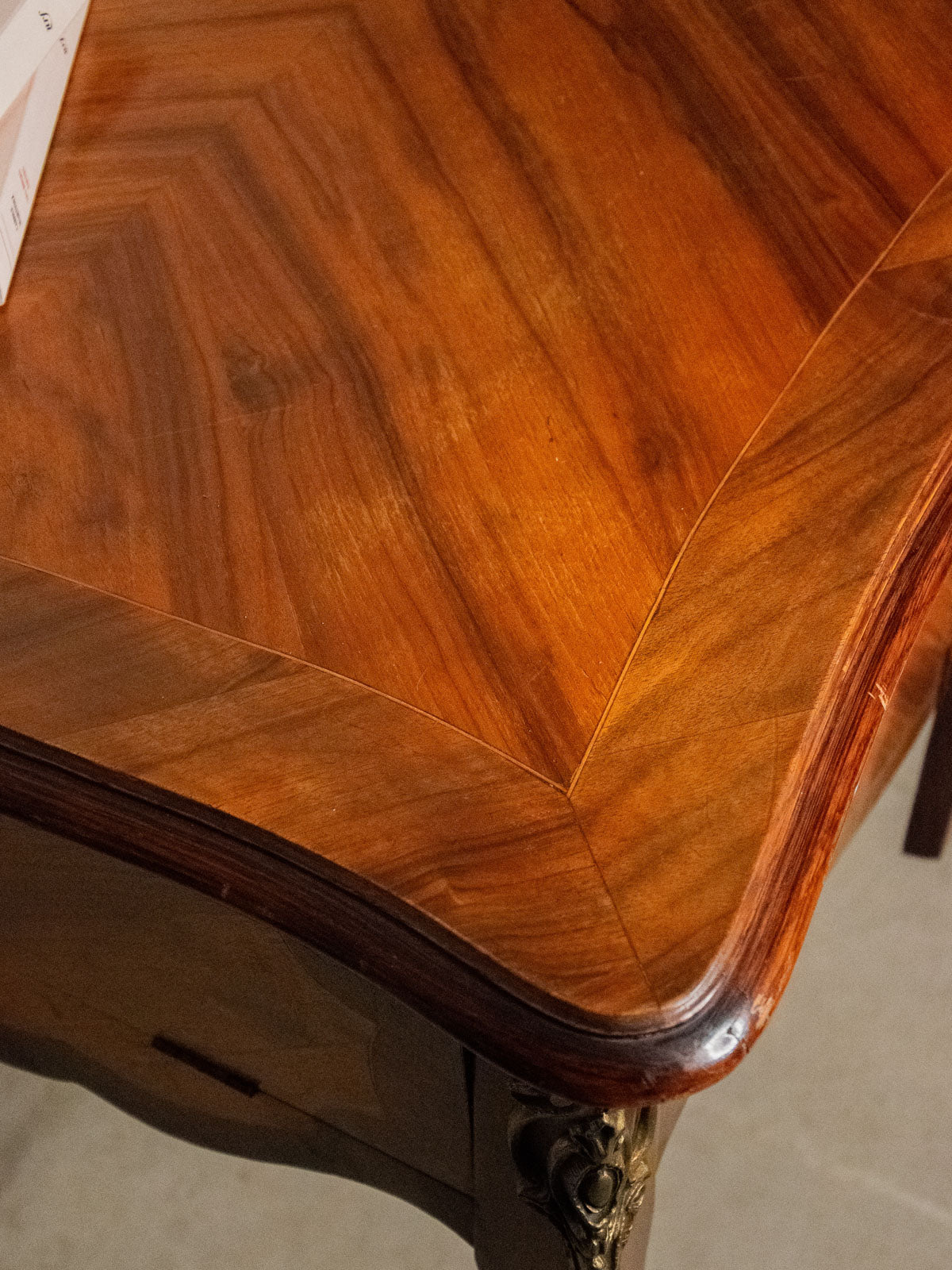 Adoptez ce bureau à trois tiroirs où la marqueterie raffinée habille la façade et dialogue avec des poignées et ornements en laiton, posés sur des pieds courbés qui lui donnent une silhouette élégante. Le plateau décoré de motifs triangulaires offre un plan de travail accueillant et pratique, tandis que les tiroirs à battant dévoilent étagères et compartiments pour un rangement organisé. Parfait pour un coin bureau ou une entrée au style classique et chaleureux. Quelques traces du temps et rayures se confondent dans sa beauté, et un ornement en forme de patte de lion manque sur le pied avant droit.