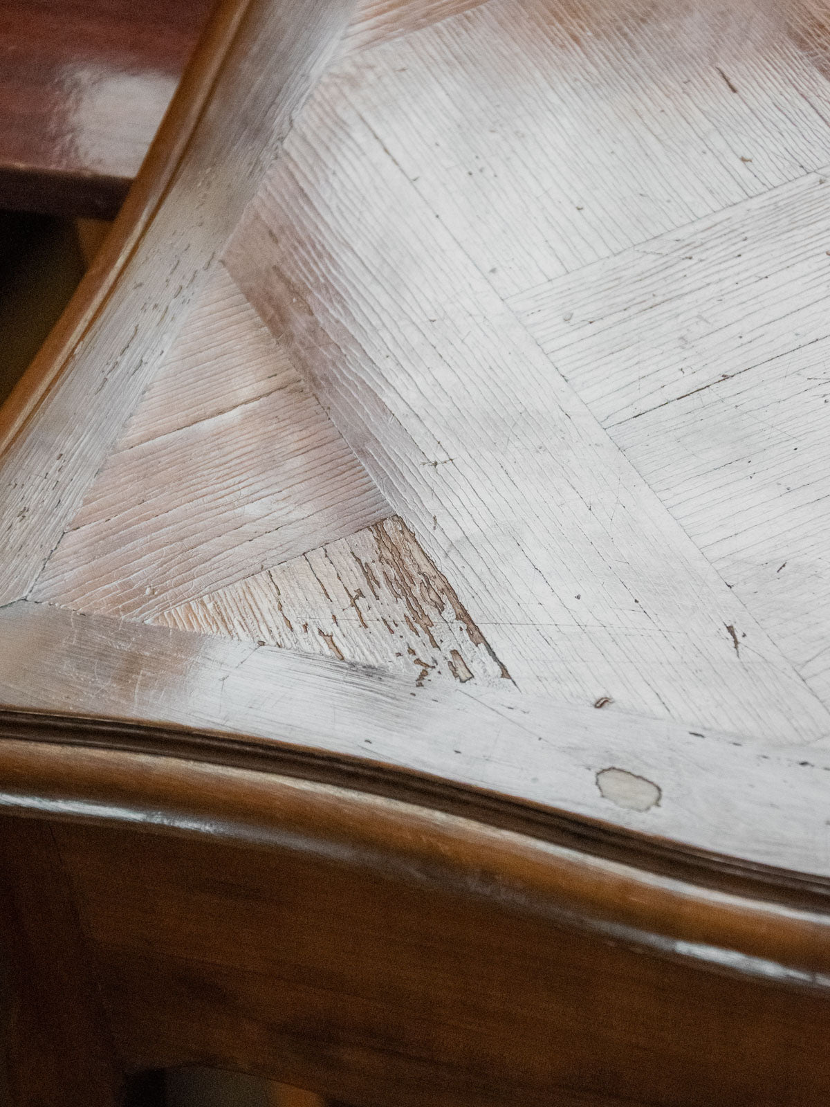 Offrez à votre intérieur un bureau Art déco aux angles striés, qui affirme sa silhouette grâce à une structure délicatement sculptée et un tiroir orné d'un motif floral finement travaillé, souligné par deux poignées en laiton. Son plateau propose un espace de travail accueillant, idéal pour un coin bureau intime ou une entrée stylisée, tandis que le tiroir offre un rangement discret pour vos essentiels. Des rayures et une feuille de bois abîmée sur le plateau témoignent de son histoire et lui confèrent du caractère. Quelques marques d'usage qui font son authenticité.