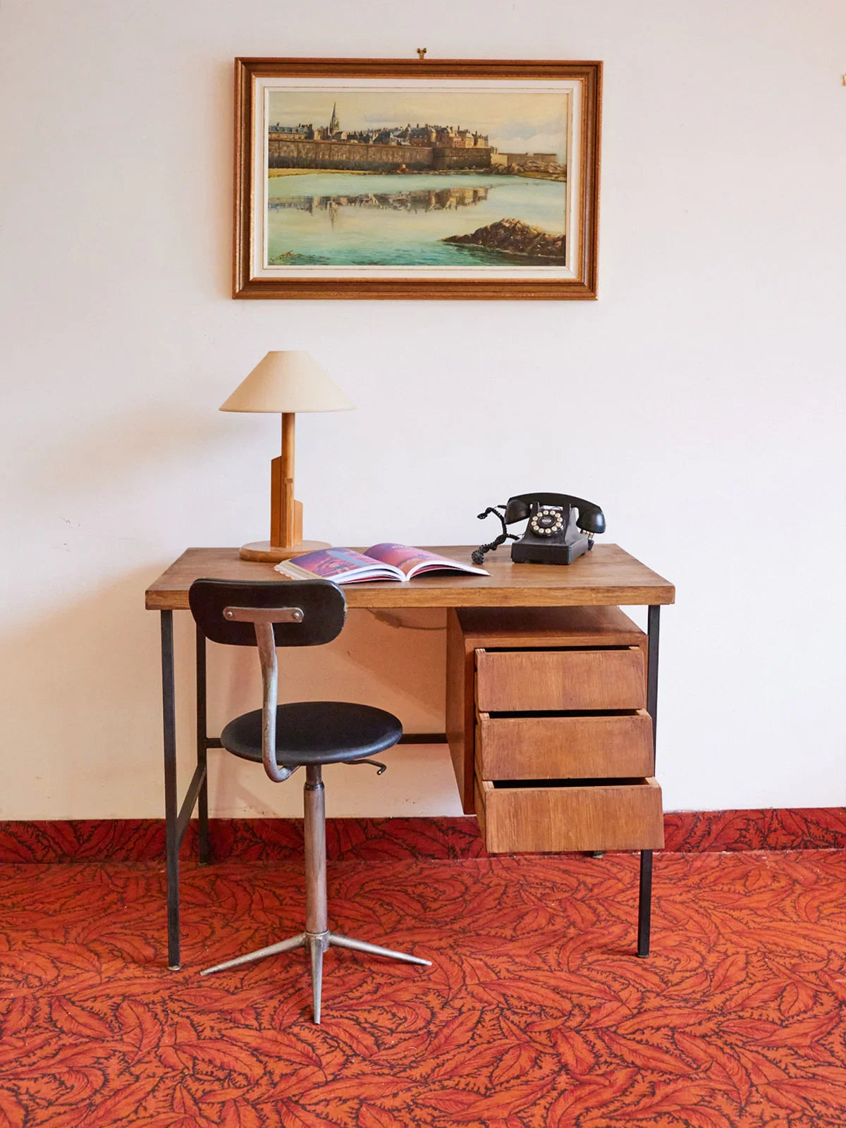 Adoptez ce bureau des années 50 à l'allure industrielle, soutenu par une structure en métal noir qui souligne sa silhouette rectangulaire et graphique. Ses trois tiroirs dissimulent un rangement pratique pour papiers et petits accessoires, tandis que sa proportion étudiée le rend parfait pour un coin travail, un atelier créatif ou un bureau d'appoint. Il instille une atmosphère sobre et inspirante, mêlant esprit vintage et fonctionnalité moderne.