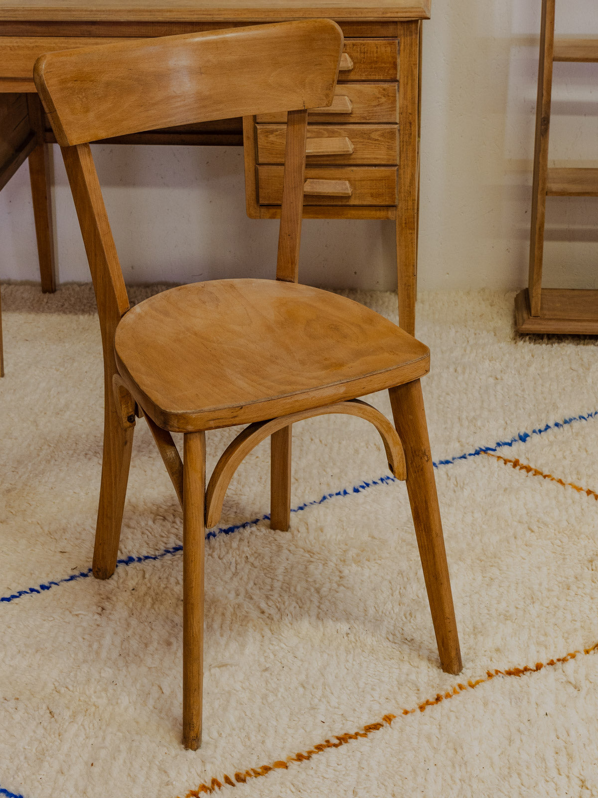 Adoptez ce lot bureau enfant et chaise en bois, aux lignes simples et chaleureuses, idéal pour un coin d'étude lumineux. Le bureau associe un tiroir en longueur et quatre tiroirs latéraux pour garder cahiers et fournitures rangés, tandis que la chaise, offre le confort. Le bois diffuse une ambiance douce et scandinave, facilement intégrable dans une chambre ou un espace pédagogique. Quelques traces du temps présentes.
