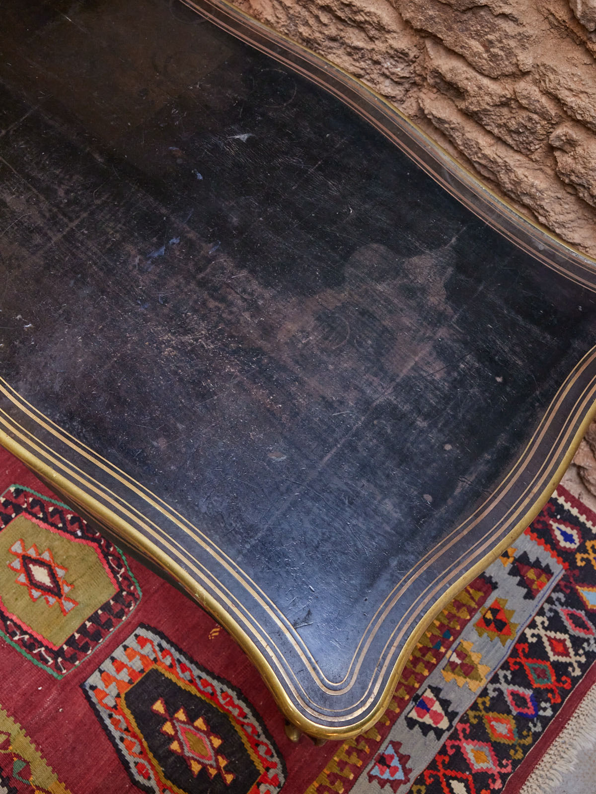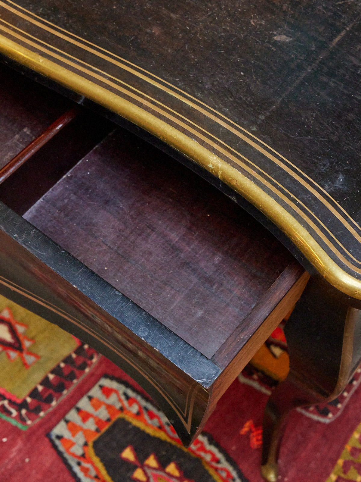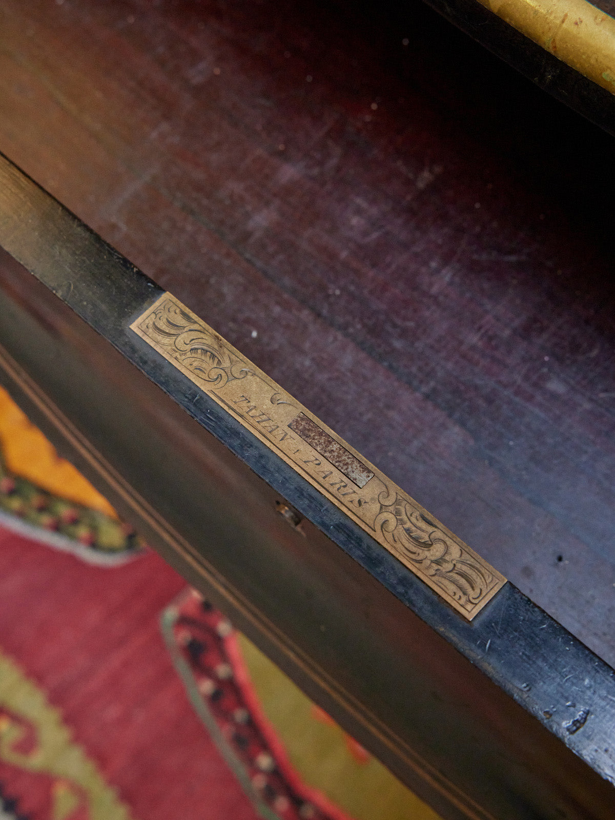 Découvrez ce bureau d'époque Napoléon III de la maison Tahan, daté de 1851-1870 et portant son estampille d'origine, mis en valeur par des liserets en cuivre parfaitement conservés. Le bois patiné lui confère une allure chaleureuse et élégante, tandis que ses proportions généreuses et son grand tiroir central offrent un rangement pratique pour documents et instruments d'écriture. Idéal pour un intérieur à l'esprit classique ou un cabinet raffiné, il apporte une présence historique et singulière.