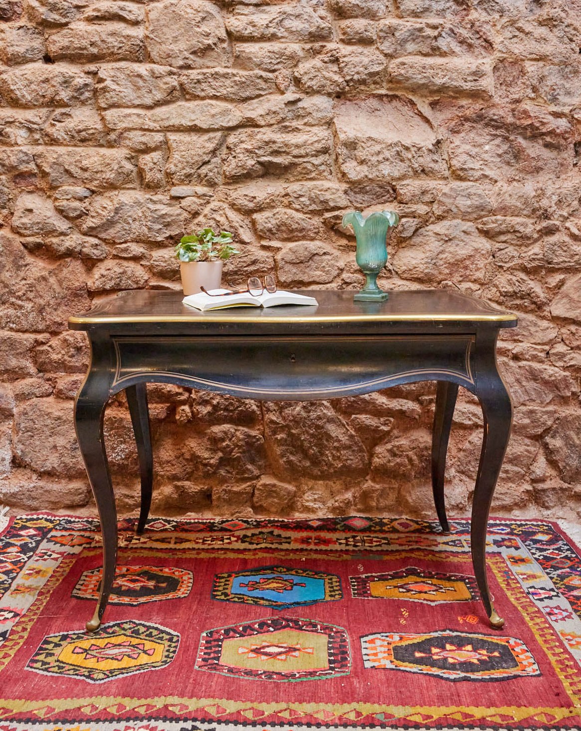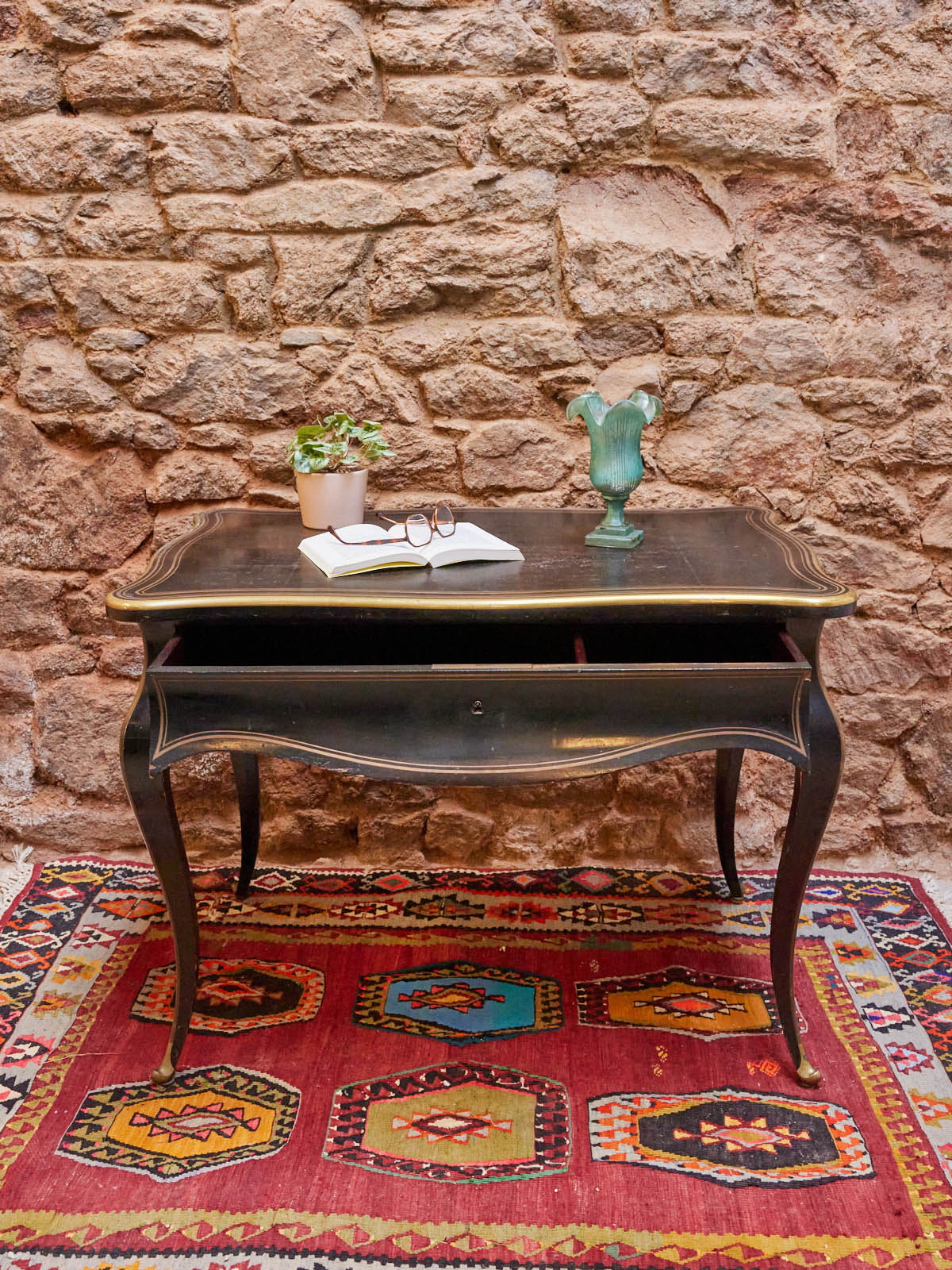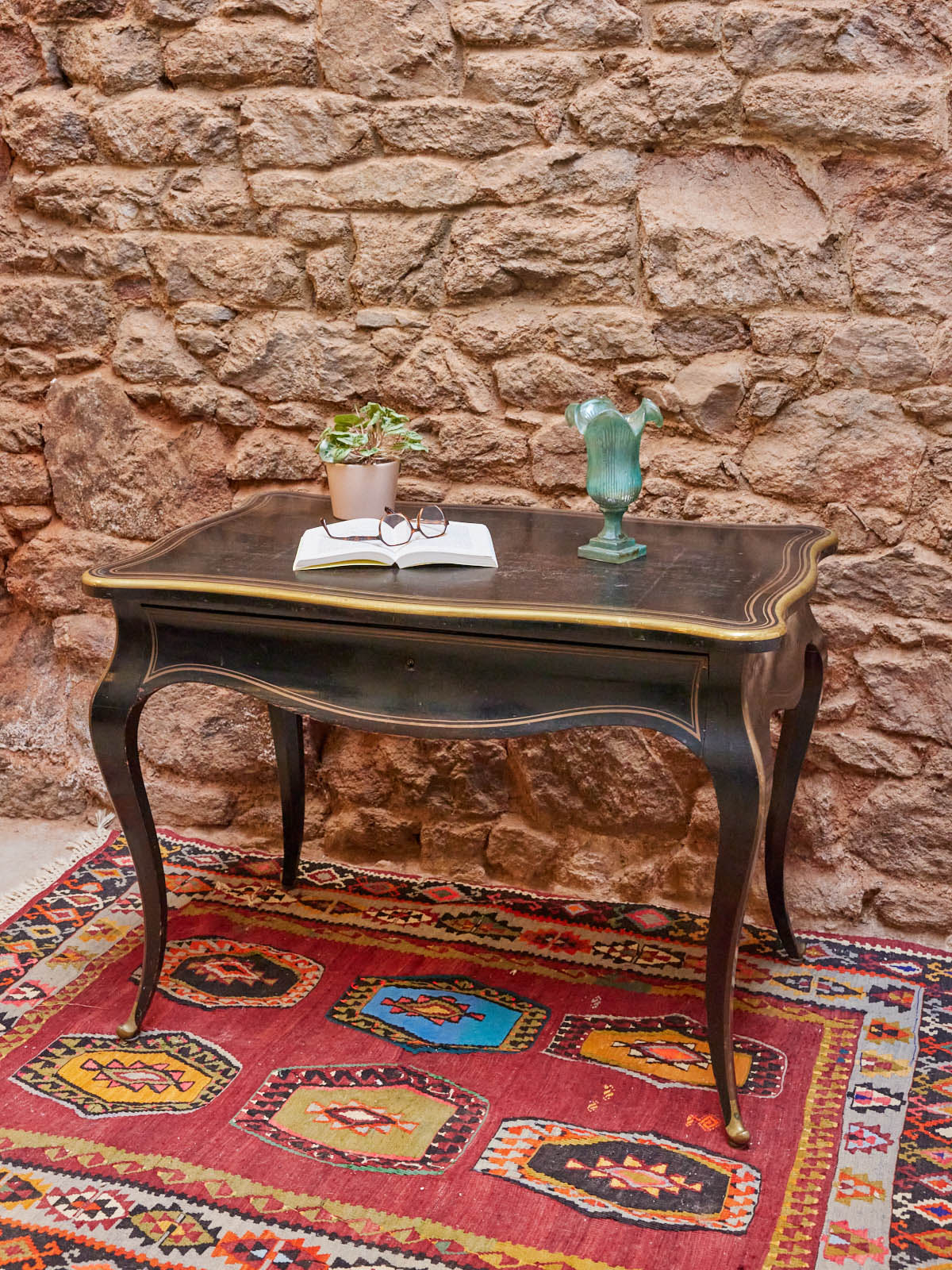 Découvrez ce bureau d'époque Napoléon III de la maison Tahan, daté de 1851-1870 et portant son estampille d'origine, mis en valeur par des liserets en cuivre parfaitement conservés. Le bois patiné lui confère une allure chaleureuse et élégante, tandis que ses proportions généreuses et son grand tiroir central offrent un rangement pratique pour documents et instruments d'écriture. Idéal pour un intérieur à l'esprit classique ou un cabinet raffiné, il apporte une présence historique et singulière.