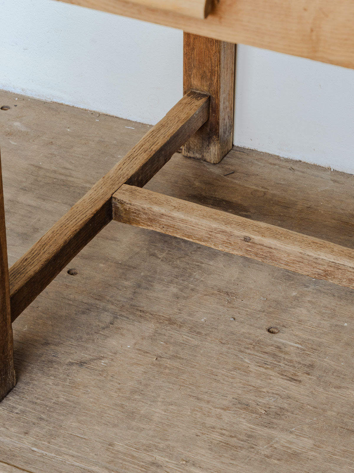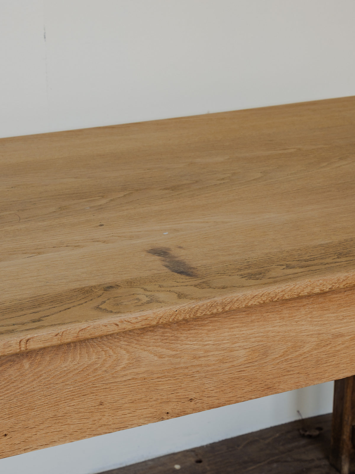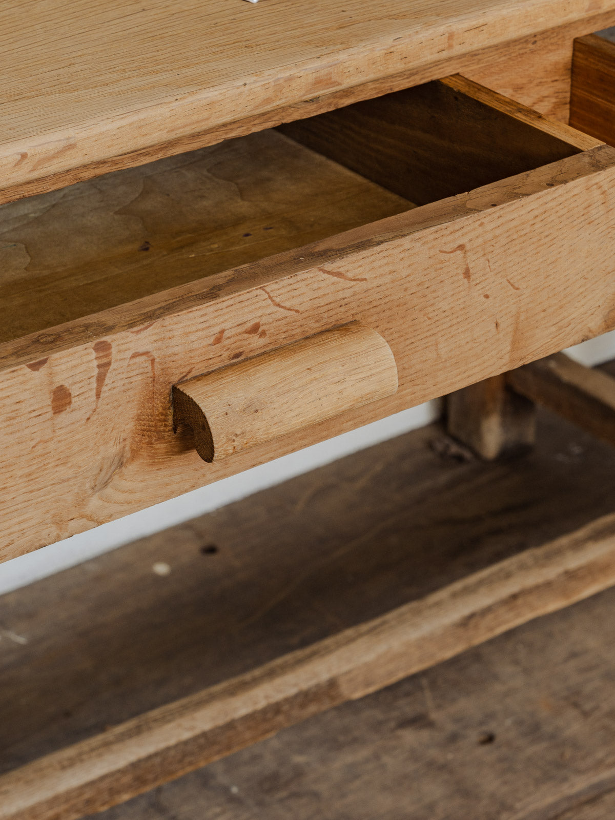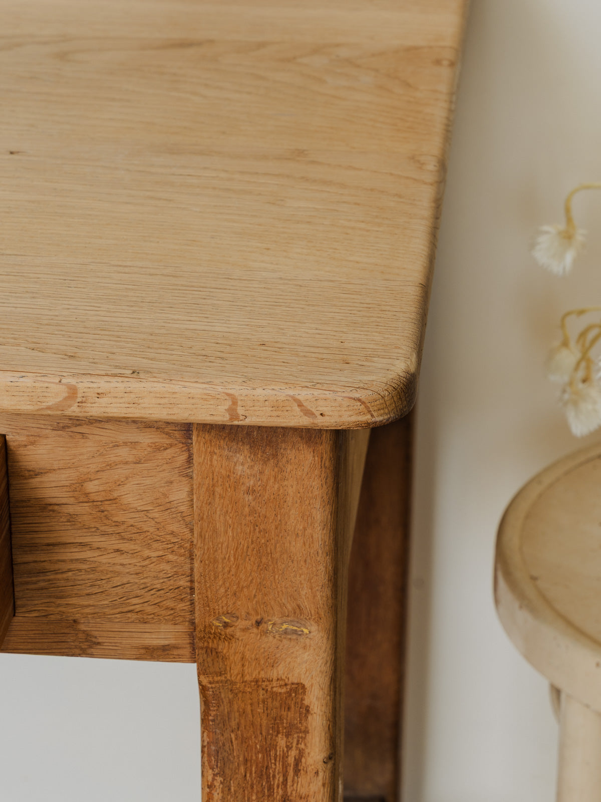 Adoptez ce bureau des années 60 en chêne, aux lignes sobres et à la chaleur du bois massif. Ses deux tiroirs dotés de poignées assorties offrent un rangement discret pour vos outils de travail, tandis que son plateau généreux accueille ordinateur, carnets et lampe pour une surface de travail confortable. Son design vintage s'intègre aussi bien dans un salon contemporain qu'un atelier d'écriture, apportant une ambiance élégante et inspirante. Légères traces du temps présentes.