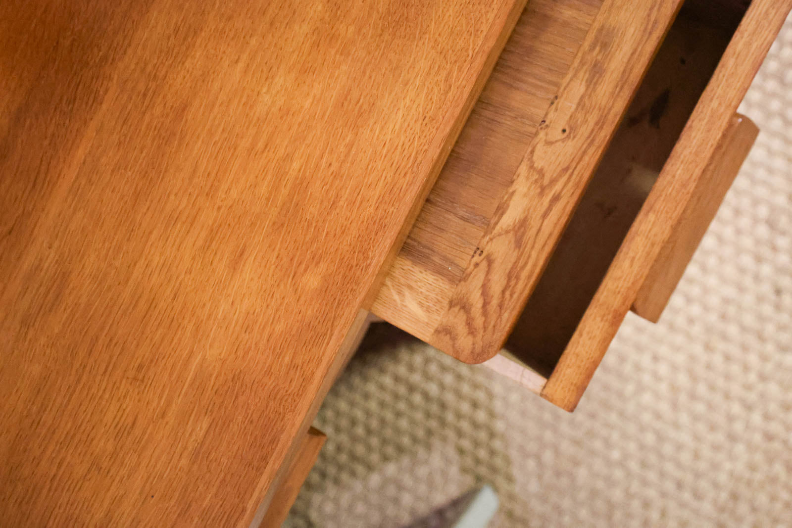 Adoptez ce bureau vintage en chêne au caractère chaleureux et aux lignes équilibrées. Son plateau profond et son format compact offrent une surface de travail confortable, tandis que la tablette et le grand tiroir accueillent dossiers et documents, les quatre petits tiroirs organisent fournitures et accessoires. Les proportions étudiées laissent une belle hauteur de jambes, idéale pour un usage quotidien, et le veinage naturel du chêne apporte une ambiance authentique et élégante.