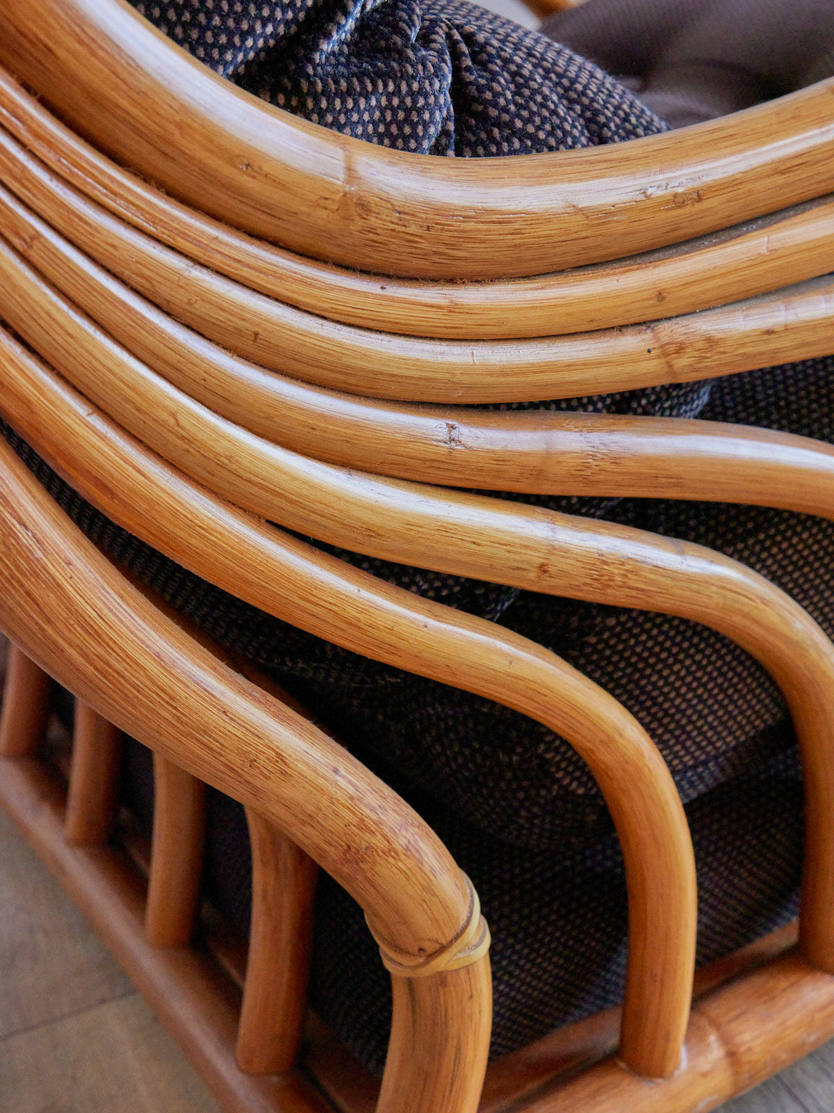 Adoptez ce fauteuil en bambou courbé des années 60 signé Maugrion, où l'élégance vintage rencontre une silhouette légère et graphique. La structure en bambou dessine des proportions enveloppantes tandis que le tissu marron et l'assise confortable en deux parties invitent à la pause, idéale dans un salon, un coin lecture ou une véranda. Sa patine naturelle apporte une ambiance chaleureuse et authentique, parfaite pour une décoration inspirée et raffinée.