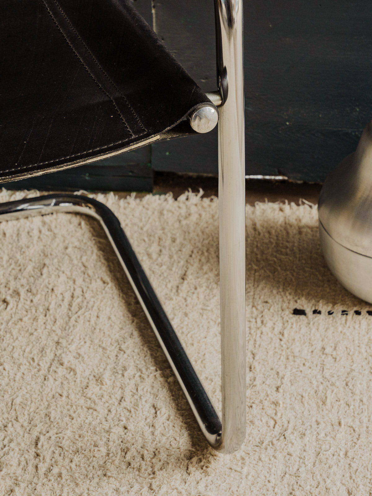 Adoptez cette chaise vintage en cuir noir et pieds en métal argenté, au design sobre et élégant qui apporte une présence de caractère à votre intérieur. Sa silhouette et son assise conviennent parfaitement à une table, un bureau ou un salon contemporain, offrant un confort immédiat sans alourdir l'espace. Le cuir patiné confère une belle texture et un caractère affirmé, créant une atmosphère chaleureuse et raffinée. Légères traces du temps présentes.