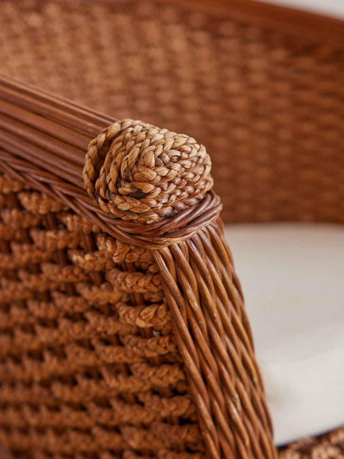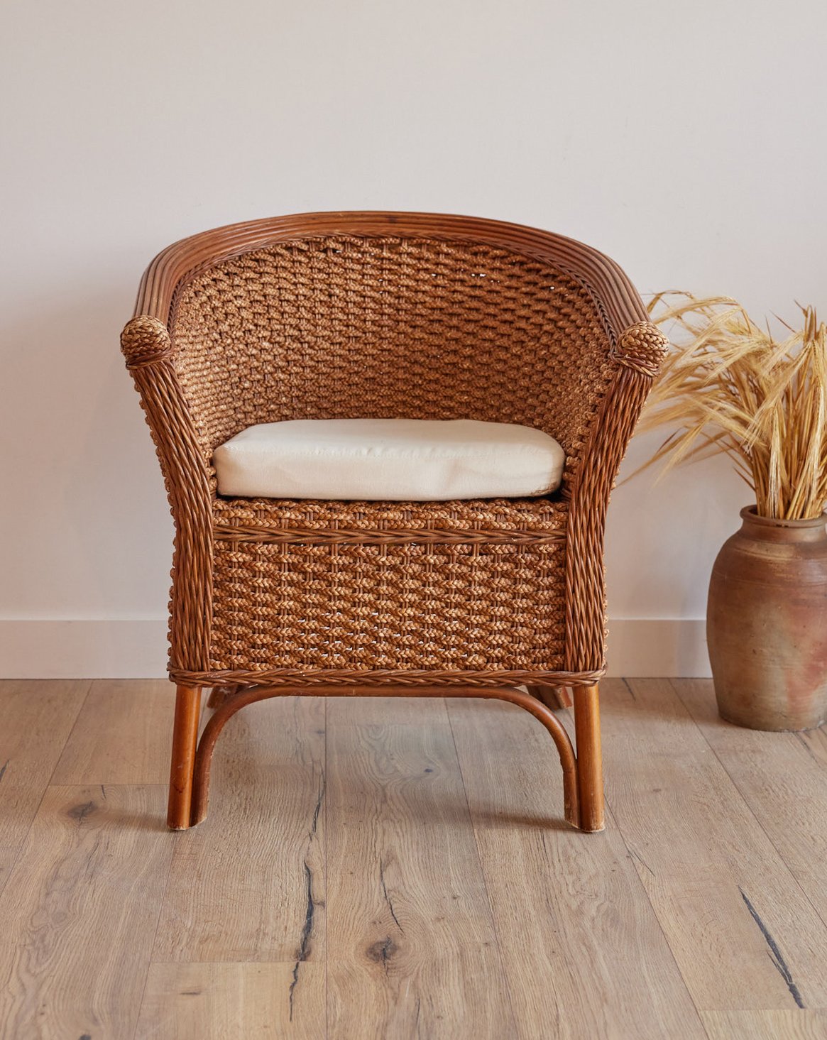 Adoptez ce fauteuil en osier tressé, à la forme arrondie qui invite à la détente et crée une silhouette légère dans la pièce. Le tressage naturel et la structure enveloppante offrent une assise confortable, idéale pour un coin lecture ou une pause tranquille dans le salon ou la véranda. Son allure artisanale apporte une note chaleureuse et authentique, parfaite pour une décoration bohème-chic ou contemporaine épurée.