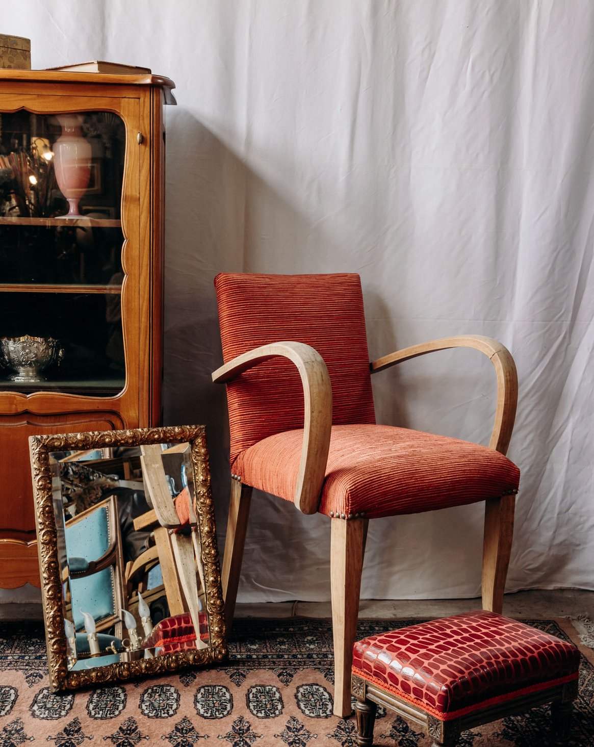 Adoptez ce fauteuil bridge en bois clair retapissé d'un tissu rouge chaleureux, dont le dossier et l'assise offrent une assise accueillante et structurée. La structure en bois souligne des lignes simples et élégantes tandis que les petits clous apportent une finition soignée, entre tradition et modernité. Sa proportion compacte le rend idéal pour un coin lecture, un bureau ou une entrée, apportant une touche de couleur et de caractère à votre intérieur.