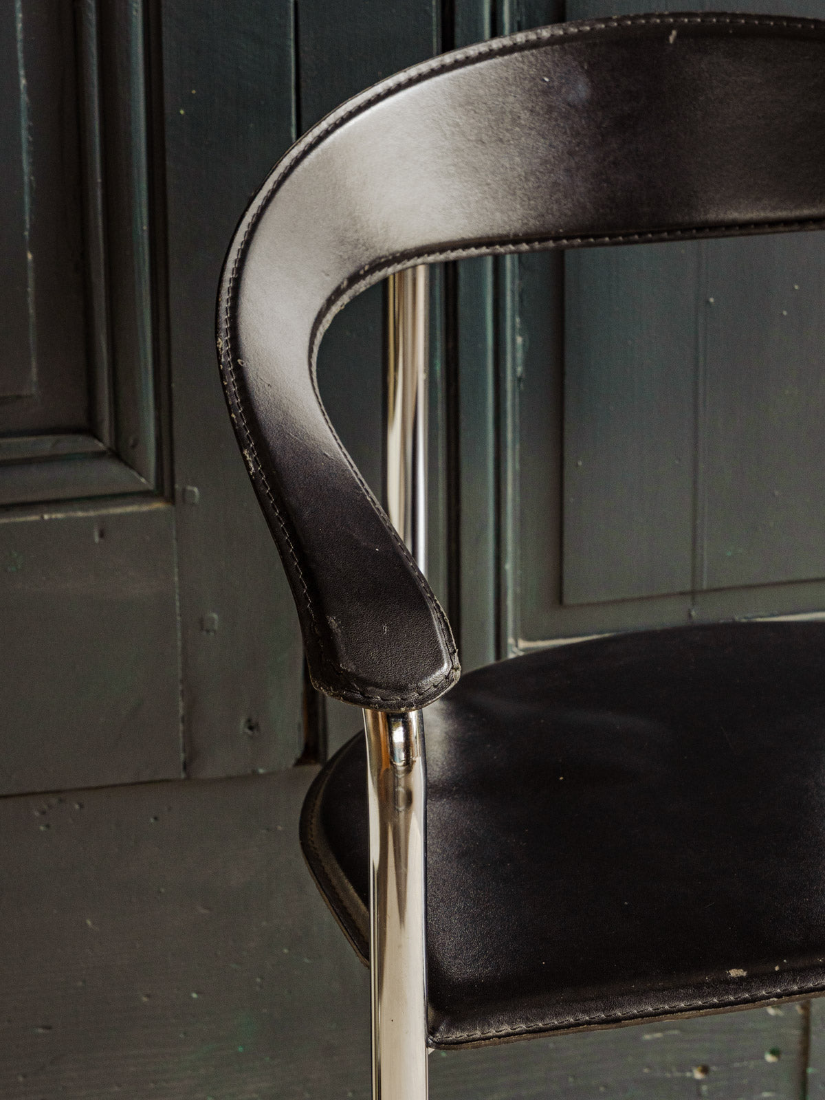 Adoptez ce fauteuil vintage en simili cuir noir et piètement chromé, au design rétro aux lignes sobres et graphiques. Son assise enveloppante et l'allure élancée du châssis lui confèrent une présence élégante, parfaite pour un bureau, une salle à manger ou un coin lecture. Les matériaux contrastés — simili cuir et métal chromé — apportent une touche urbaine et lumineuse à la pièce.