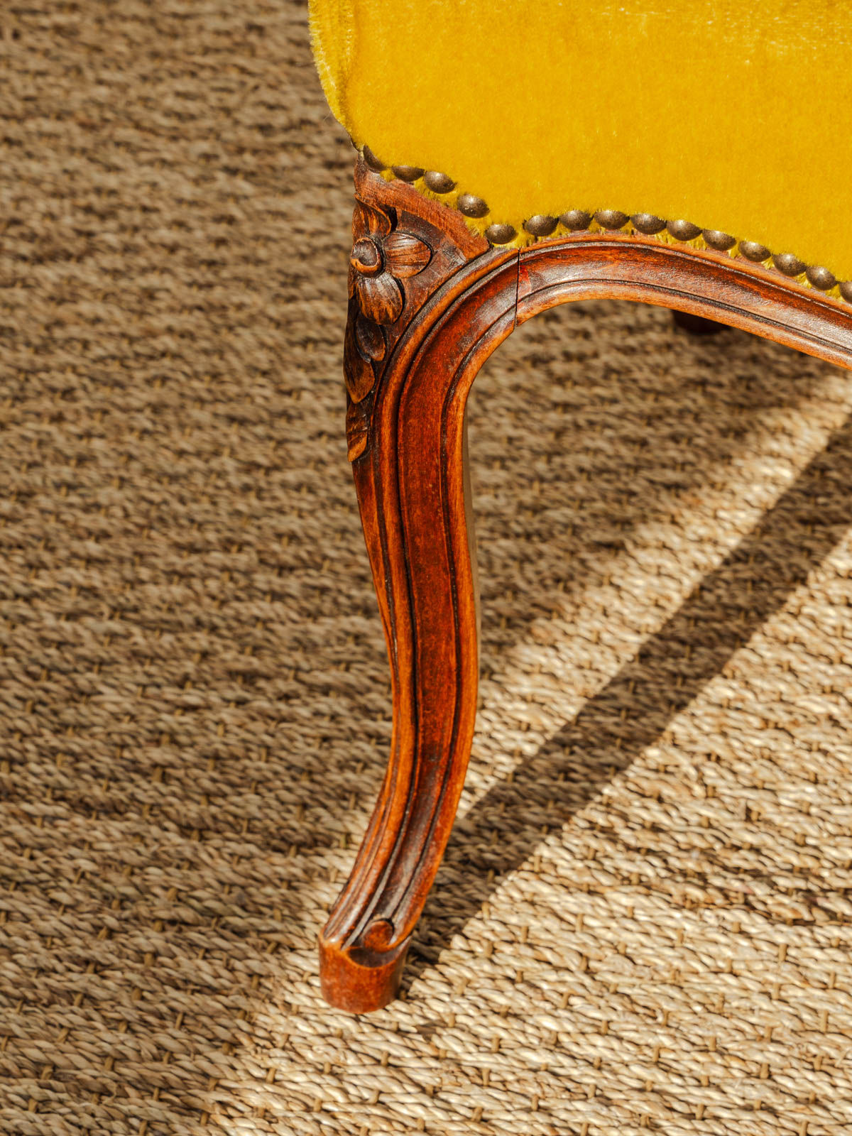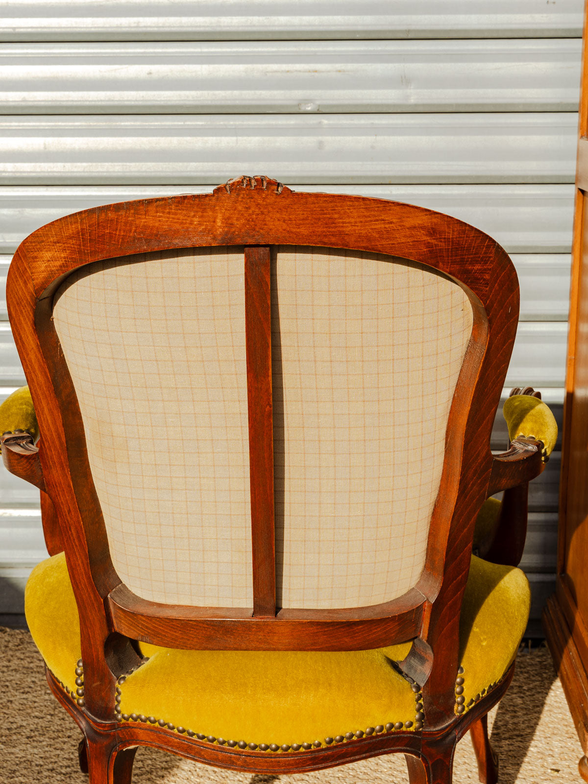 Découvrez ce fauteuil bergère style Louis XV, entièrement retapissé en velours jaune-vert apporte une note douce et contemporaine. Sa structure sculptée et la finition cloutée soulignent le travail d'ébénisterie et l'élégance des lignes classiques. Format idéal et assise enveloppante, parfait pour un coin lecture ou pour ponctuer un salon sans encombrer l'espace. Légères traces du temps qui participent à son charme.