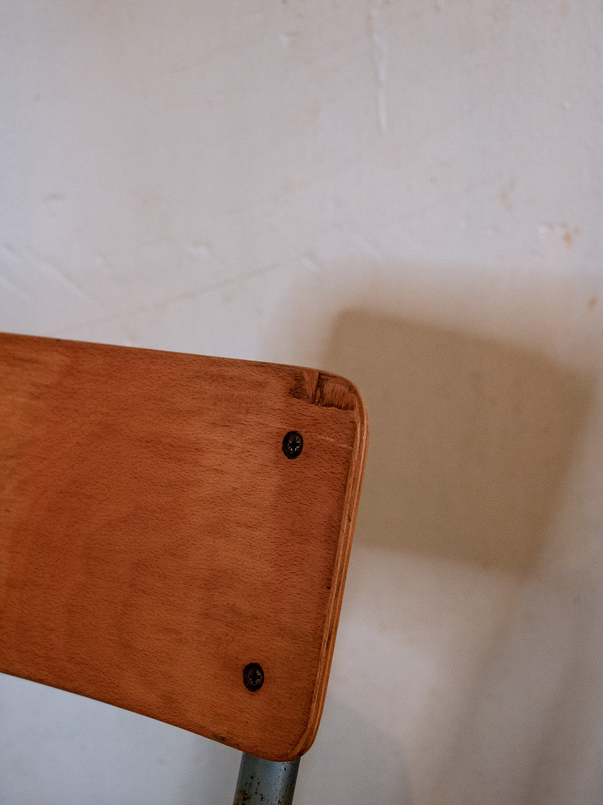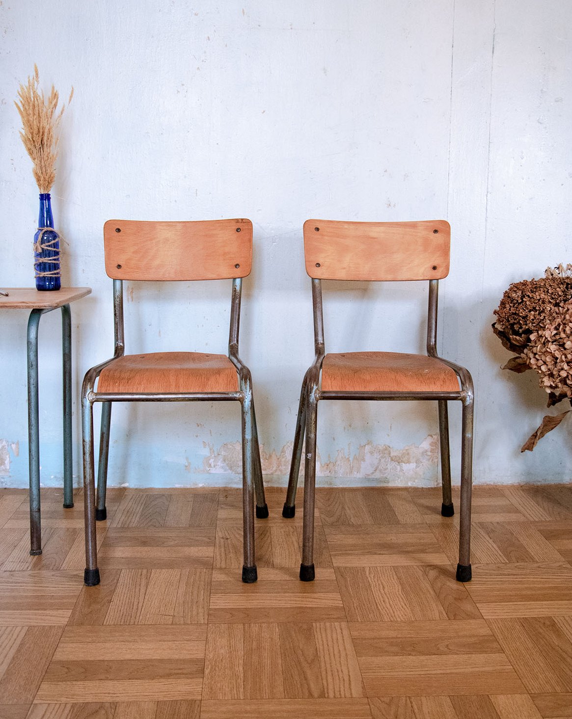 Découvrez cette paire de chaises d'écolier, mêlant bois et métal gris-vert pour une esthétique rétro et accueillante. Le format compact et l'assise basse les rend parfaites pour une chambre d'enfant, un coin bureau ou une table de petite taille. A noter qu'une petite partie de plaquage est enlevé sur le dossier d'une des chaises.