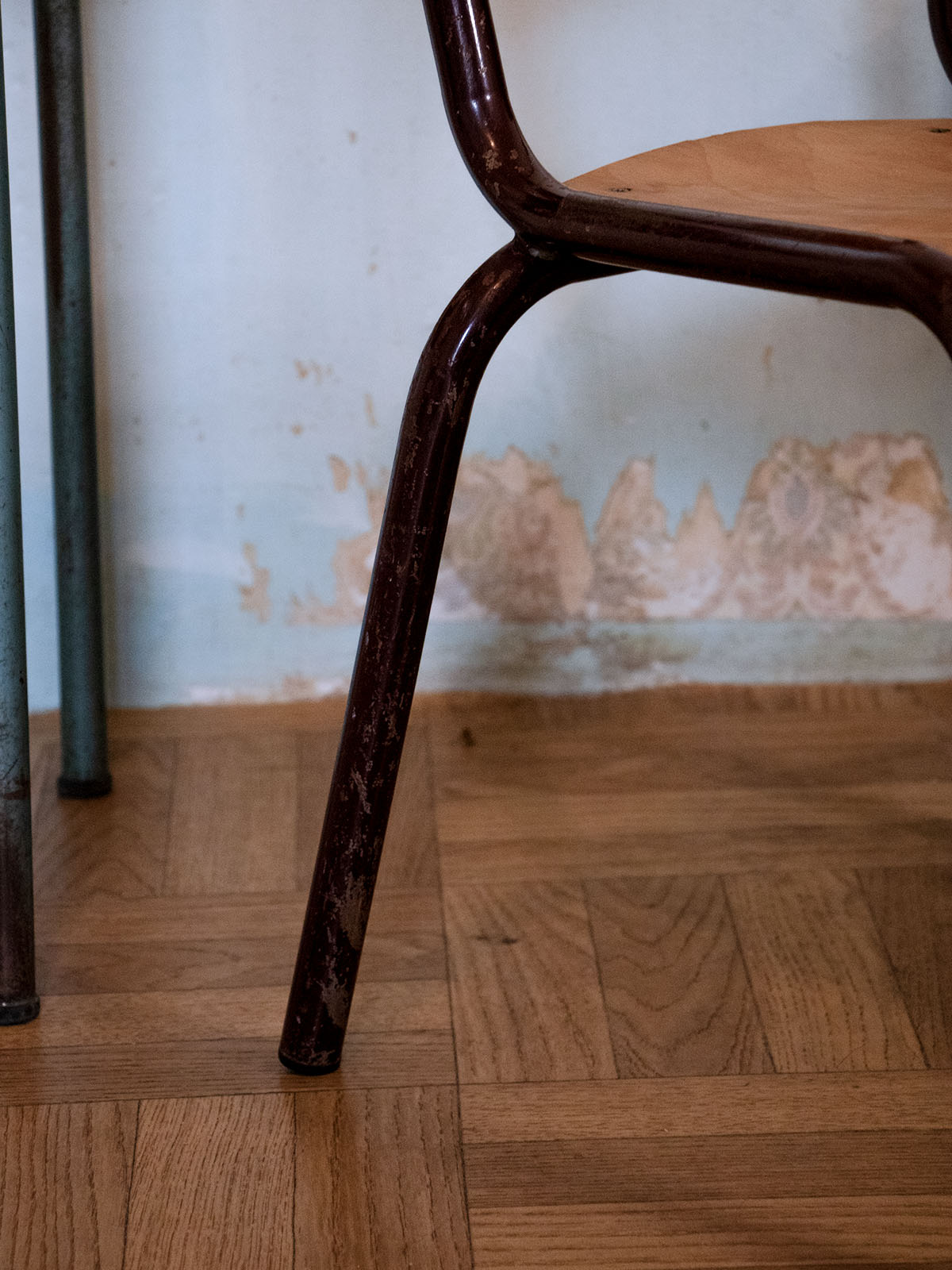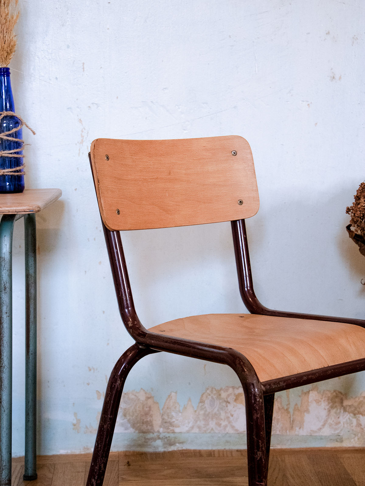 Adoptez cette chaise d'écolier tubulaire en bois clair et métal bordeaux, un clin d’œil nostalgique aux salles de classe d'antan. Sa structure fine en métal et son assise en bois offrent une silhouette légère et proportionnée, idéale pour un bureau compact, une chambre d'enfant ou un coin lecture, apportant une touche rétro et fonctionnelle à votre intérieur. Les teintes naturelles du bois se marient au bordeaux profond pour une présence équilibrée. Traces d'usure sur le métal.
