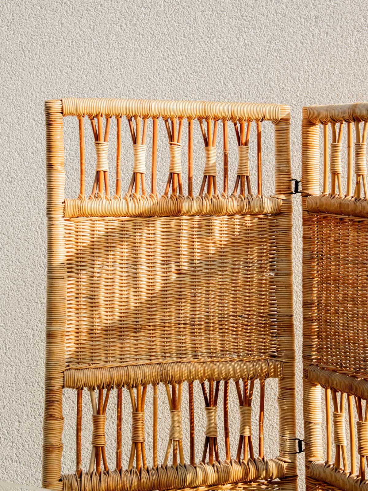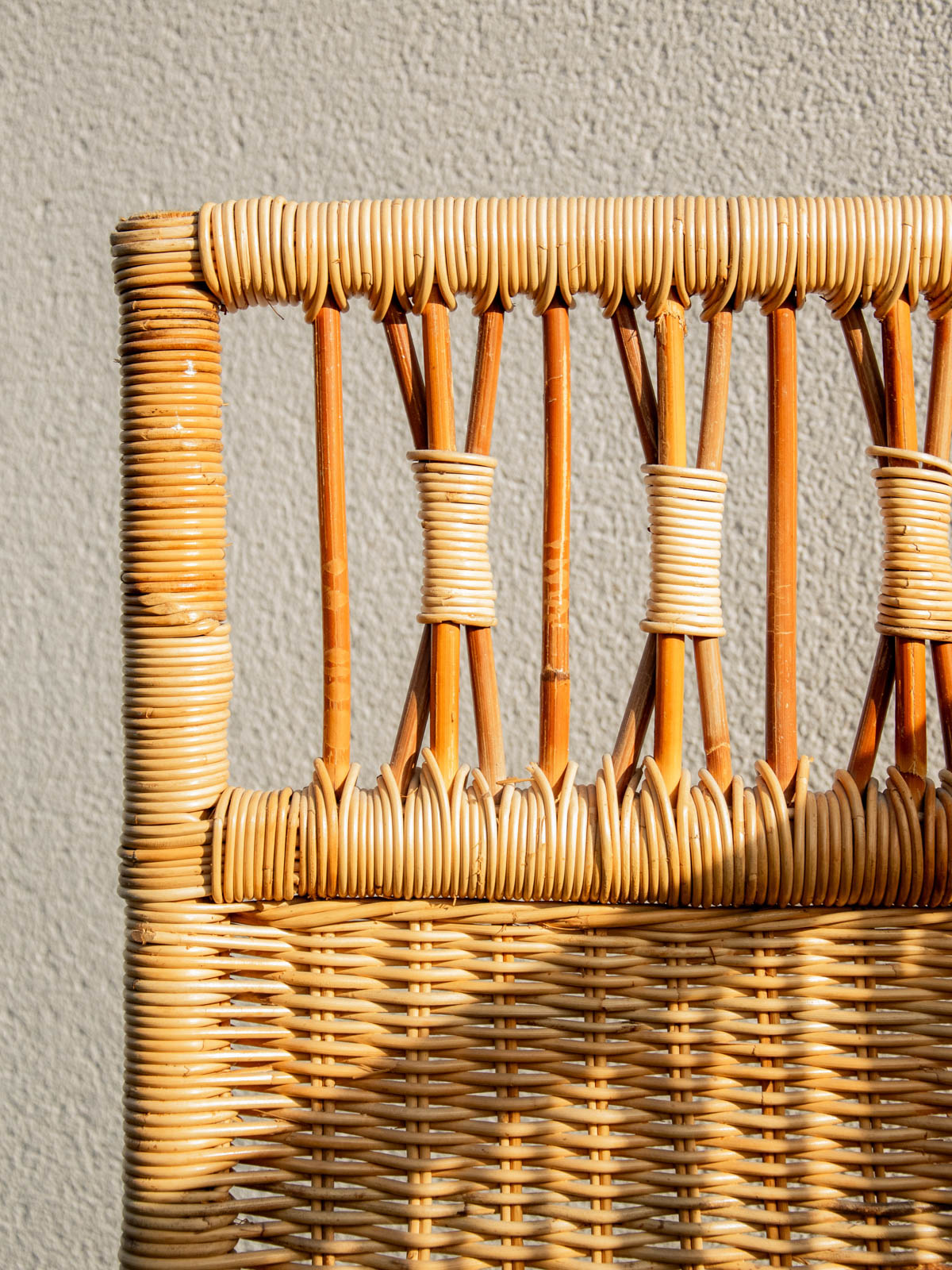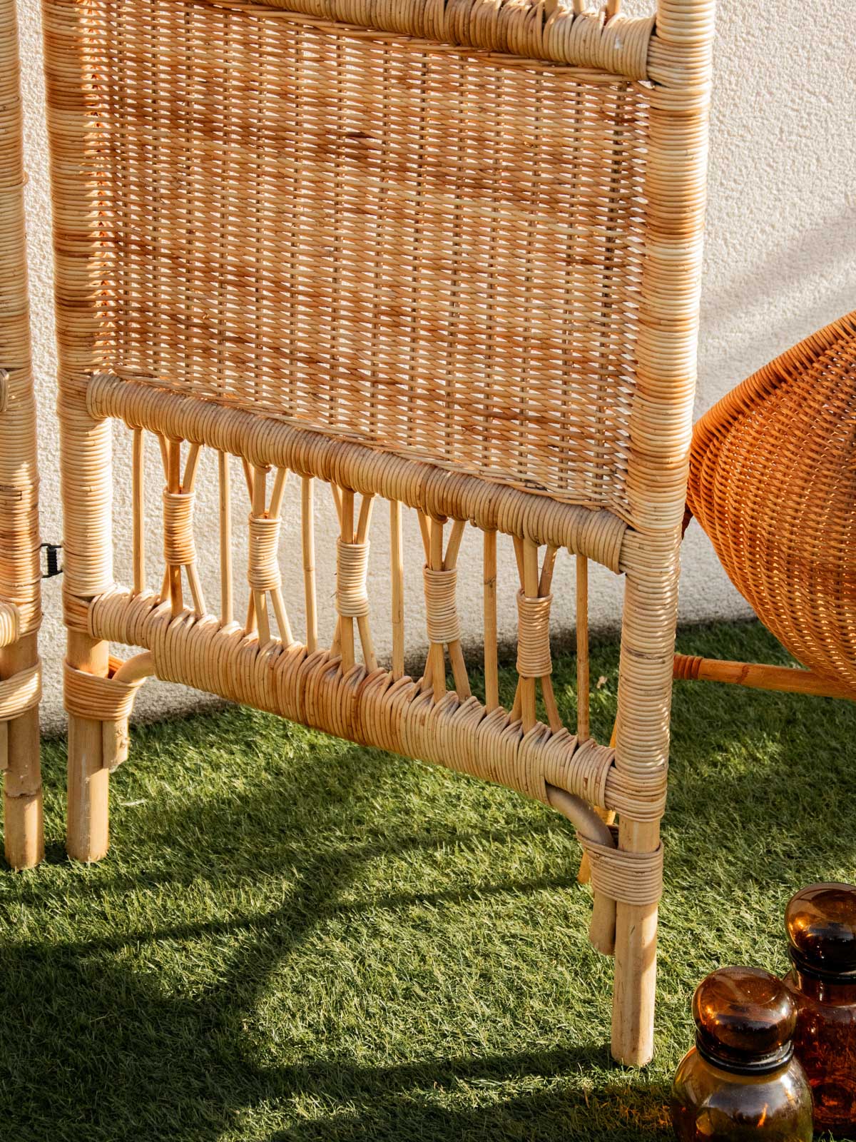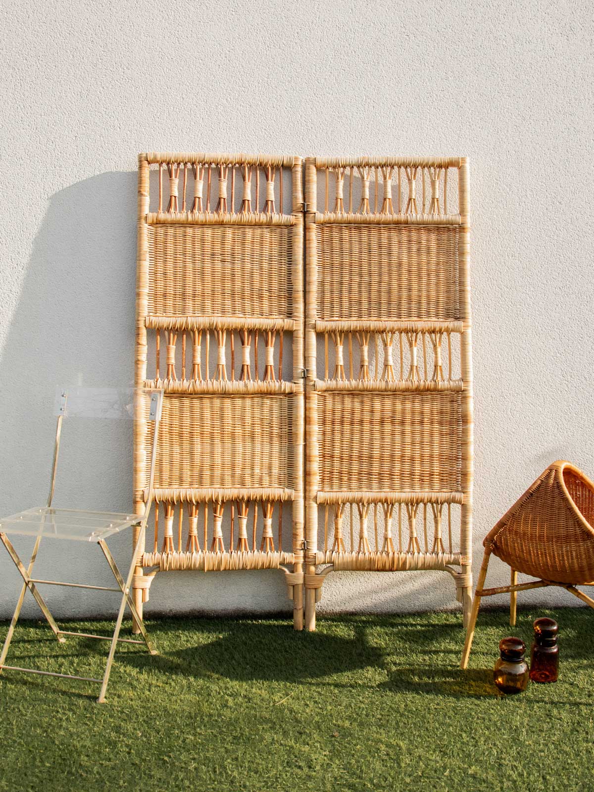 Ajoutez à votre intérieur ce paravent vintage en rotin et bambou au charme bohème, dont le tressage fin et régulier rappelle les fabrications des années 1960–1970. Composé de deux panneaux pliants, il se déplace aisément et se prête comme séparation de pièce, brise-vue ou tête de lit détournée, apportant une présence légère tout en restant stable. Les ligatures et le cannage révèlent un travail artisanal soigné, et sa patine naturelle confère chaleur et caractère à vos intérieurs.