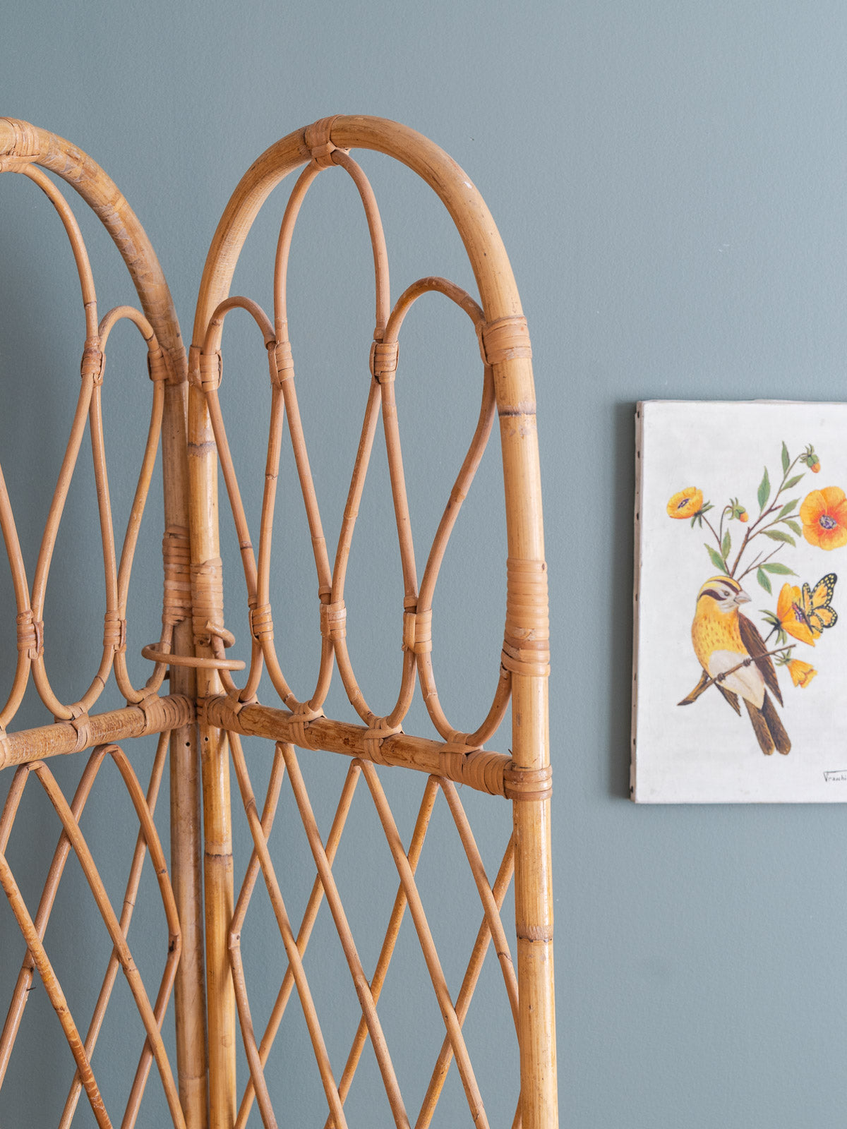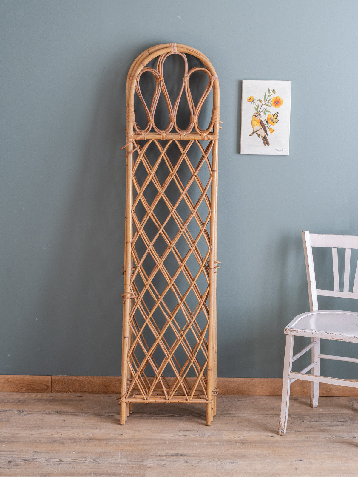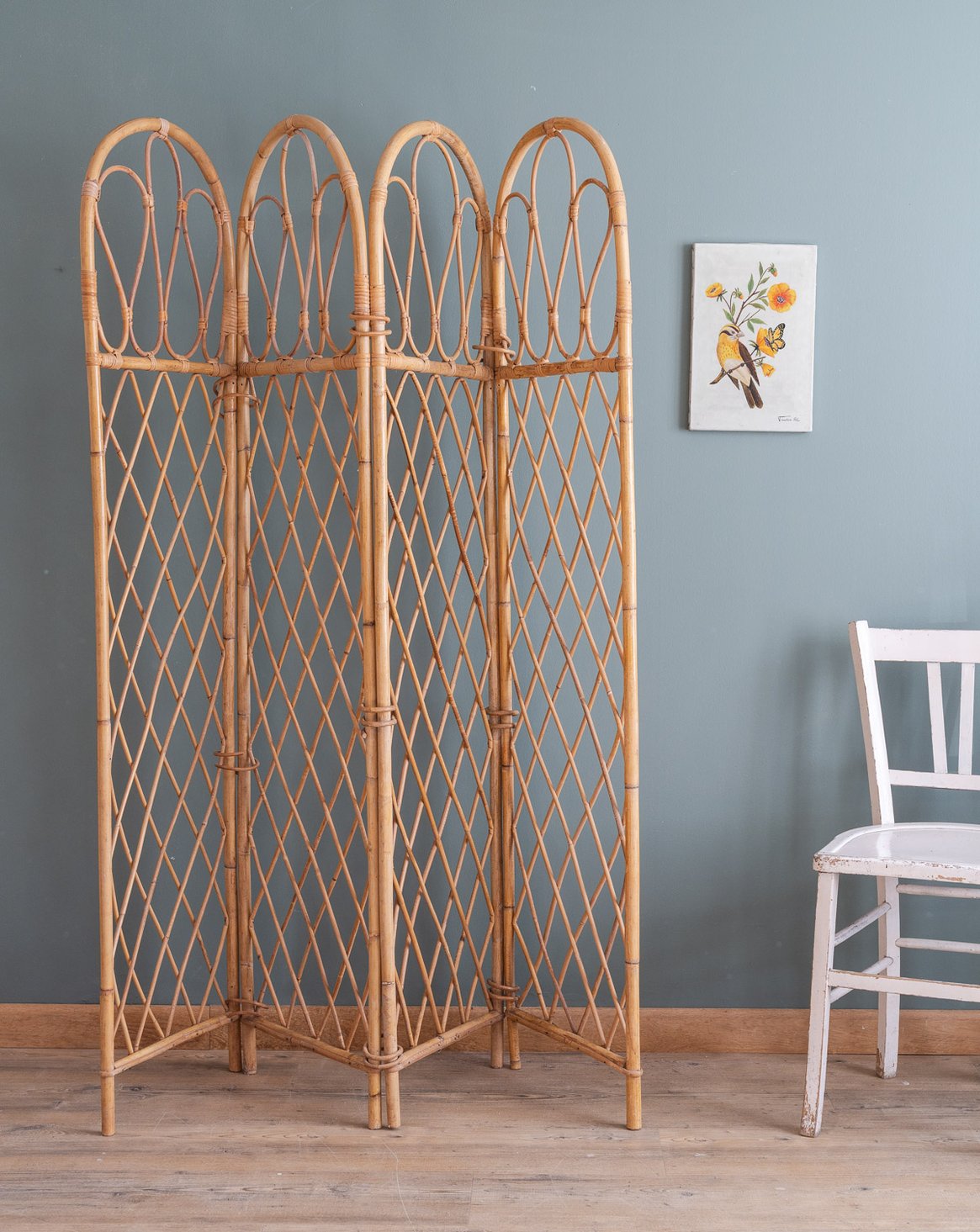 Adoptez ce paravent ancien en rotin, composé de quatre vantaux aux montants supérieurs courbés et d'un tressage quadrillé qui capte la lumière. Léger et modulable, il se déploie pour créer une séparation intime ou un coin lecture tout en se repliant facilement pour le rangement, offrant des proportions adaptées à une chambre, un salon ou une entrée. Son allure naturelle apporte une touche bohème-chic et chaleureuse, idéale pour structurer l'espace sans l'alourdir.