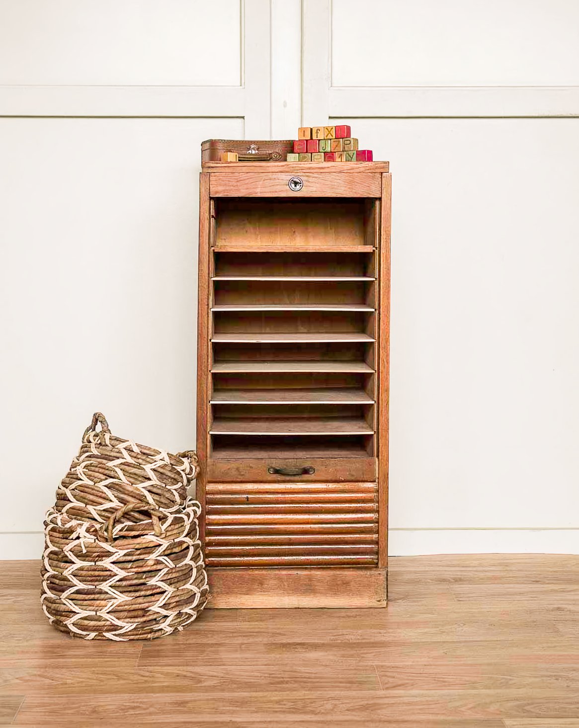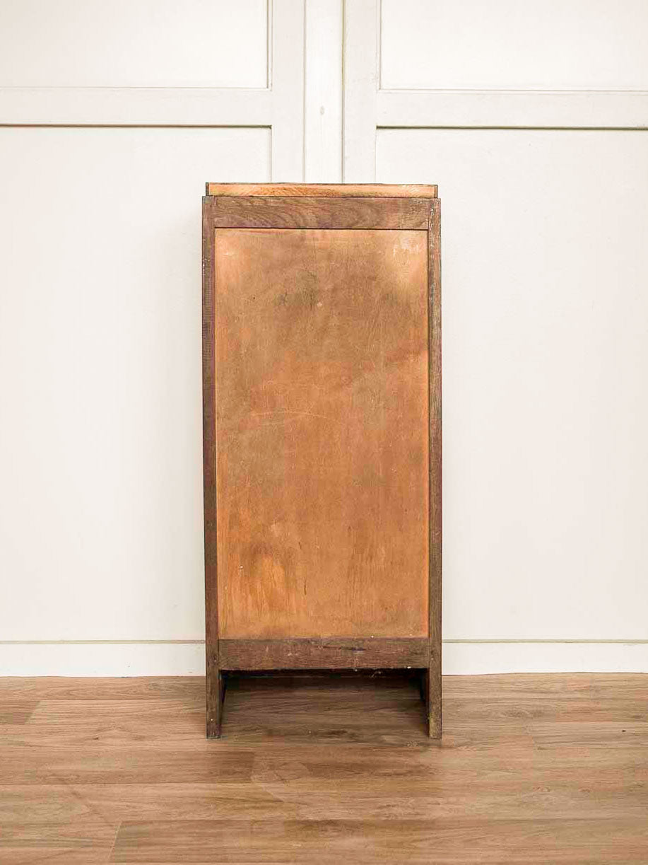 Découvrez ce meuble de métier, classeur à rideau en bois, compact et vertical, pensé pour ranger dossiers, livres ou petits objets grâce à ses neuf étagères. Le volet roulant en bois et la poignée en métal lui confèrent une allure à la fois organique et fonctionnelle, avec des étagères amovibles pour ajuster le rangement. La serrure est hors service mais le rideau se maintient fermé, la clé est fournie, et le volet peut résister légèrement en fin de déroulé. Idéal pour un coin bureau, une entrée ou une cuisine en quête d’un meuble utile au style discret et authentique. Légères traces du temps qui participent à son charme.