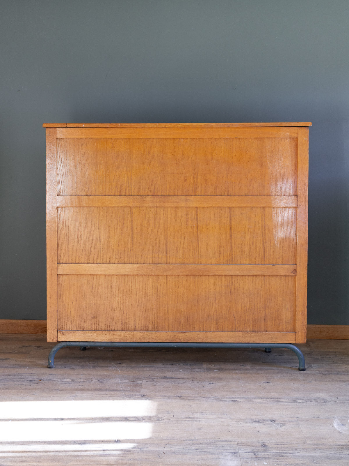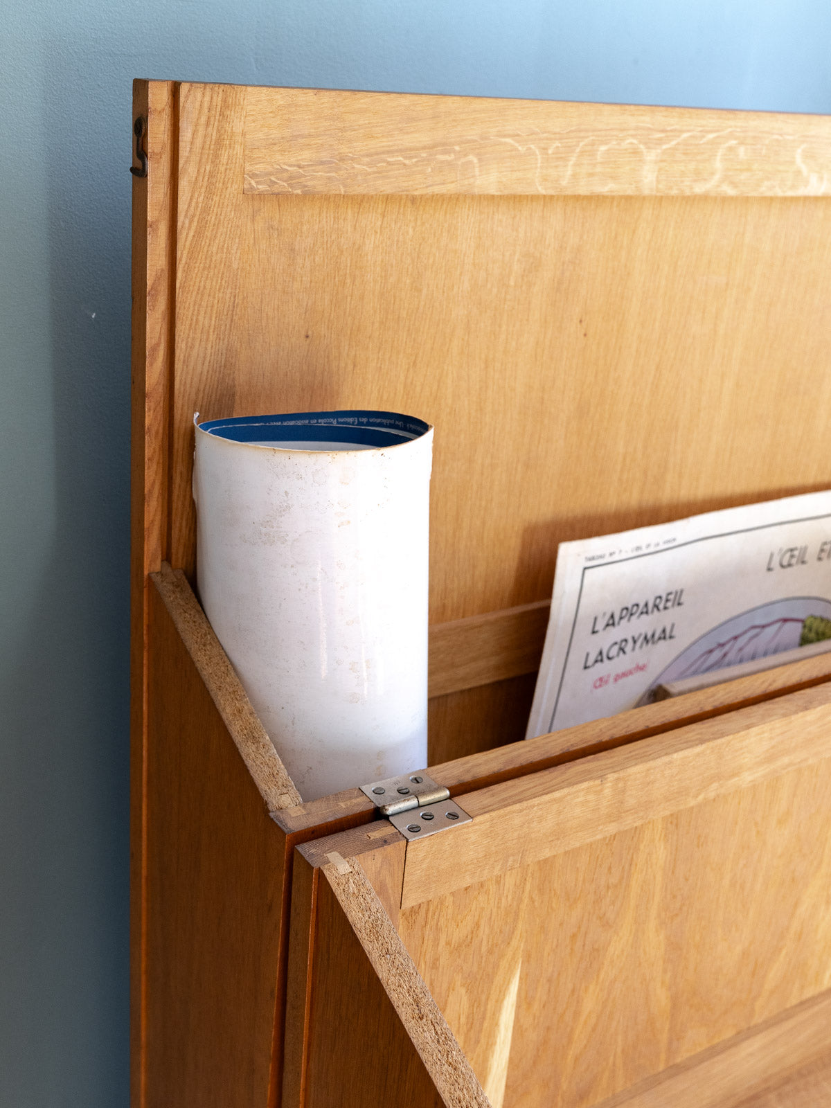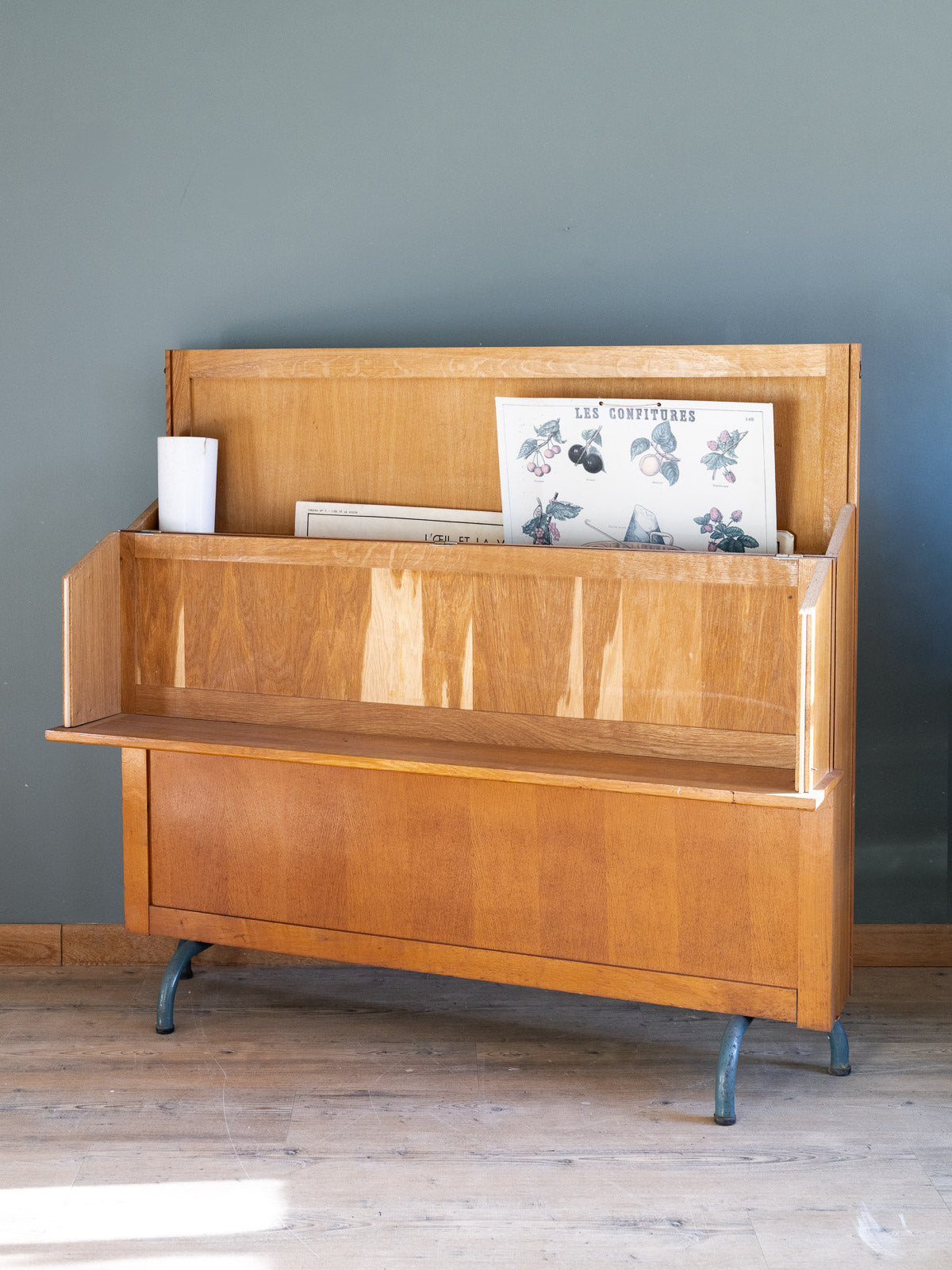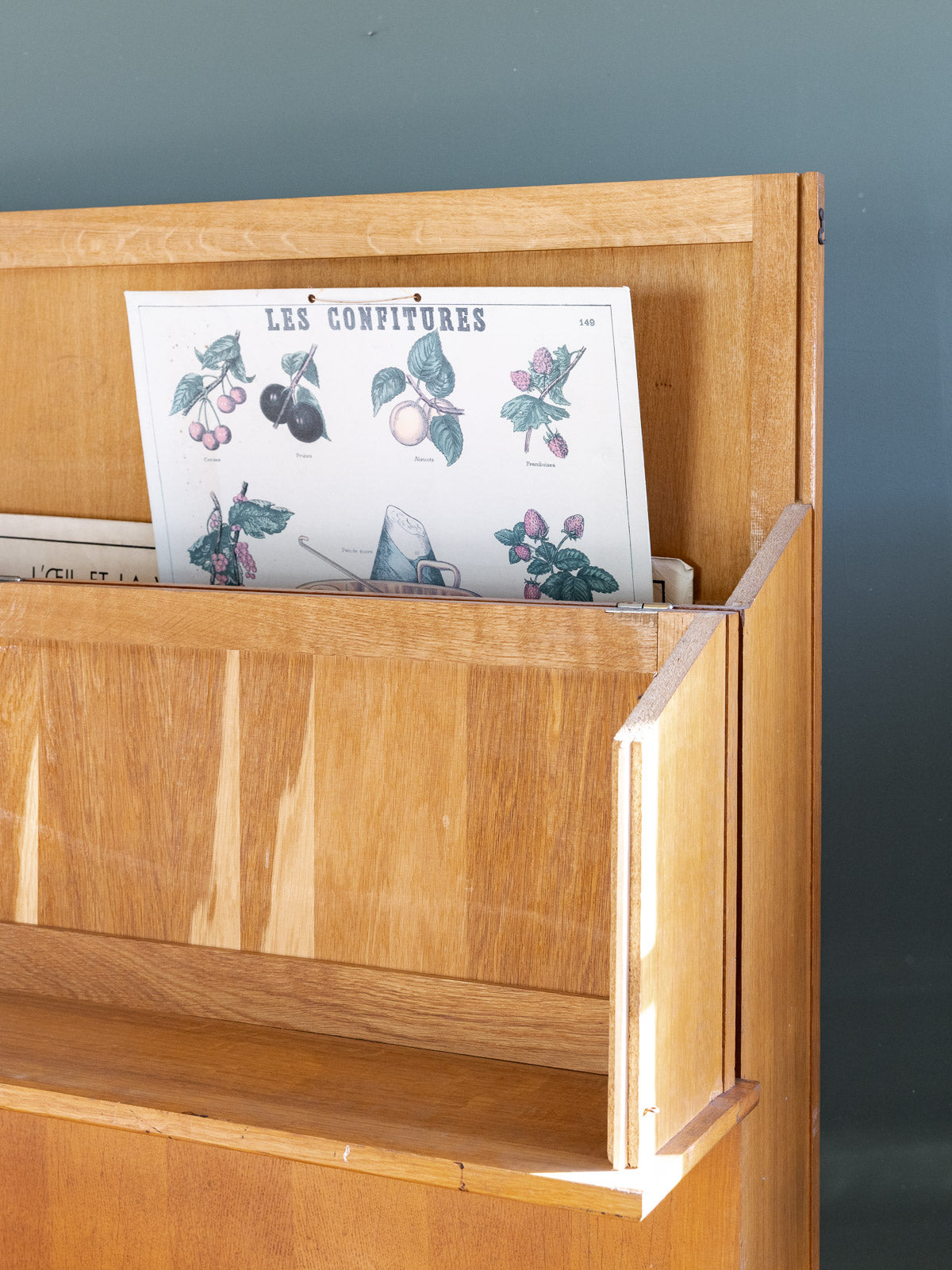 Invitez ce meuble à affiches scolaires vintage en bois, posé sur ses pieds en métal vert au charme d'école, qui apporte immédiatement une note graphique et nostalgique à votre intérieur. Son format vertical et étroit offre une large surface d'exposition pour affiches, documents ou objets, tandis que le plateau supérieur s'ouvre jusqu'à mi-hauteur pour un accès pratique et modulable. Idéal en entrée, bureau ou salon pour une mise en scène authentique. Quelques marques d'usage qui font son authenticité.