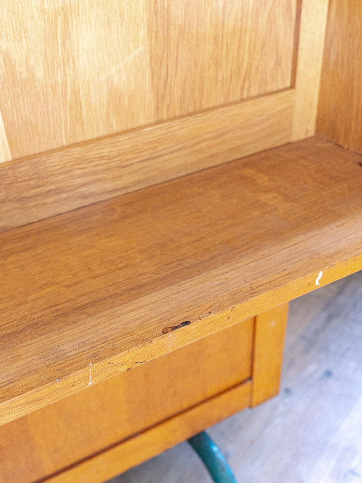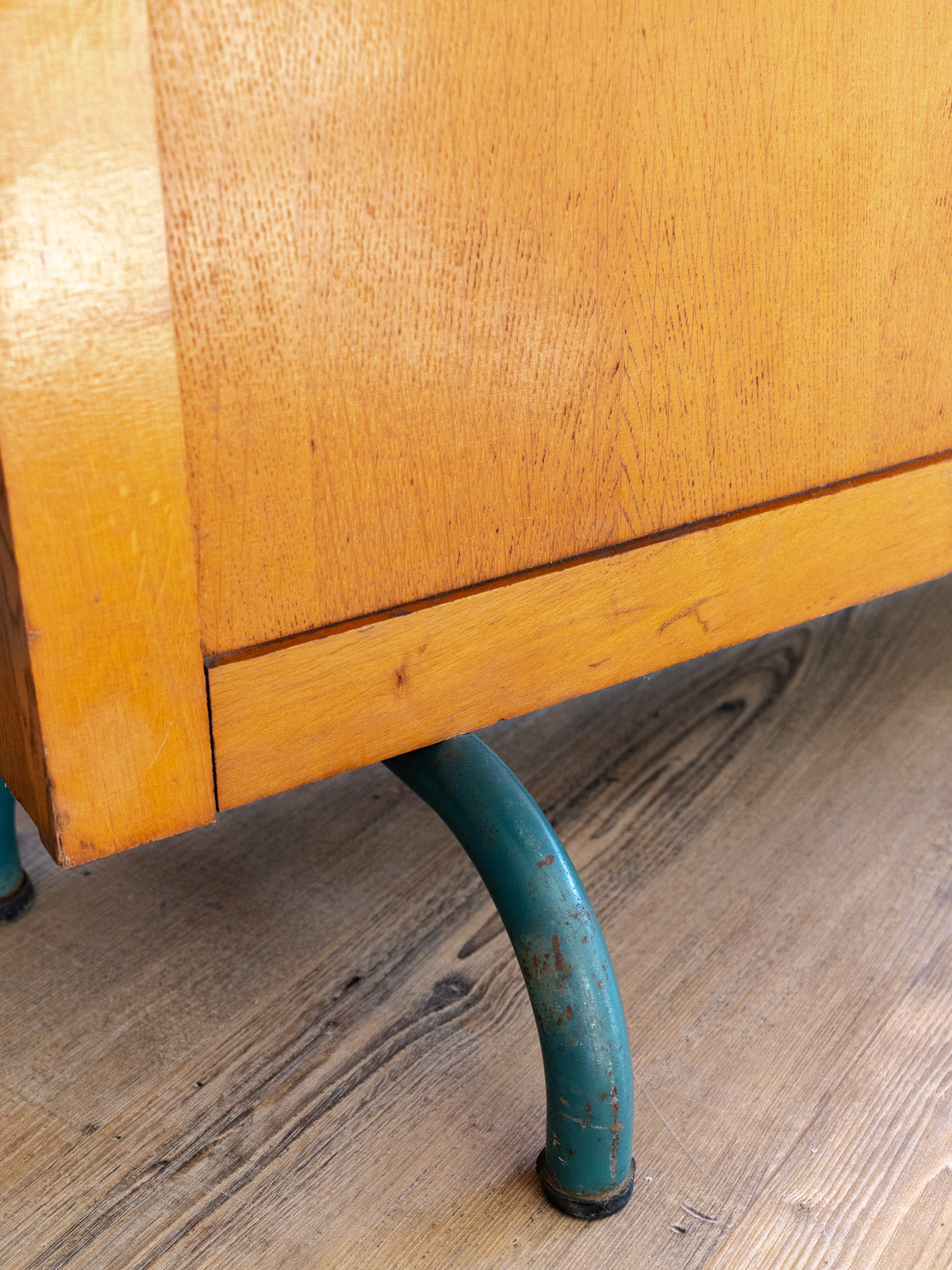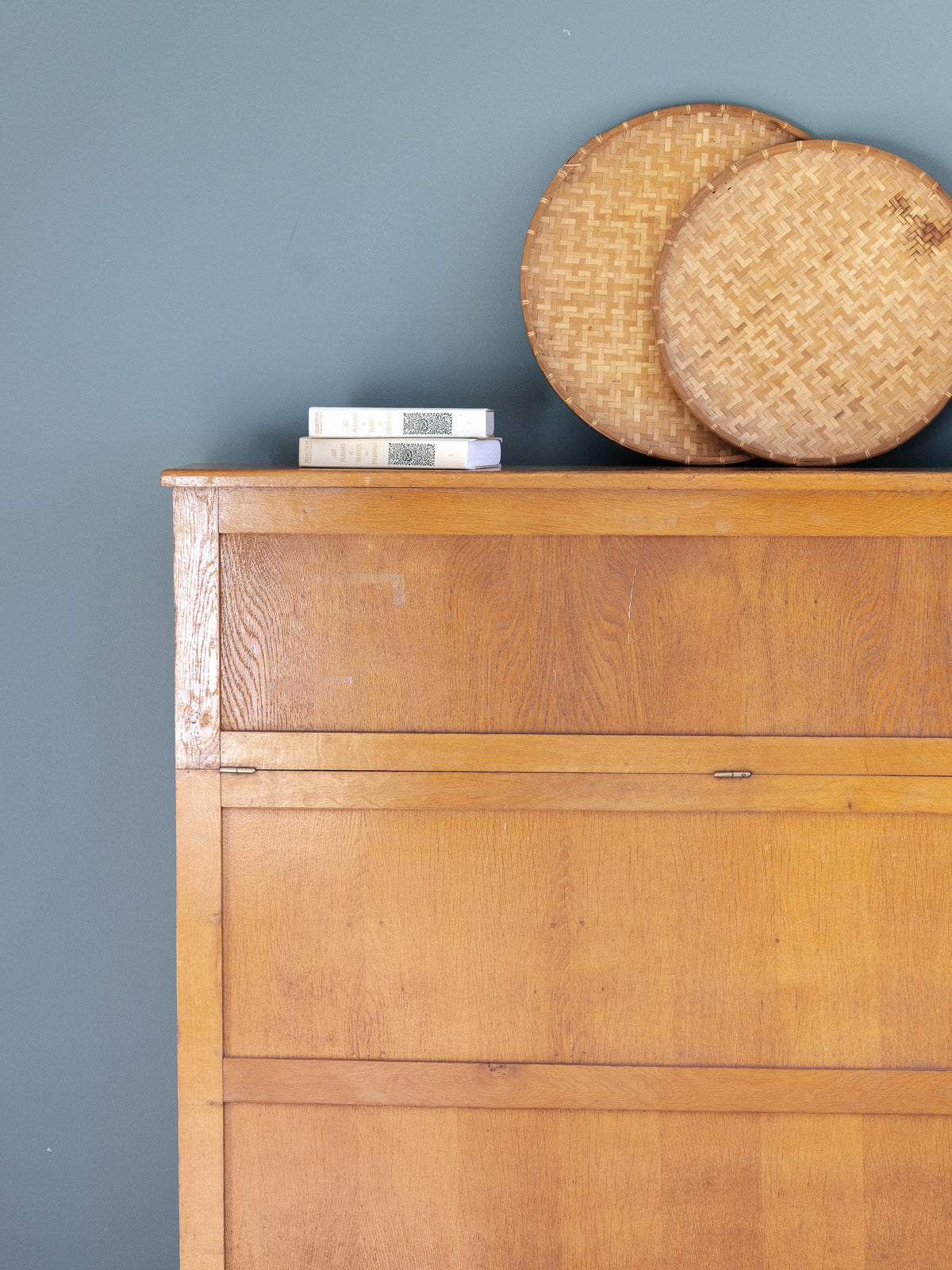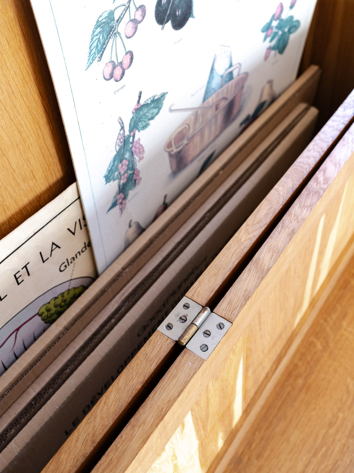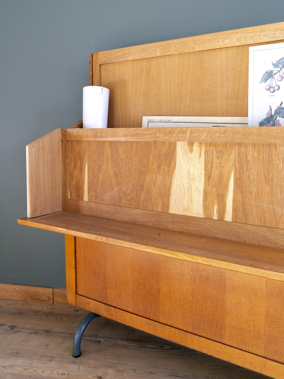 Invitez ce meuble à affiches scolaires vintage en bois, posé sur ses pieds en métal vert au charme d'école, qui apporte immédiatement une note graphique et nostalgique à votre intérieur. Son format vertical et étroit offre une large surface d'exposition pour affiches, documents ou objets, tandis que le plateau supérieur s'ouvre jusqu'à mi-hauteur pour un accès pratique et modulable. Idéal en entrée, bureau ou salon pour une mise en scène authentique. Quelques marques d'usage qui font son authenticité.