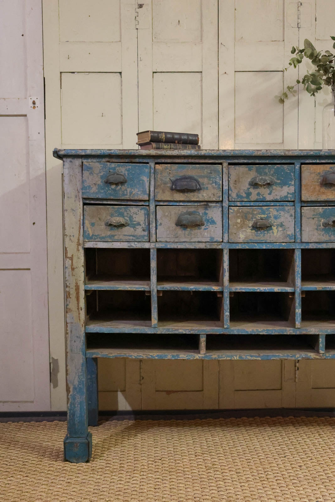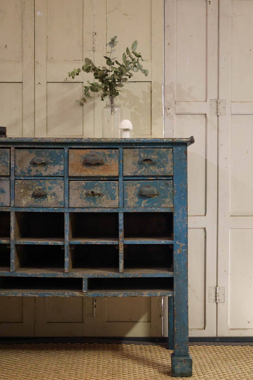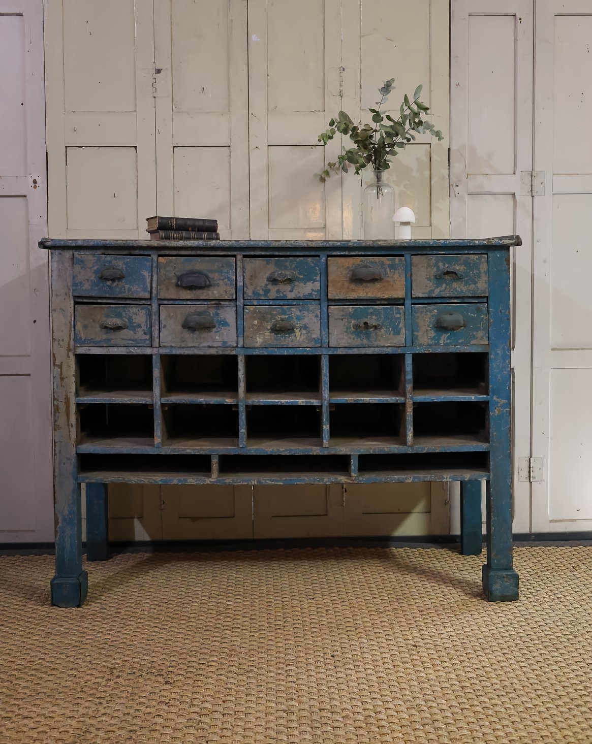 Adoptez ce meuble de métier ancien en bois à dix tiroirs au charme authentique, habillé d'une belle patine qui lui confère une présence chaleureuse et singulière. Sa silhouette élancée et sa belle profondeur offrent un grand rangement organisé pour petites fournitures, documents ou accessoires, tandis que la taille généreuse du plateau permet de l'utiliser comme console ou support de présentation. Son allure utilitaire et raffinée apportera une atmosphère atelier chic et accueillante à votre intérieur.