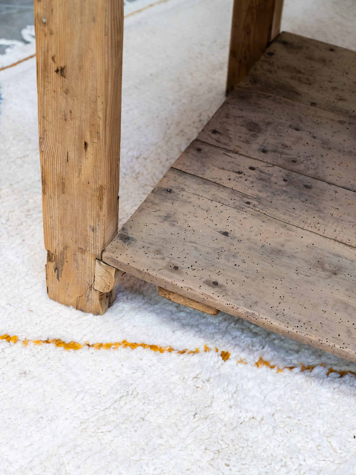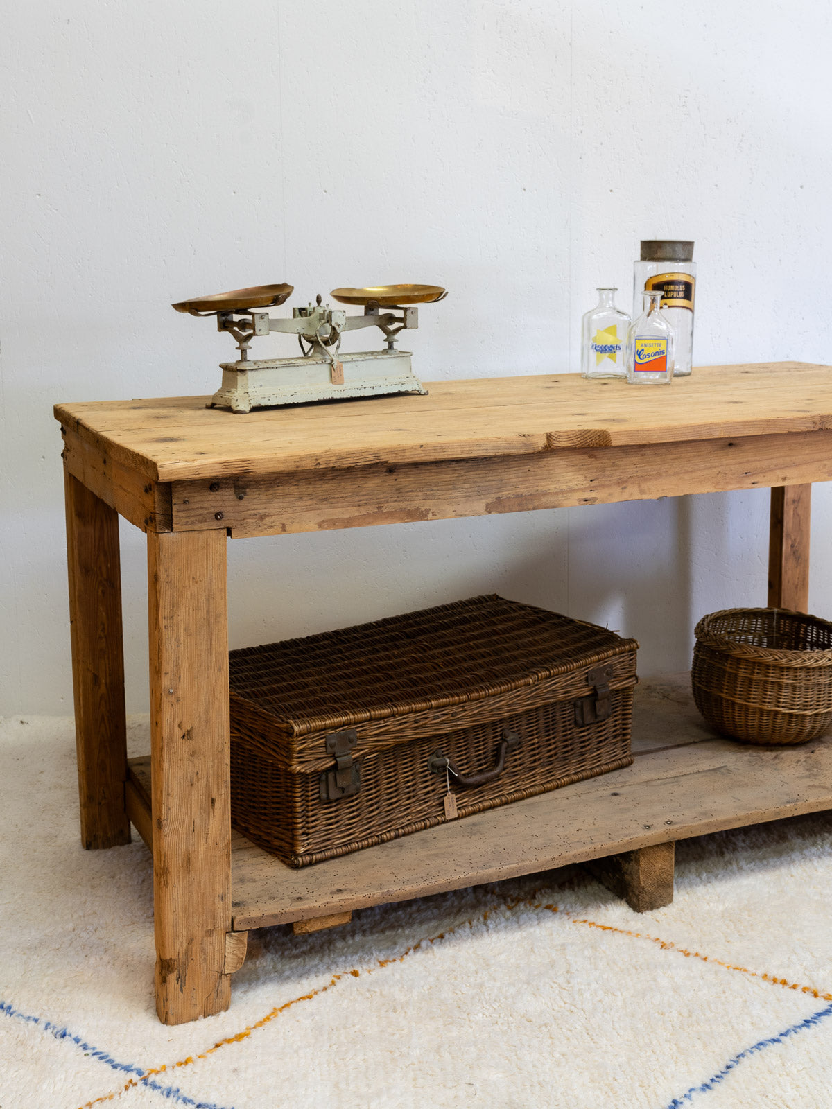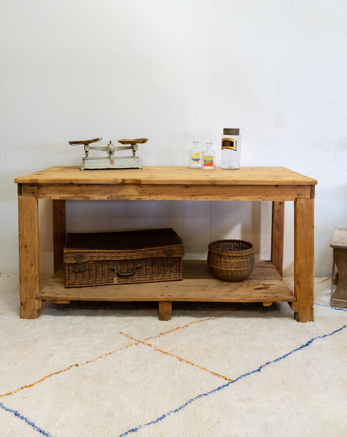 Adoptez ce meuble de métier, style établi, en bois, qui s'impose par son plateau généreux et sa silhouette caractérielle. Pensé comme un îlot ou un établi, il propose un sous-plateau et une niche pratique pour organiser ustensiles, accessoires ou petits appareils. Sa patine et son bois chaleureux créent une atmosphère conviviale et authentique, idéale pour une cuisine, un atelier ou un espace de création. Plusieurs traces du temps et d'usure qui racontent son histoire.