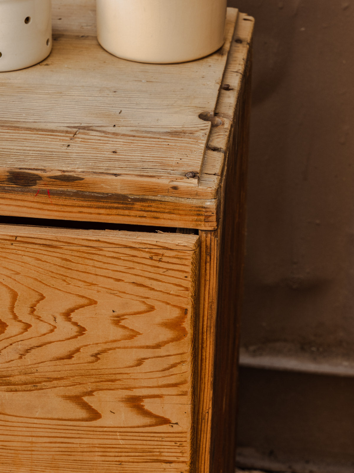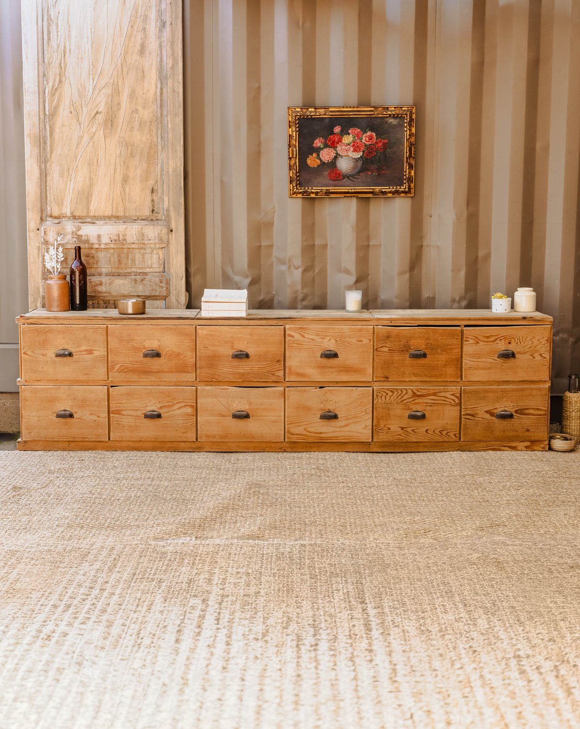 Apportez ce meuble de métier en bois à douze tiroirs, qui structure élégamment un atelier, une entrée ou un salon. Certains tiroirs proposent deux compartiments — d'autres restent simples — offrant un rangement adaptable selon vos besoins, tandis que les poignées métalliques d'origine soulignent son caractère authentique. Sa patine naturelle et son bois massif créent une atmosphère chaleureuse et inspirante. Quelques marques d'usage qui font son authenticité.