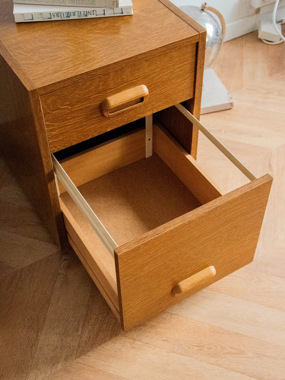 Ajoutez ce caisson de rangement sur roulettes en placage de bois foncé, au design sobre et aux poignées arrondies qui lui confèrent une élégance discrète. Ses deux tiroirs — un supérieur peu profond, parfait pour stylos et petits accessoires, et un inférieur plus profond pensé pour dossiers et fournitures volumineuses — organisent le bureau avec efficacité. Compact et mobile, il se glisse sous un plan de travail ou accompagne un espace de travail pour une ambiance chaleureuse et structurée.