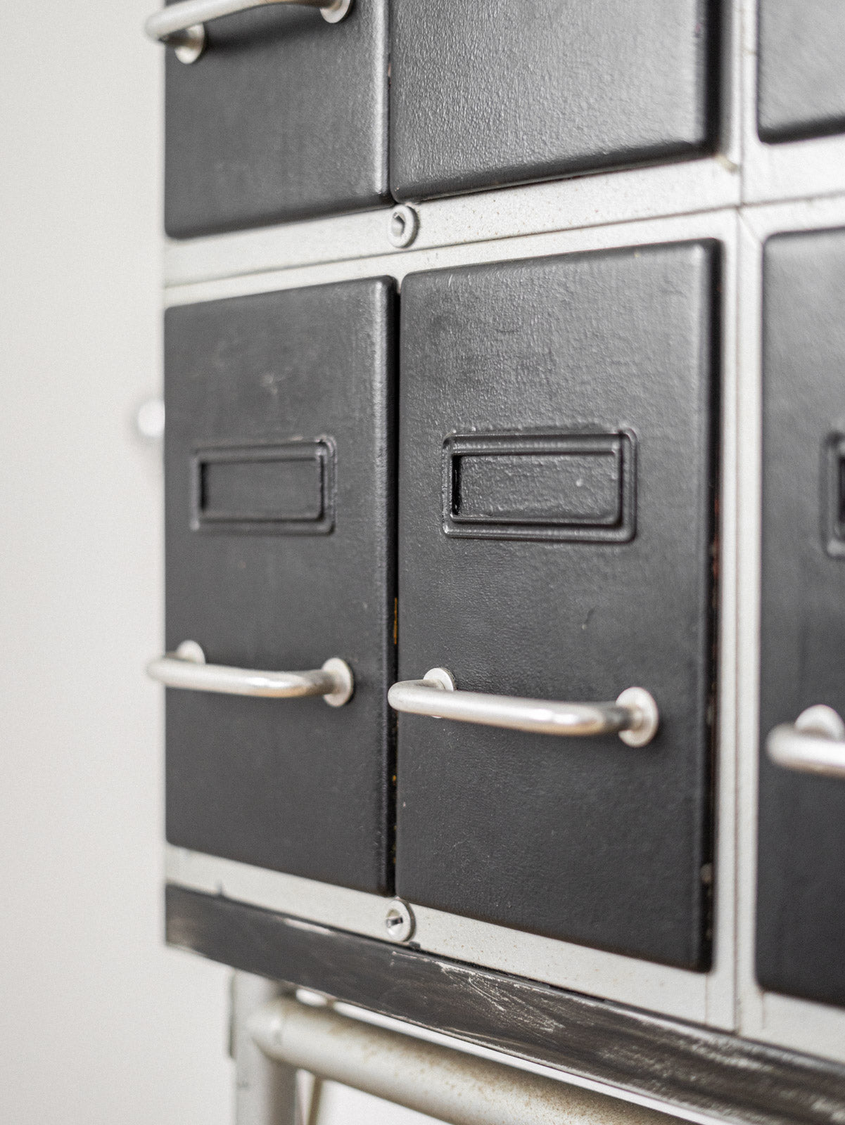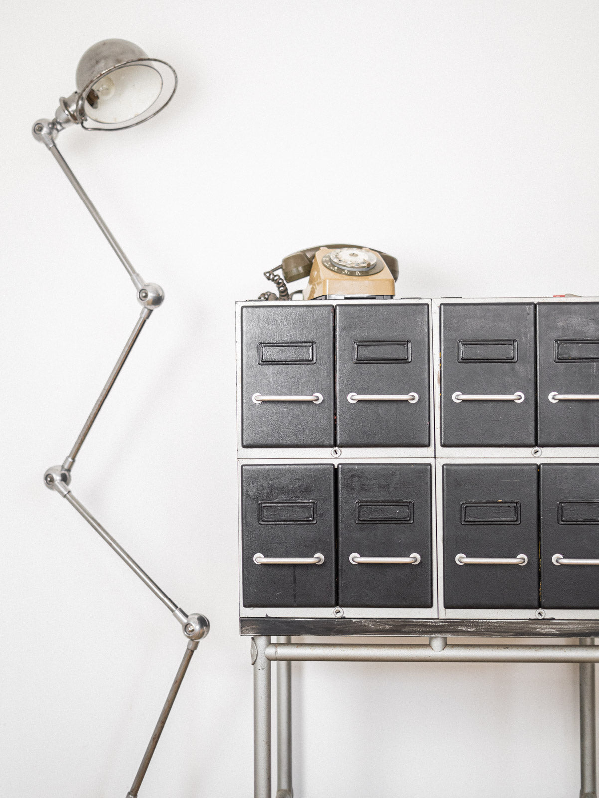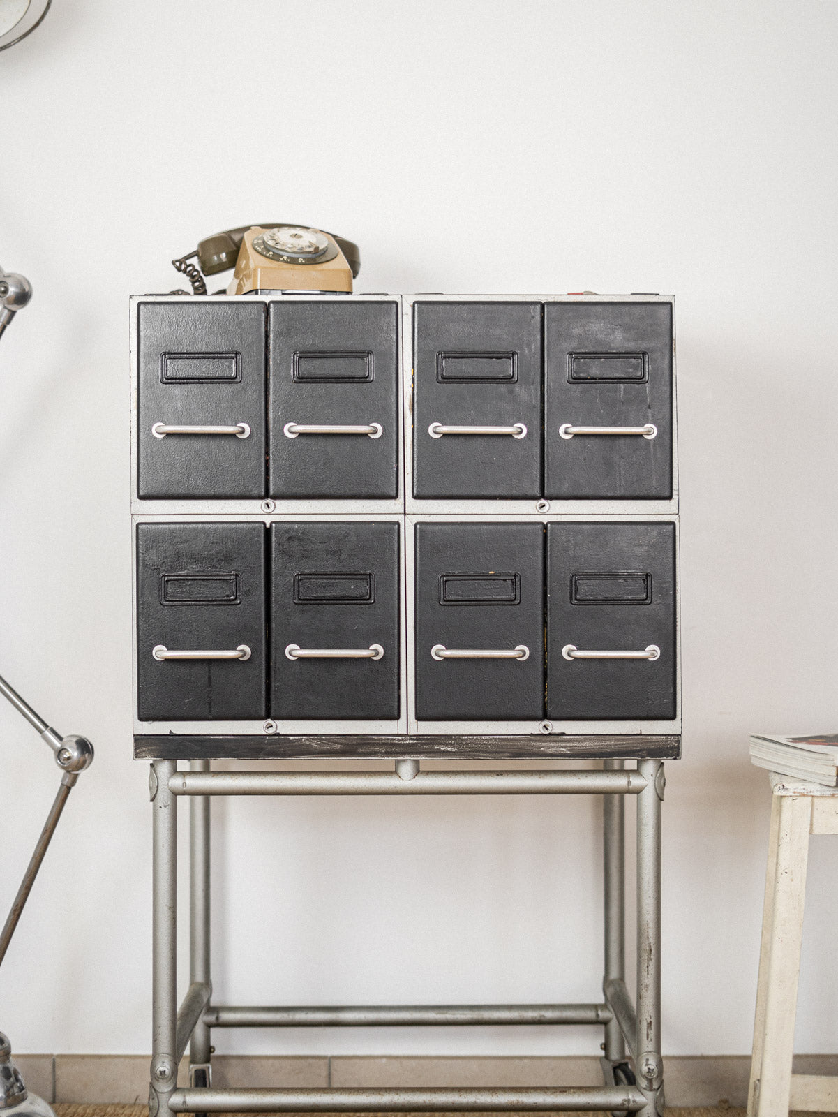 Apportez une touche industrielle à votre espace avec ce meuble de métier en métal, astucieusement conçu avec huit casiers répartis sur quatre éléments assemblés. Ses volets en T intérieurs assurent un classement pratique, tout en ajoutant du caractère à votre intérieur. Équipé de roulettes pour un déplacement facile, ce meuble allie fonctionnalité et style, parfait dans un bureau ou un atelier. Portant les traces d’usage propres à son histoire, il témoigne de son authenticité et du charme des pièces de métier. Faites de la place pour l’organisation avec ce meuble à la fois esthétique et pratique.