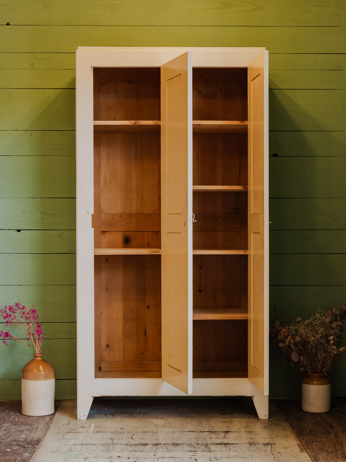 Adoptez ce vestiaire vintage restauré avec goût, peint en beige, au charme contemporain. Sa configuration intérieure, avec deux étagères à gauche et quatre à droite, offre un rangement modulable pour vêtements, chaussures et accessoires. Ce vestiaire s’intègre facilement dans une entrée ou une chambre, apportant une présence chaleureuse et originale à votre intérieur.