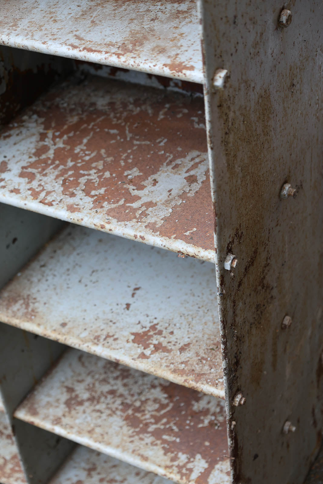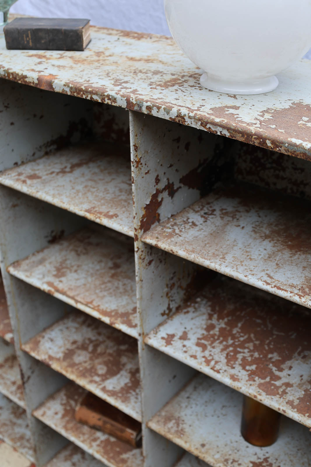 Adoptez ce meuble industriel en métal au charme brut et élégant, habillé d'une belle patine grise qui lui confère une allure sobre et authentique. Ses quinze casiers, aux proportions pensées pour accueillir petits objets et fournitures, offrent un rangement méthodique dans un format étroit et vertical, idéal pour optimiser un mur ou un coin atelier. Les boulons apparents sur chaque côté soulignent le caractère industriel et apportent un détail graphique, parfait pour une ambiance atelier contemporaine et organisée. Usures / rouille présentes.