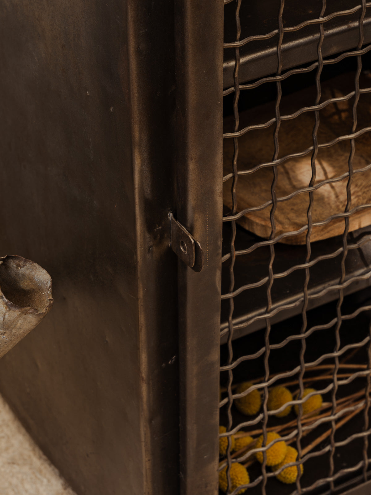 Sublimez votre intérieur avec ce meuble de métier ancien en métal gris anthracite, à l'esprit industriel, parfait pour structurer une entrée, un bureau ou un atelier. Un tiroir pratique et deux étagères dissimulées derrière un grillage offrent un rangement organisé où l'on devine facilement le contenu, tandis que sa finition mate apporte une note graphique et contemporaine. Quelques traces du temps présentes.