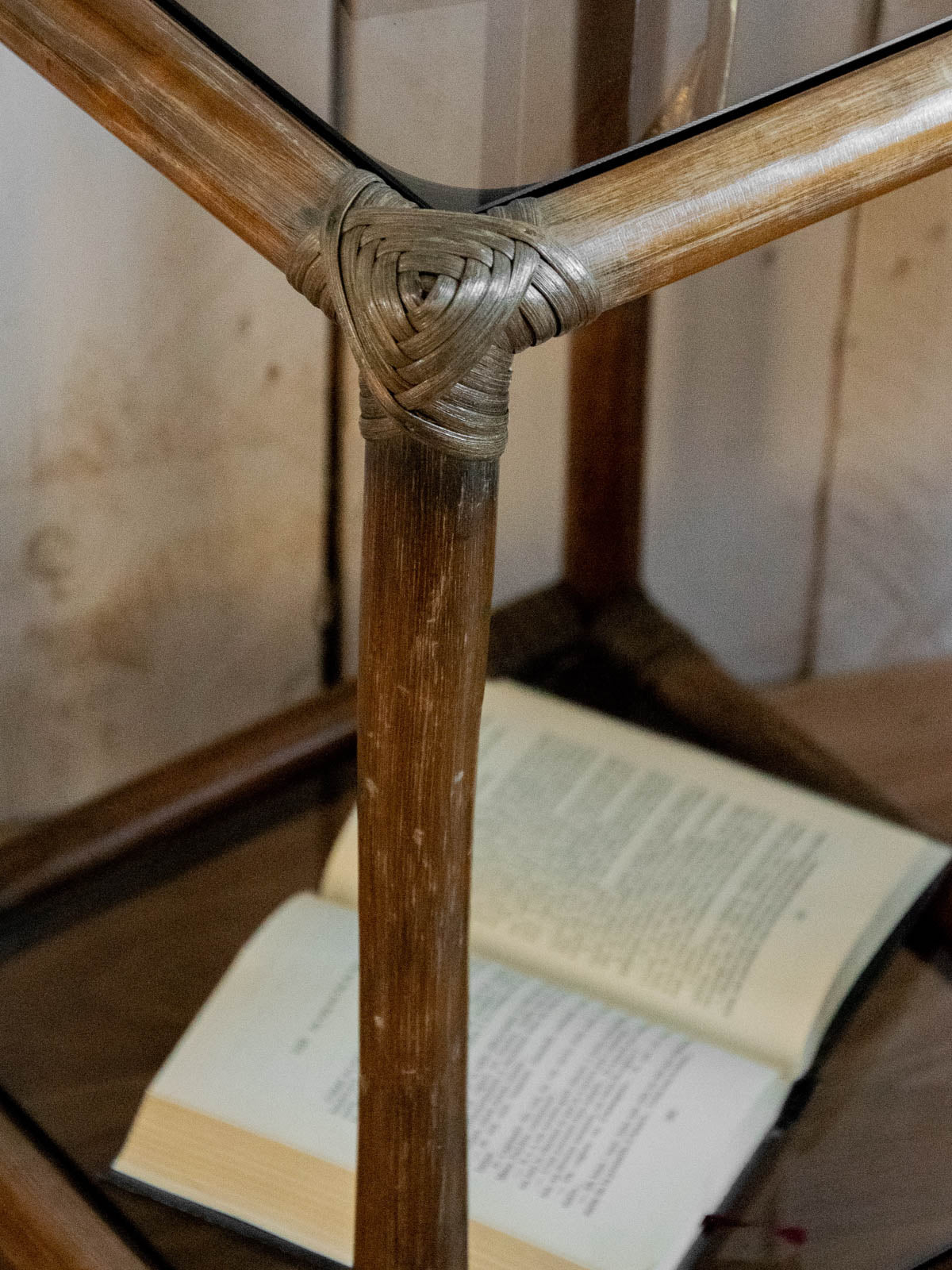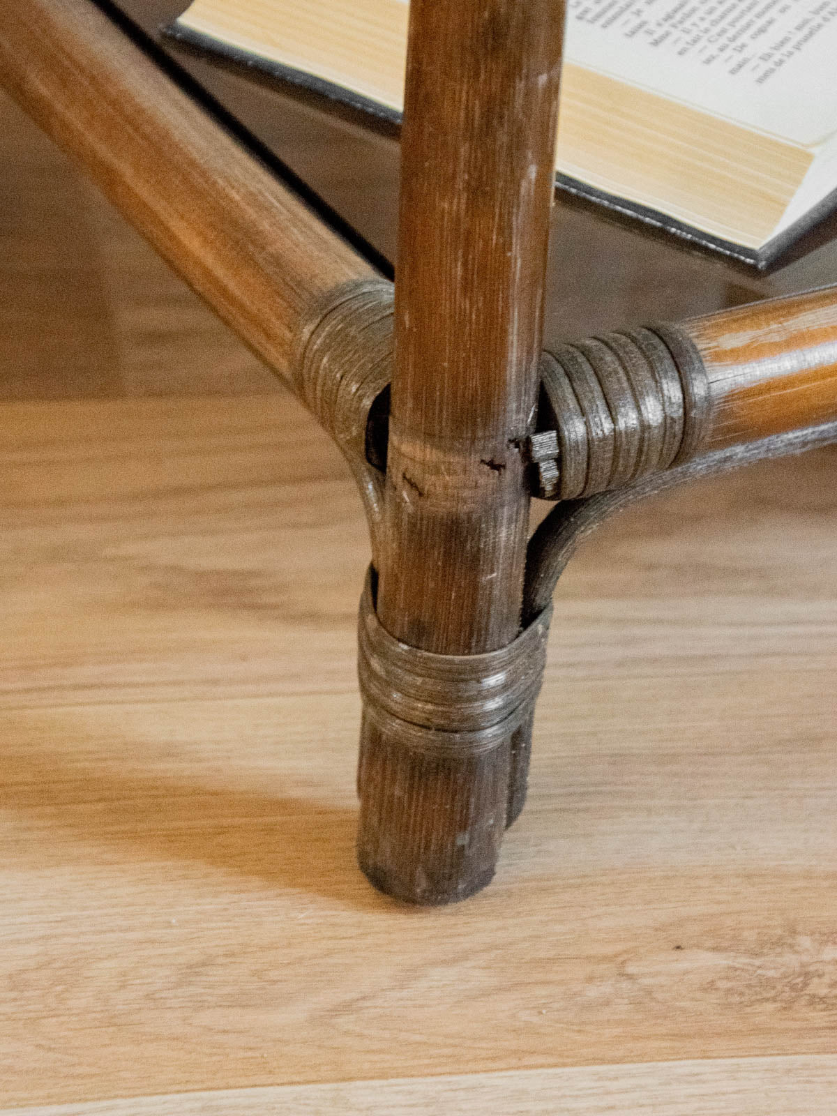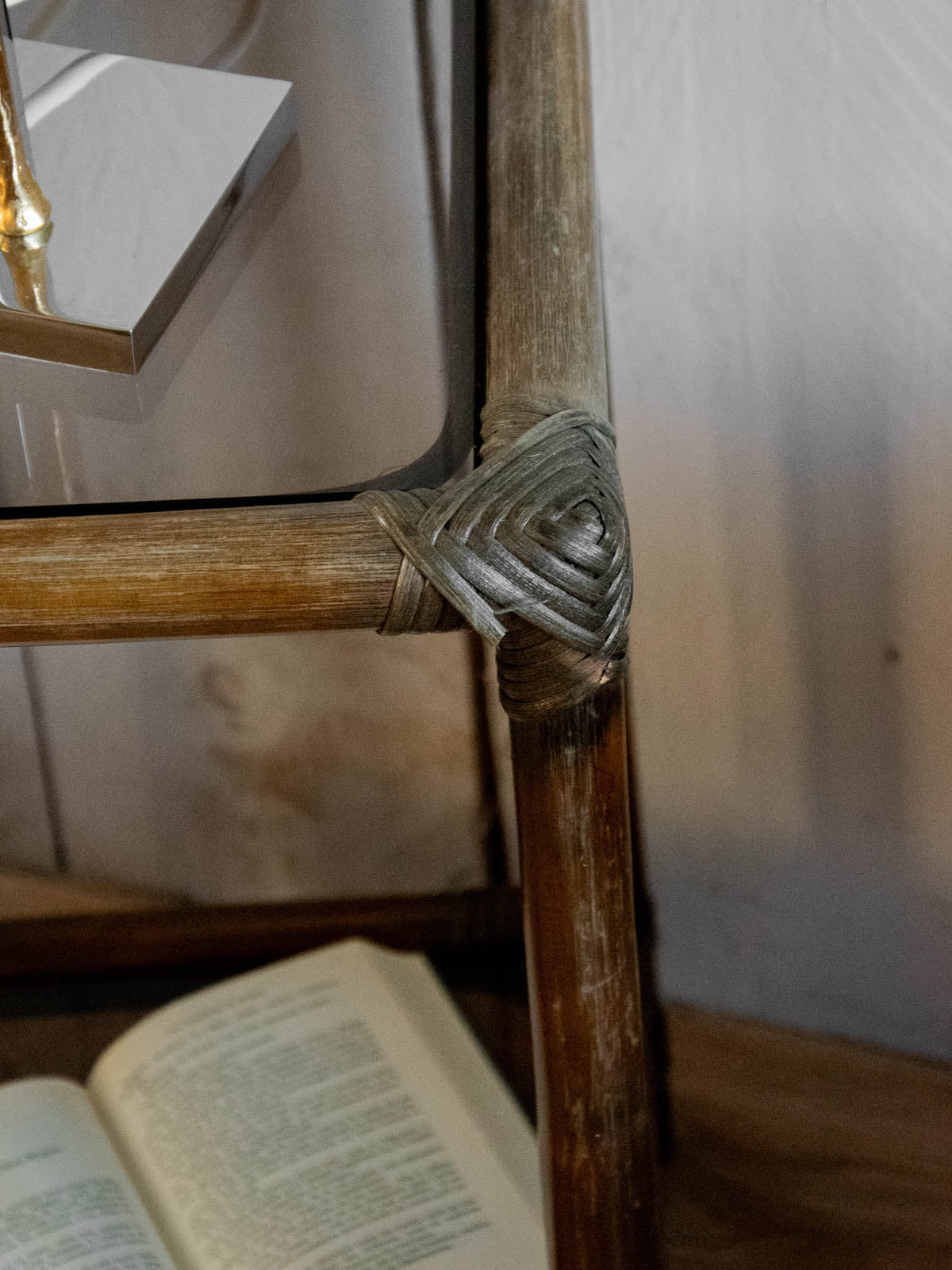 Invitez la douceur du rotin foncé dans votre intérieur avec cette étagère double niveau en bambou, agrémentée d'étagères en verre qui jouent la transparence pour mettre en valeur objets et plantes. Sa structure légère et ses proportions équilibrées offrent un rangement élégant pour livres, vaisselle ou accessoires, apportant une touche naturelle et chaleureuse à un salon ou une entrée contemporaine. Deux exemplaires disponibles, vendus à l'unité. Légères traces d'usage sur le verre.